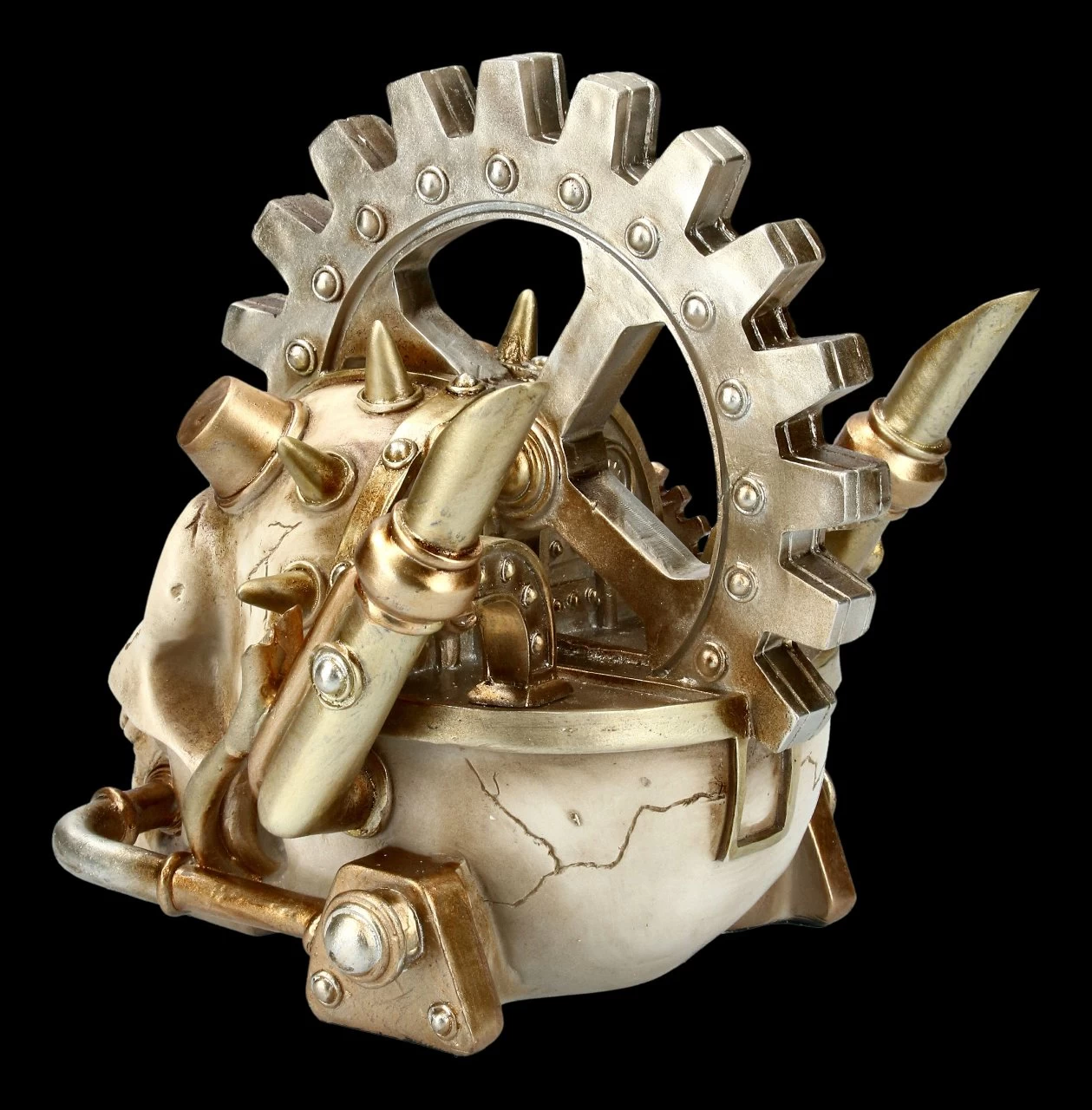 Dieser goldene Steamhead Skull zieht sofort alle Blicke auf sich. Besonders aufregend wirken die mechanischen Teile, die den Totenschädel dekorieren. Der Totenschädel stammt aus der Serie The Vault vom Hersteller Alchemy. Er wurde aus hochwertigem Kunststein (Polyresin) gegossen und anschließend handbemalt.