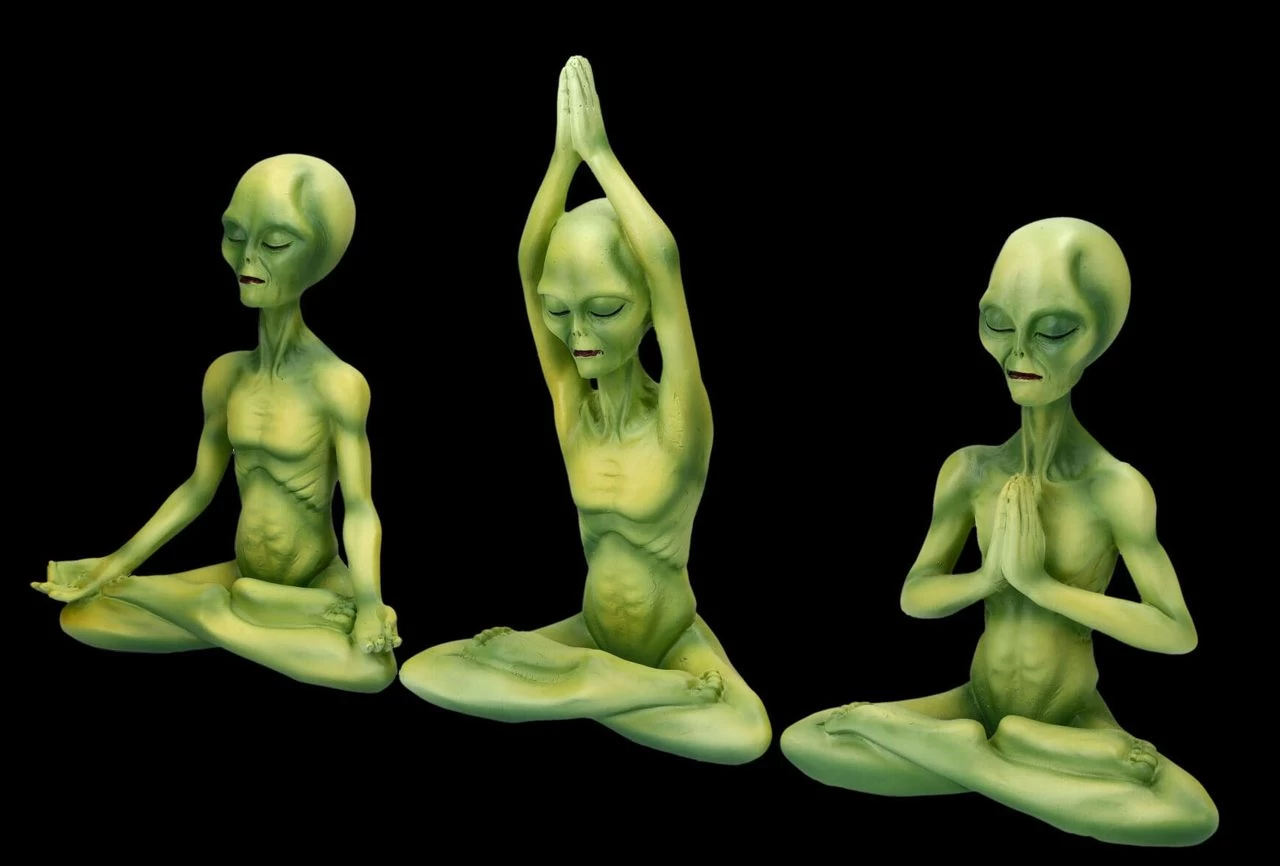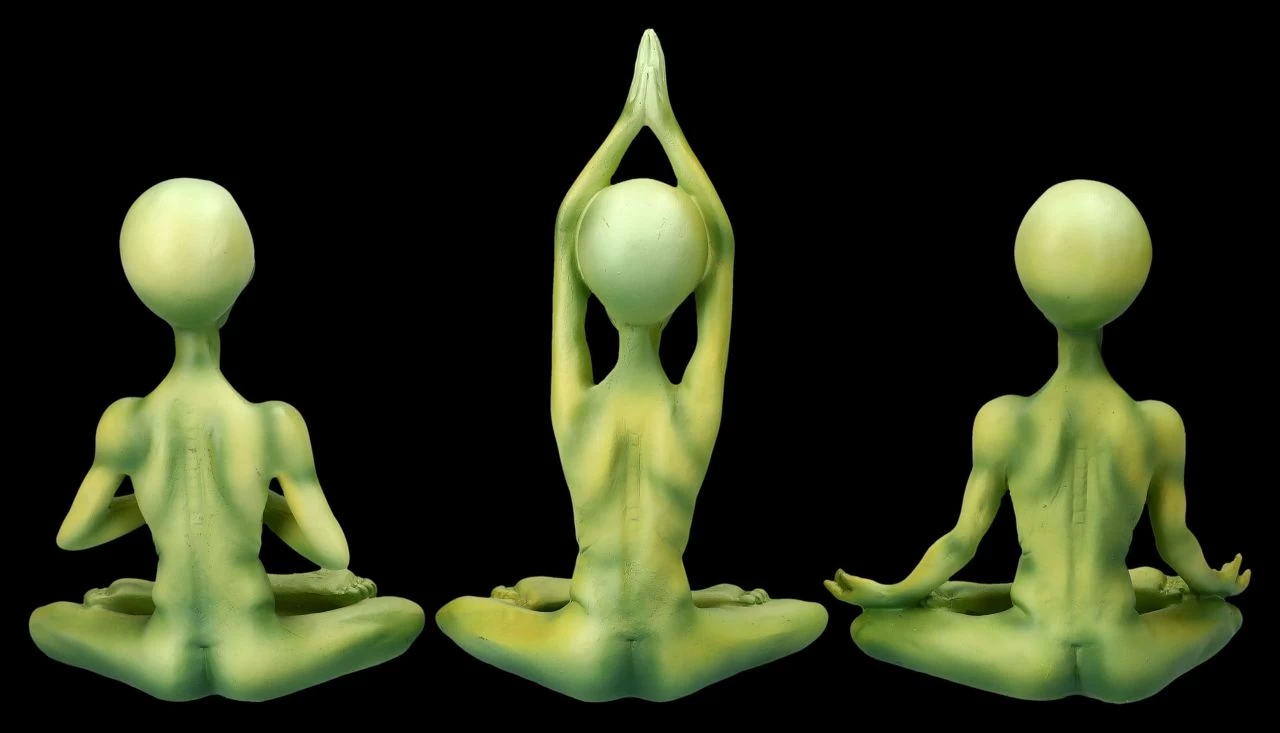 Auch mit Lichtgeschwindigkeit dauert es ewig, bis die Aliens auf der Erde gelandet sind. Also heißt es achtsam sein und sich ab und zu beim Yoga entspannen. Wenn die Menschen das schon machen, scheint es ja irgendwie zu nützen. Die 16 – 20,5 cm hohen, 12,5 – 14 cm breiten und je 6,5 cm tiefen grünen Alien Figuren beim Yoga sind aus handbemaltem Kunststein (Polyresin) gefertigt und kommen im 3er Set. Sie sind nicht nur für ein Yoga-Studio eine witzige Deko, sondern auch ein lustiges Geschenk für Alien-Fans.
