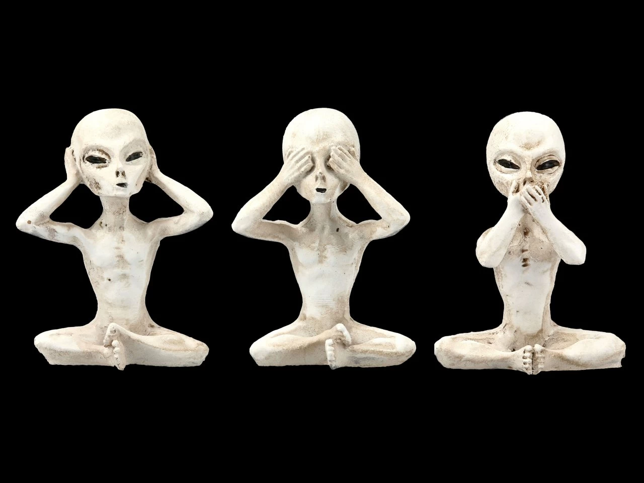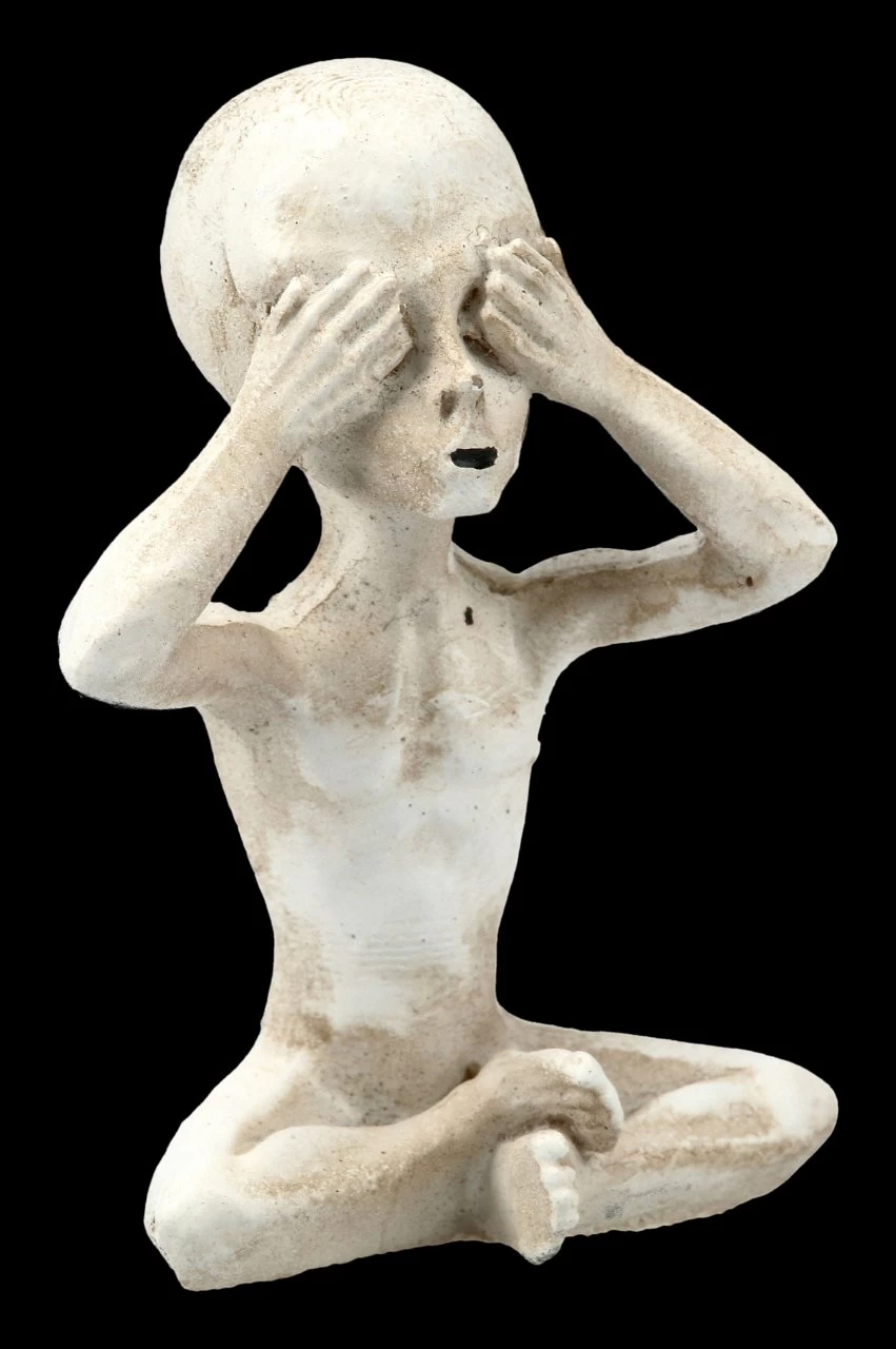 Die drei Alien scheinen doch ziemlich erstaunt zu sein, was sie auf dieser Welt vorgefunden haben. Sie haben sich im Yoga Sitz niedergelassen und zeigen, dass sie nicht bereit sind, Böses zu sagen, zu hören oder sehen zu wollen. Sind Sie auf der Suche nach der etwas anderen Deko? Dann ist das niedliche, 5,5 cm hohe, 4 – 4,5 cm breite und 2,5 – 3 cm tiefe Alien Trio aus handbemaltem Kunststein (Polyresin) absolut perfekt.