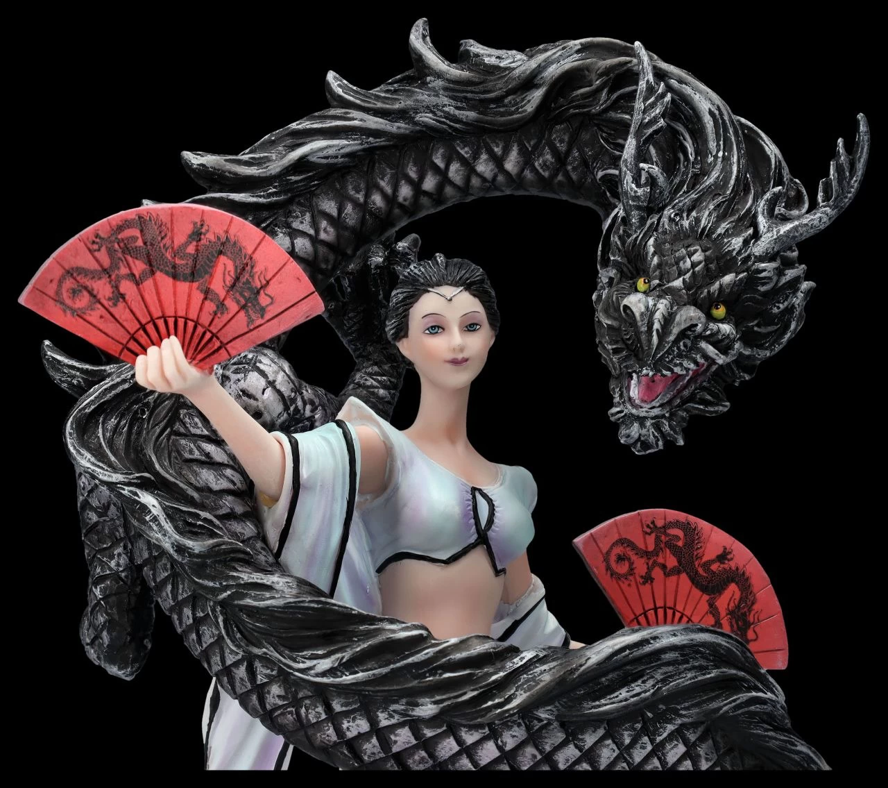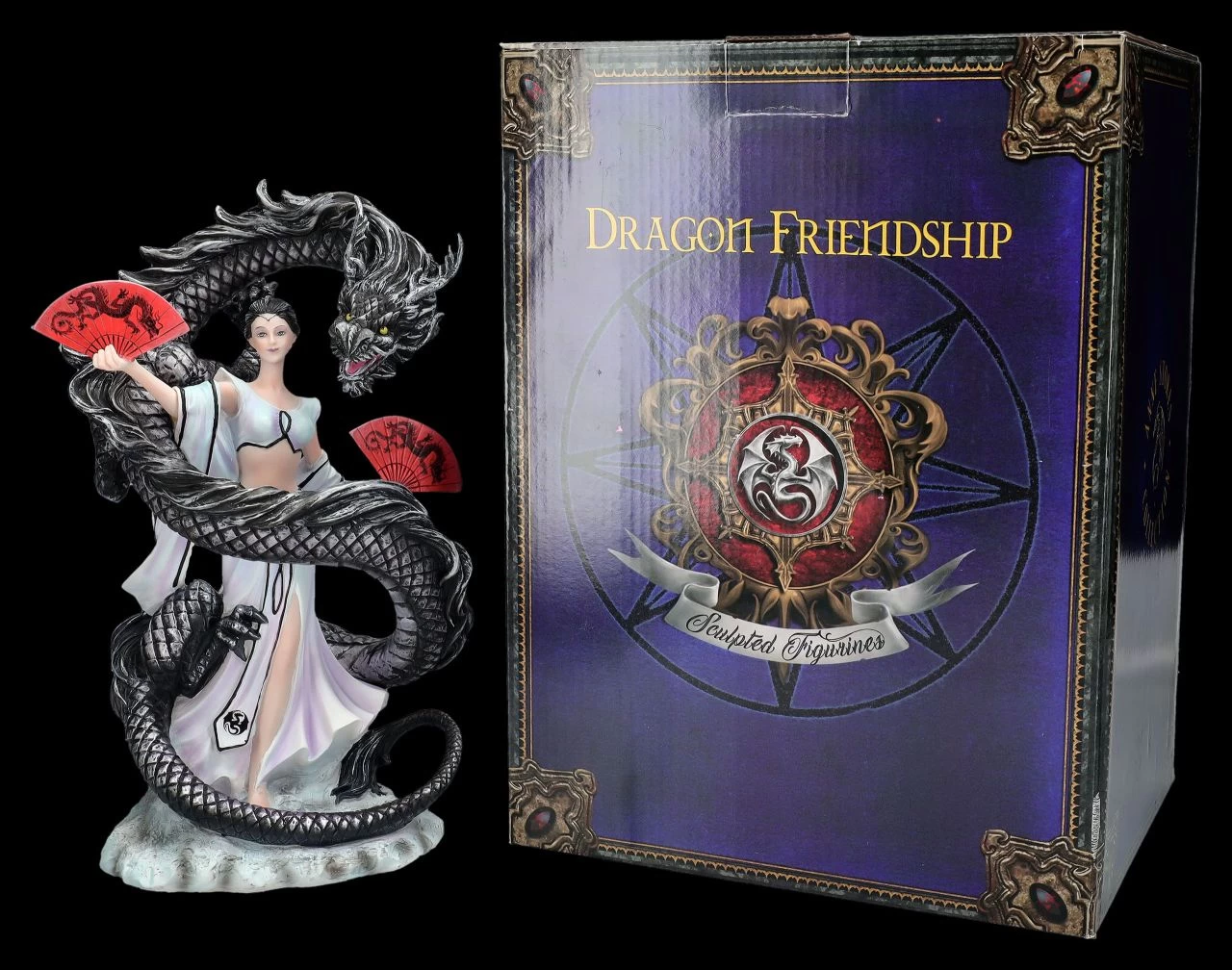 Da lässt sich der prächtige schwarze Drache nicht lange bitten, wenn er von der schönen Tänzerin aufgefordert wird, mit ihr durch die Lüfte zu wirbeln. Sanft und zärtlich hält er die in ein zartblaues Ensemble gekleidete Tänzerin umfasst. Den wirbelnden Tanz unterstreicht die Schöne durch die beiden roten Fächer in ihren Händen. Die in London geborene Fantasy-Künstlerin Anne Stokes, die für ihre fantasievollen und lebensechten Darstellungen mystischer Wesen, wie z.B. Elfen, Feen, Einhörner, Wölfen und vor allem auch Drachen in ihrer geheimnisvollen Welt berühmt ist, hat den ‚Dragon Dancer‘ bei dieser zauberhaften Figur wunderbar detailreich dargestellt. Die bezaubernde, 26 cm hohe, 17,5 cm breite und 12 cm tiefe Anne Stokes-Figur aus der Serie ‚Dragon Friendship‘ ist sehr detailreich aus Kunststein (Polyresin) gefertigt und wurde liebevoll von Hand bemalt. Der ‚Dragon Dancer‘ ist nicht nur für Sammler auch ein wunderbares Geschenk und kommt daher mit einem schön bedruckten Geschenkkarton.