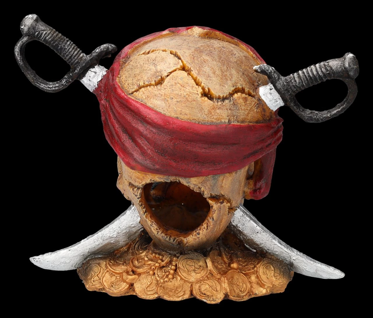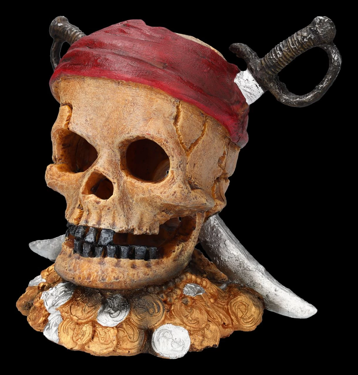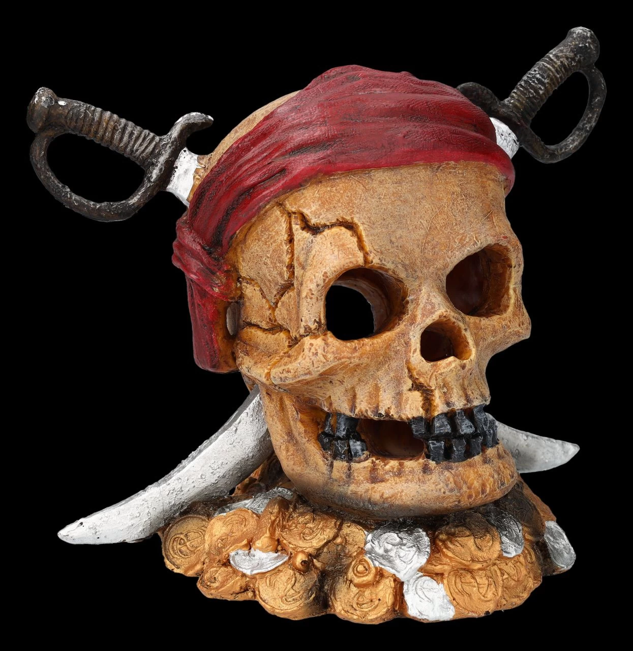 Piraten dürfen in Ihrem Aquarium natürlich nicht fehlen, wenn Sie eine interessante Unterwasserwelt erschaffen möchten. Der 19 cm hohe, 23 cm breite und 14,5 cm tiefe Totenkopf eines anscheinend einst von Säbeln getöteten Piraten wurde von Aqua Della aus hochwertigem Polyesterharz gefertigt und ist für Süß- und Salzwasser geeignet. Wenn Sie in Ihrem Aquarium eine spannende Wasserwelt erschaffen möchten, gehört dieser Piraten-Totenkopf mit den Säbeln einfach dazu. Für eine ganze Mannschaft finden Sie weitere Piraten in unserem Shop. Bitte beachten Sie aber unbedingt die Sicherheitshinweise für unsere Aquarium Figuren.