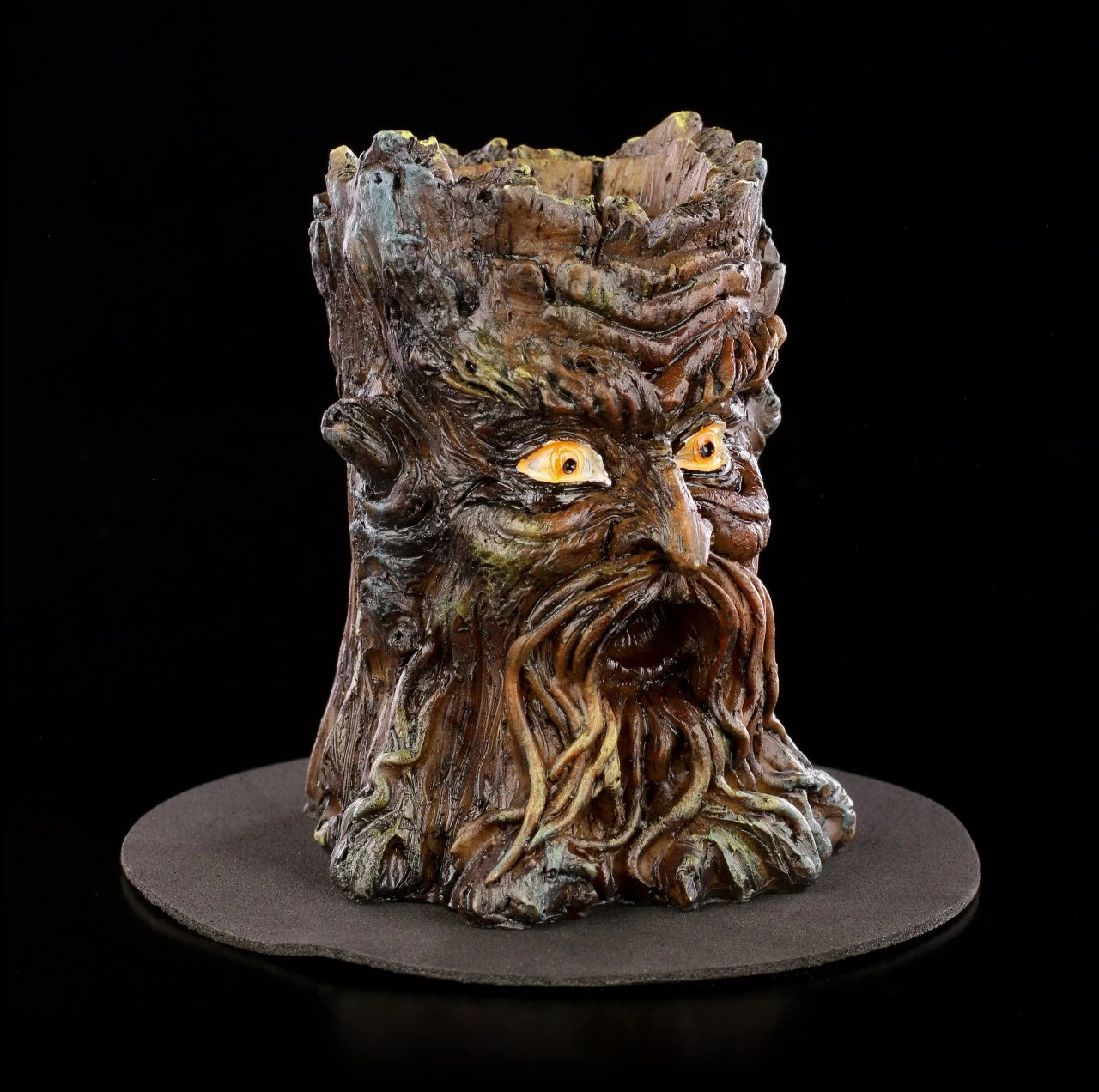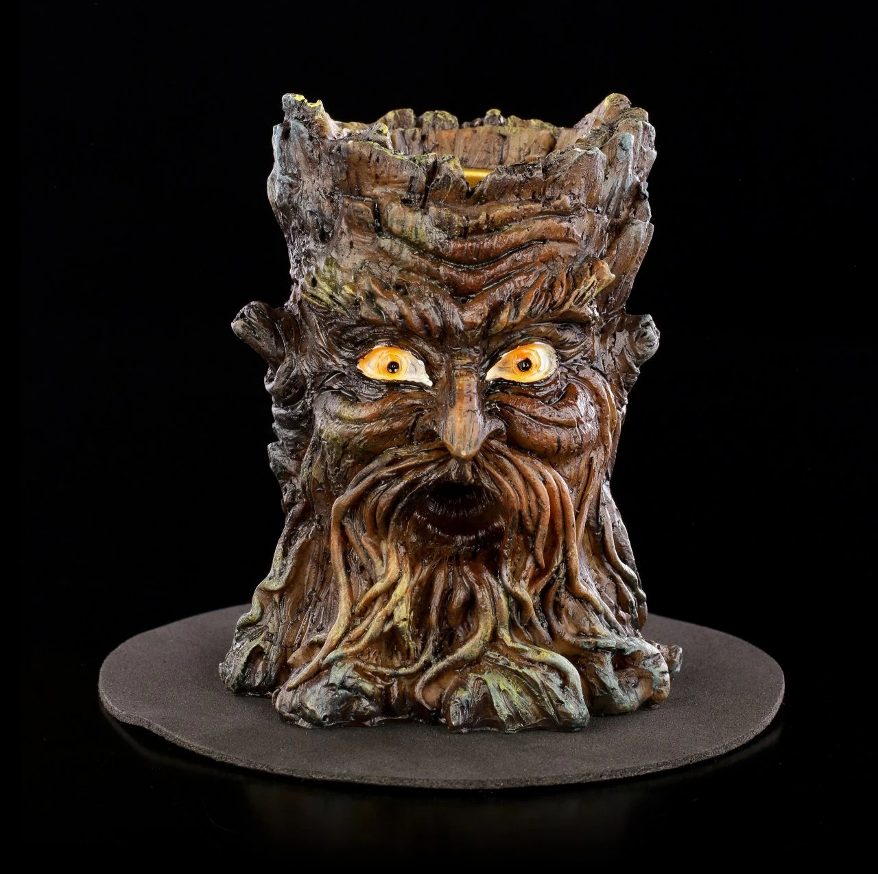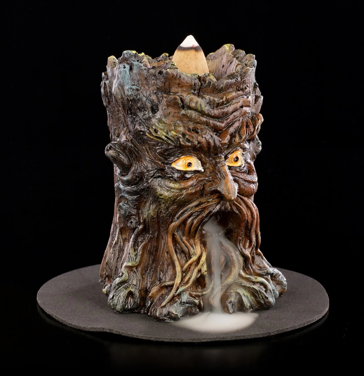 Aus dem Mund des Aged Oak fällt der Rauch des Backflow Räucherkegels. Lassen Sie sich in eine Welt der Mystik und der Magie entführen und verleihen Sie Ihrer Wohnung einen Hauch von Magie. Der handbemalte Räucherkegelhalter in Form einer alten Eiche ist aus Kunststein (Polyresin) gefertigt und ein wundervolles Dekoelement, nicht nur im Herbst.