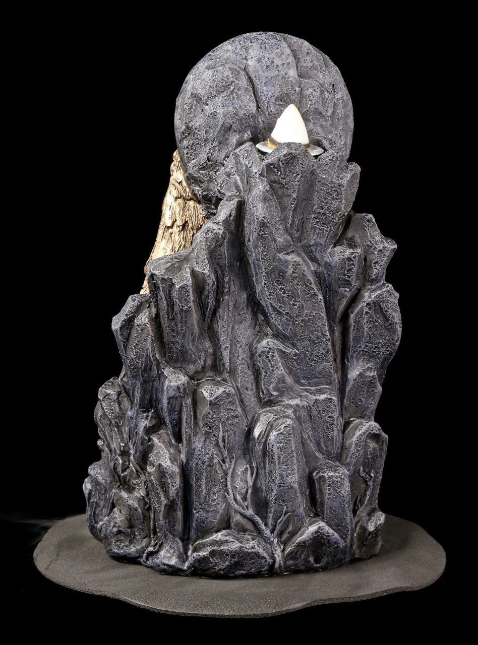 Der Räucherkegelhalter ist so ein Kunstwerk mit viel Symbolik. Bitte beachten Sie, dass dieser Räucherkegelhalter für Backflow Räucherkegel gedacht ist. Der schöne Effekt mit dem Rauch entsteht nur bei der Verwendung dieser speziellen Räucherkegel welche Sie ebenfalls bei uns im Shop erhalten. Der Rauch wabert dekorativ über den Steinthron. Um den Untergrund vor dem fallenden Rauch zu schützen, verwenden Sie bitte eine geeignete feuerfeste Unterlage.