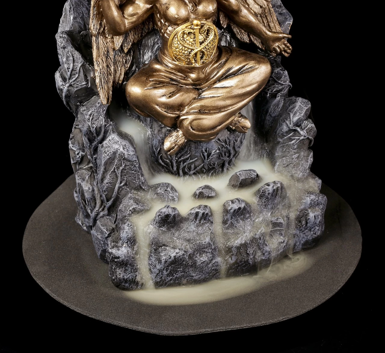 Der Backlfow Räucherkegelhalter Baphomet wurde aus hochwertigen Kunststein gefertigt und anschließend handbemalt. Dabei wurde sehr auf jedes Detail geachtet. Der bronzefarbene Baphomet sitzt im Schneidersitz auf einen grauen steinernen Thorn, der ausschaut, als ob er grob aus dem Fels geschlagen worden wäre. Die Ziegenfüße schauen aus der weiten Hose hervor.