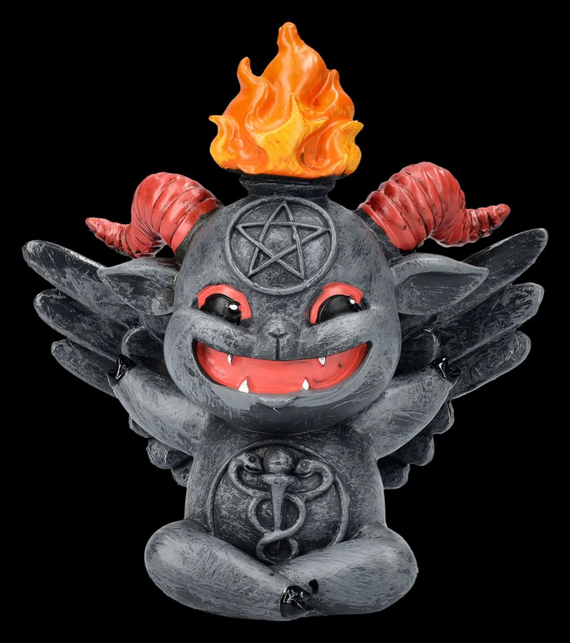 Wie der große dunkle Lord, sitzt Baphy mit ausgebreiteten Flügeln, dem Symbol auf seinem Bauch und den zum Segen erhobenen rechten Arm und den nach unten gerichteten linken Arm da. Er hat sich für die Beschwörungen bereit gemacht und schaut mit seinen großen, leuchtend roten Augen jeden etwas erstaunt an. Die witzige kleine Baphomet-Figur aus handbemaltem Kunststein (Polyresin) besticht auch durch die auffallenden roten Akzente, wie den Hörnern, dem Feuer auf seinem Kopf und den runden Augen.. Auf der Stirn trägt der 9,5 cm hohe, 8 cm breite und 5 cm tiefe Baphy ein Pentagramm als mächtiges Schutzsymbol. Dieser niedliche kleine Baphomet ist auch ein tolles Geschenk für Sammler.