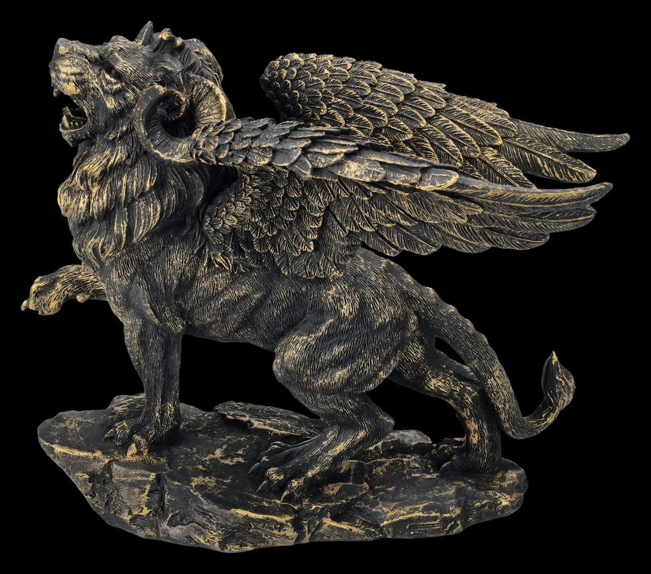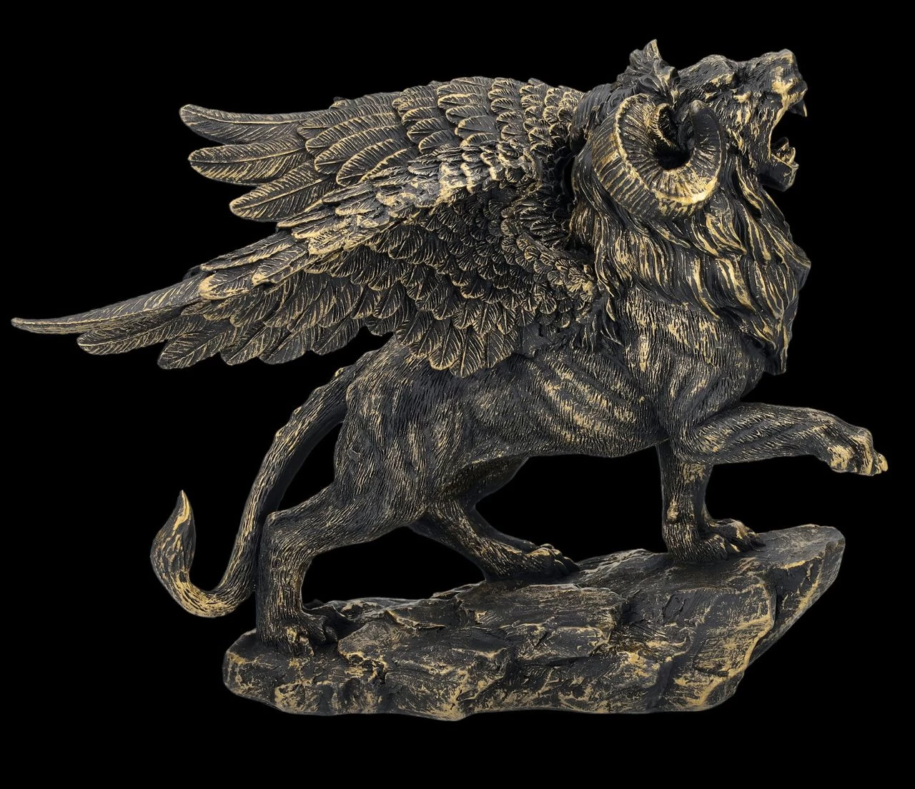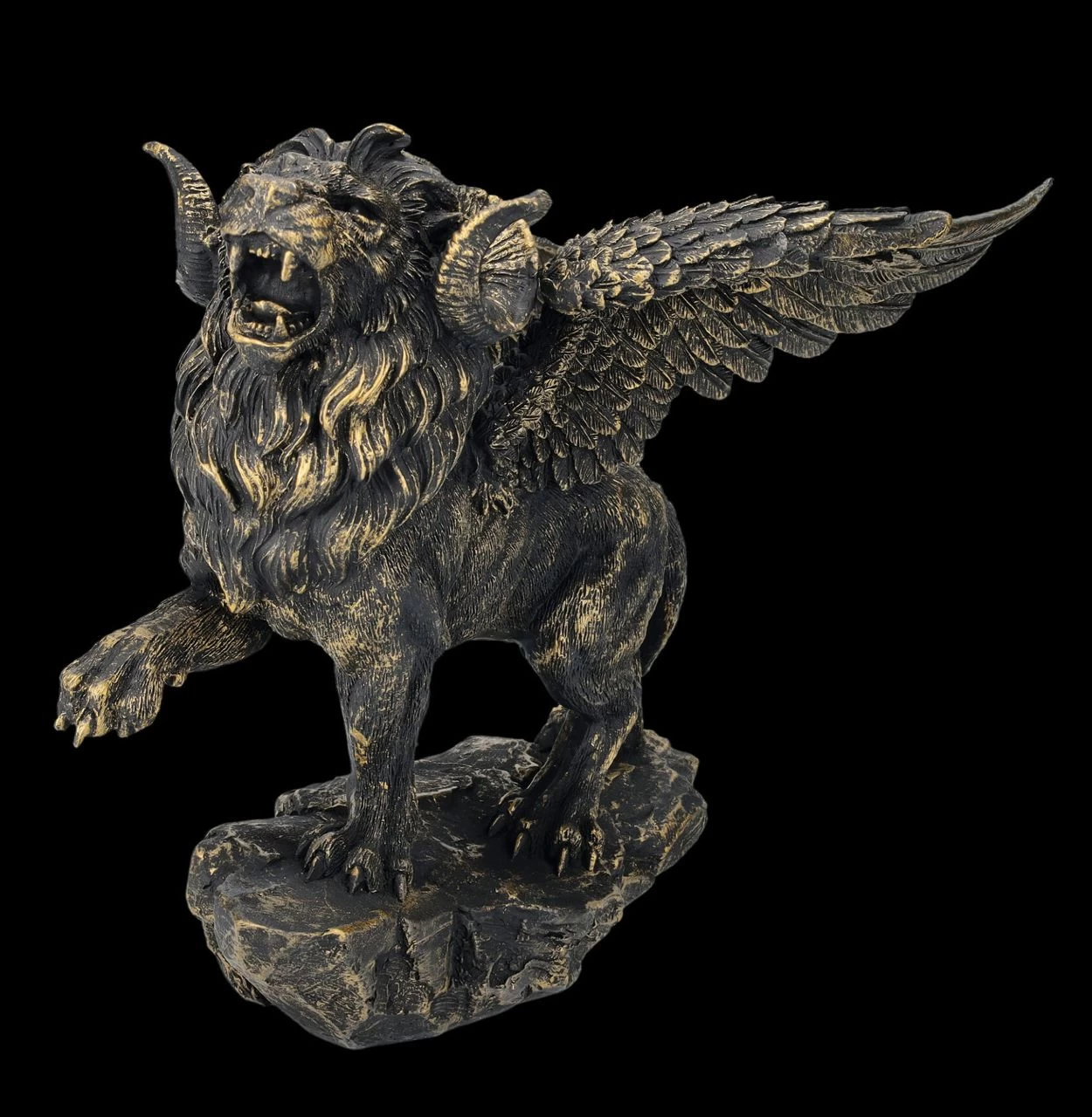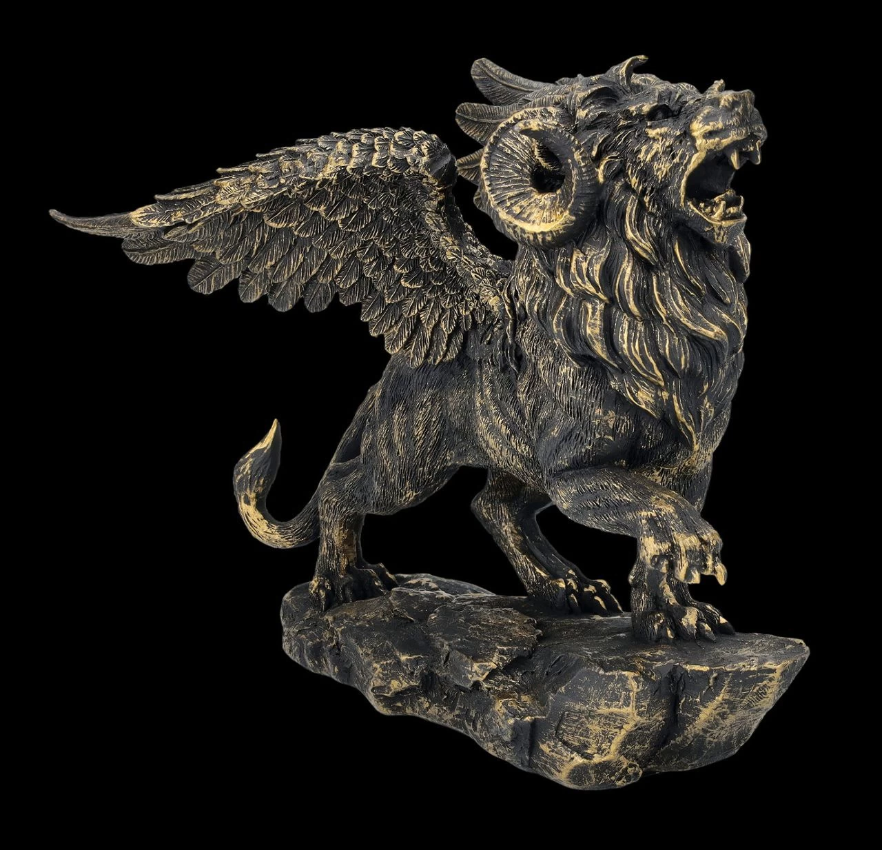 In der griechischen Mythologie wurden Chimären u.a. als Seeungeheuer mit Löwenkopf und Schwanz eines Drachen beschrieben, oder von Homer auch als feuerspeiendes Ungeheuer mit drei Köpfen. Jedenfalls ist eine Chimäre die Darstellung eines Mischwesens. Diese Chimäre mit den gefährlich aussehenden Reißzähnen hat Hörner und erinnert mit den großen Flügeln an den Löwen am Markusplatz in Venedig. Der Löwe mit Hörnern und Flügeln ist detailreich aus bronzefarben handbemaltem Kunststein (Polyresin) gefertigt. Die fantasievolle Chimären-Figur ist 16 cm hoch, 17 cm breit und 18 cm tief. Sie ist eine herrliche Deko, die auf dem Schreibtisch oder dem Sideboard sicherlich zum sofortigen Blickfang wird und ist damit auch ein fantastisches Geschenk.