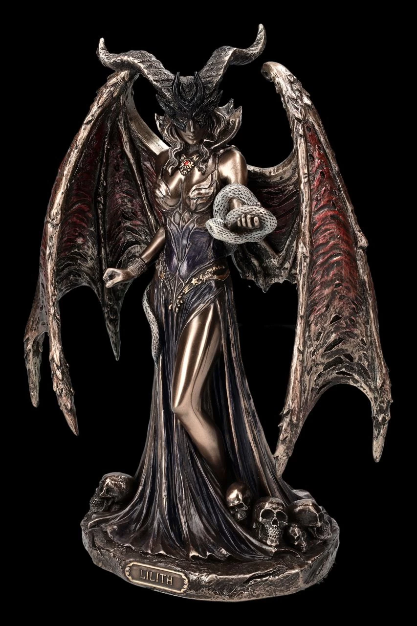 Lilith ist aus vielen unterschiedlichen Geschichten und Mythen als eigenwilliger und verführerischer weiblicher Dämon bekannt. In der Bibel wird sie – allerdings nur an einer Stelle – als erste Frau Adams erwähnt, die sich seiner selbstherrlichen Art jedoch nicht unterordnen wollte. Lilith behauptete Adam gleichgestellt zu sein, da sie aus der gleichen Erde geschaffen wurde und nicht aus der Rippe wie Eva. ‚Wer ist Lilith‘? wird auch Mephisto von Dr. Faust gefragt und Goethe lässt ihn antworten: ‚Adams erste Frau‘. Aber bereits 2000 v.Chr. sind mittlerweile Darstellungen der geflügelten Lilith als sumerische Göttin, die im Stamm des Weltenbaumes lebte, bekannt. Einheitlich ist allen Erzählungen, dass Lilith die allererste Frau der Welt war. Die Schlange, die diese wunderbare Dämonen-Figur aus der Studio Collection von Veronese auf ine Abbildung der Lilith trägt, gibt es bereits bei der Abbildung der sumerischen Göttin. Sie ist jedoch als Schlange der Verführung auch aus der Bibel bekannt. In allen mythischen Erzählungen ist Lilith die geheimnisvolle Verführerin, aber auch ein unheildrohender geflügelter Dämon. Aber ist sie das wirklich – oder ist sie vielmehr eine selbstbewusste Frau? Die edel bronzierte und sehr zurückhaltend colorierte Dämonen-Figur ist mit der Höhe von 22,5 cm, der Breite von 19 cm und der Tiefe von 10 cm eine außerordentlich dekorative Darstellung von Lilith und ein wunderbarer Blickfang, der viele Interpretationen zulässt. Die verführerische Dämonen-Figur ist natürlich auch ein fantastisches Geschenk.