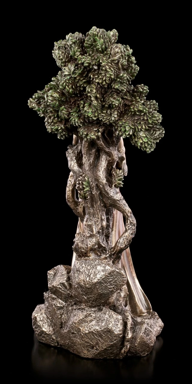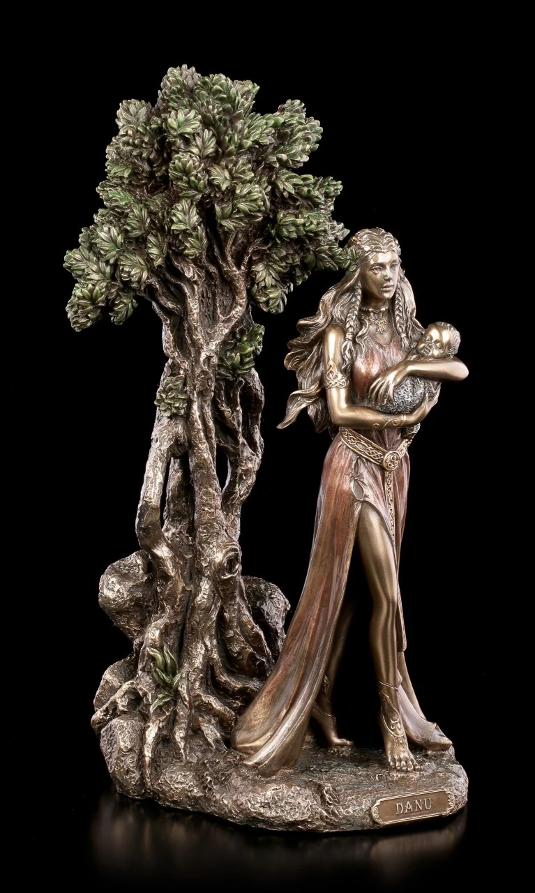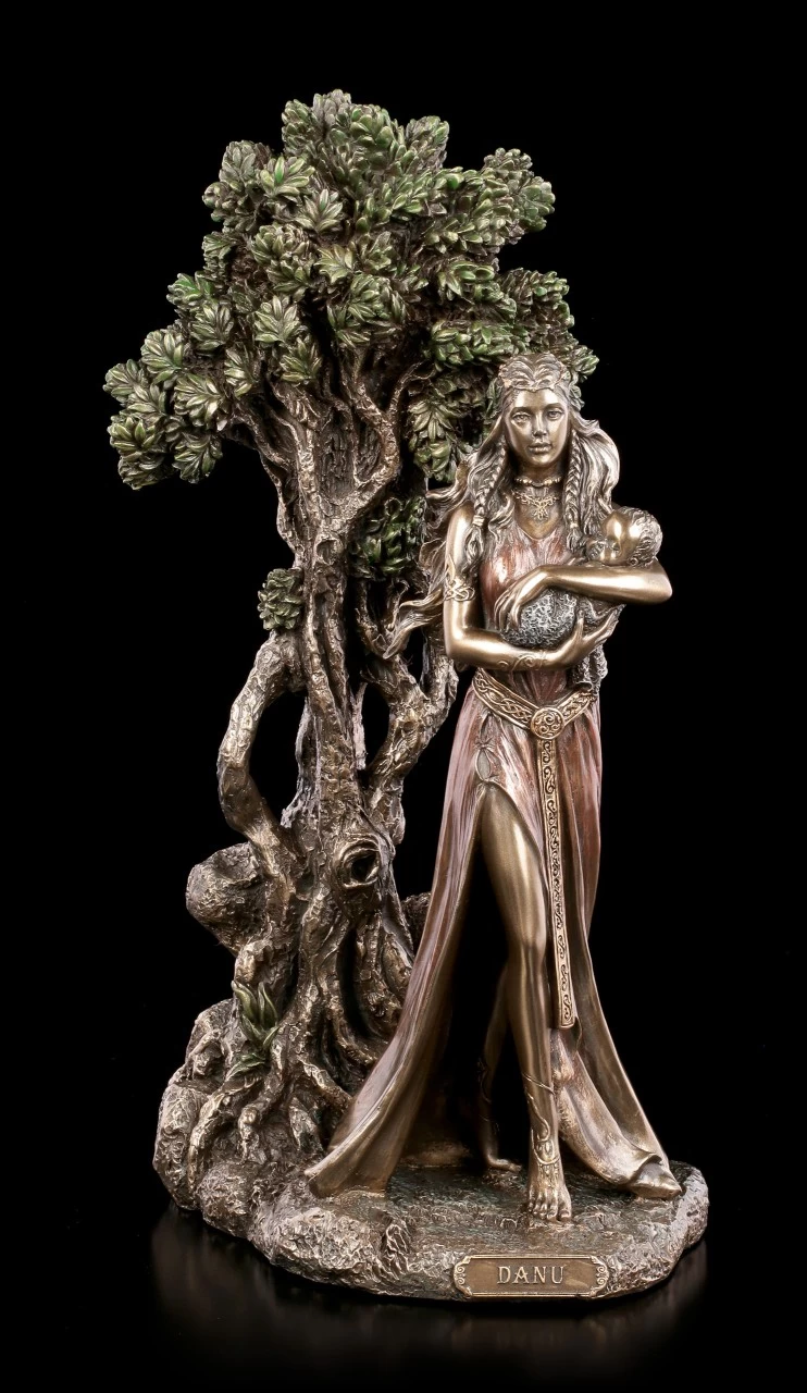 Danu ist eine der bekanntesten keltischen Göttinen. Sie gilt als die große Mutter von der alle Lebewesen und Götter abstammen . Sie ist auch  die Schutzheilige der Zauberer, der Flüsse, des Wassers und der Weisheit. Sie ist die Erde, die alles gibt und wieder aufnimmt und symbolisiert die weibliche Seite der keltischen Mythologie. Die Figur besticht durch die hochwertige und detaillierte Machart und wird durch die schimmernde Bronzierung zu einem stilvollen Blickfang in einer Wohnung.