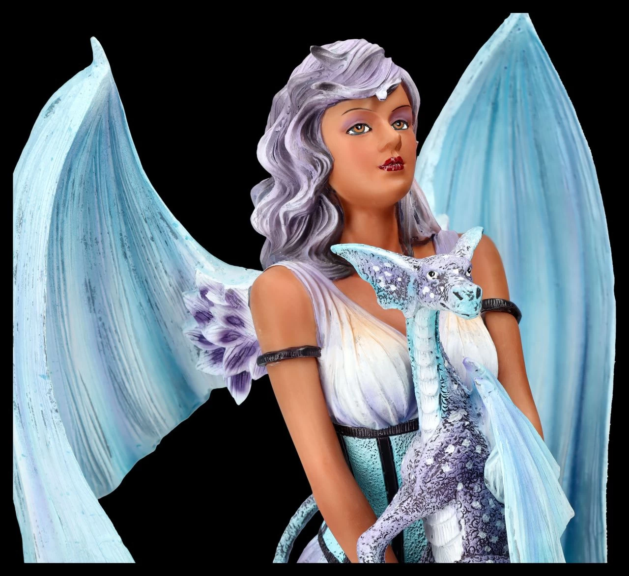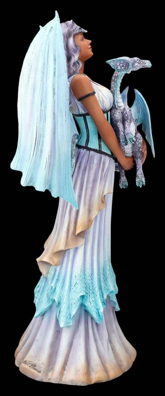 Aufrecht steht der stolze Engel da und hält den ihm anvertrauten Drachen fürsorglich in den Armen. Doch die pastellfarbene Kleidung des schönen Engels soll nicht darüber hinwegtäuschen, dass es sich um einen dunklen Engel handelt, dem man mit Vorsicht begegnen sollte – das beweisen die fledermausartigen Flügel. Die Dark Angel Figur ‚Dragon Keeper‘ der beliebten und berühmten Fantasykünstlerin Amy Brown ist detailreich aus liebevoll handbemaltem Kunststein (Polyresin) entstanden. Die Flügel des beeindruckenden, 42 cm hohen, 21 cm breiten und 17 cm tiefen dunklen Engels sind zum Stecken. Der faszinierende Engel mit dem Drachen ist nicht nur für Sammler ein prächtiges Geschenk.