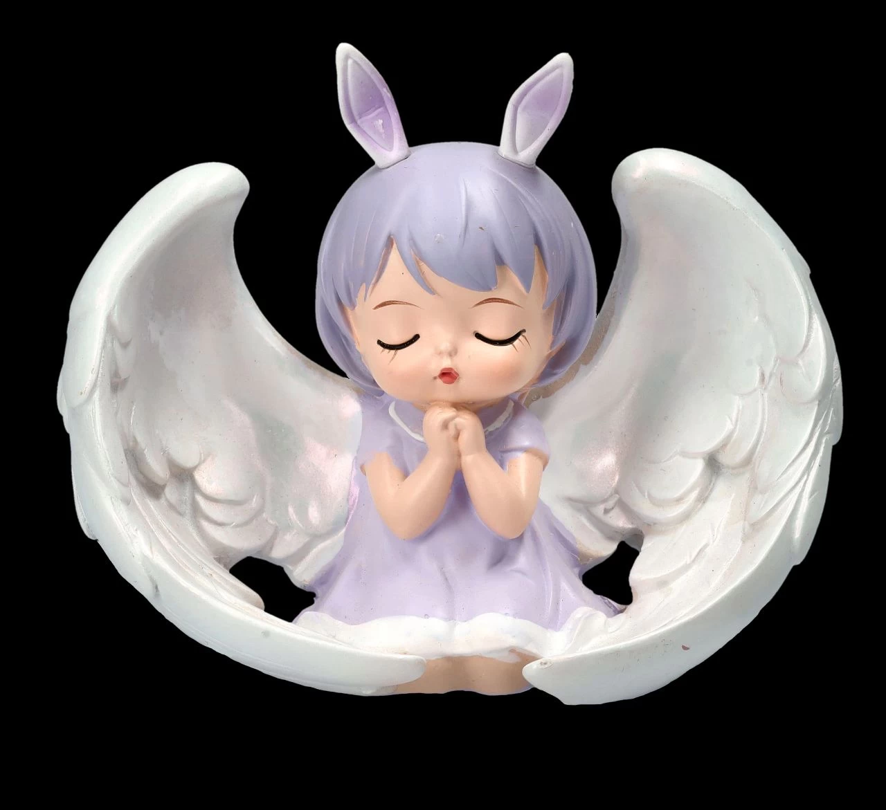 Das kleine betende Engelchen im lila Kleidchen, das eigentlich eher wie ein kleines Häschen aussieht, ist total niedlich. Versunken in ein Gebet sitzt das Schutzengelchen brav auf jedem Platz, auf den es gesetzt wird und wacht über seinen Schützling. Das 8,5 cm hohe, 10 cm breite und 5,5 cm tiefe putzige betende Engelchen mit den großen Flügeln wurde aus liebevoll handbemaltem Kunststein (Polyresin) gefertigt. Gemeinsam mit den anderen Schutzengelchen aus unserem Shop ist es eine niedliche Frühlingsdekoration und ein süßes Geschenk für alle, die einen kleinen zusätzlichen Schutzengel brauchen.