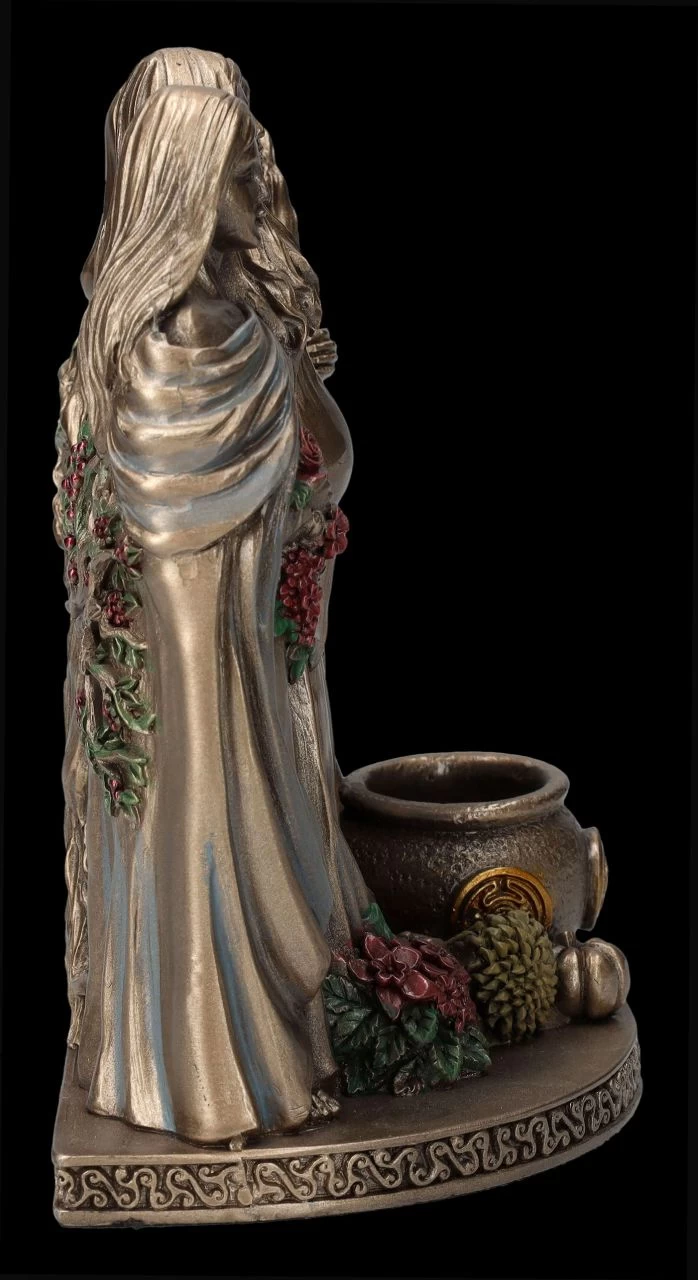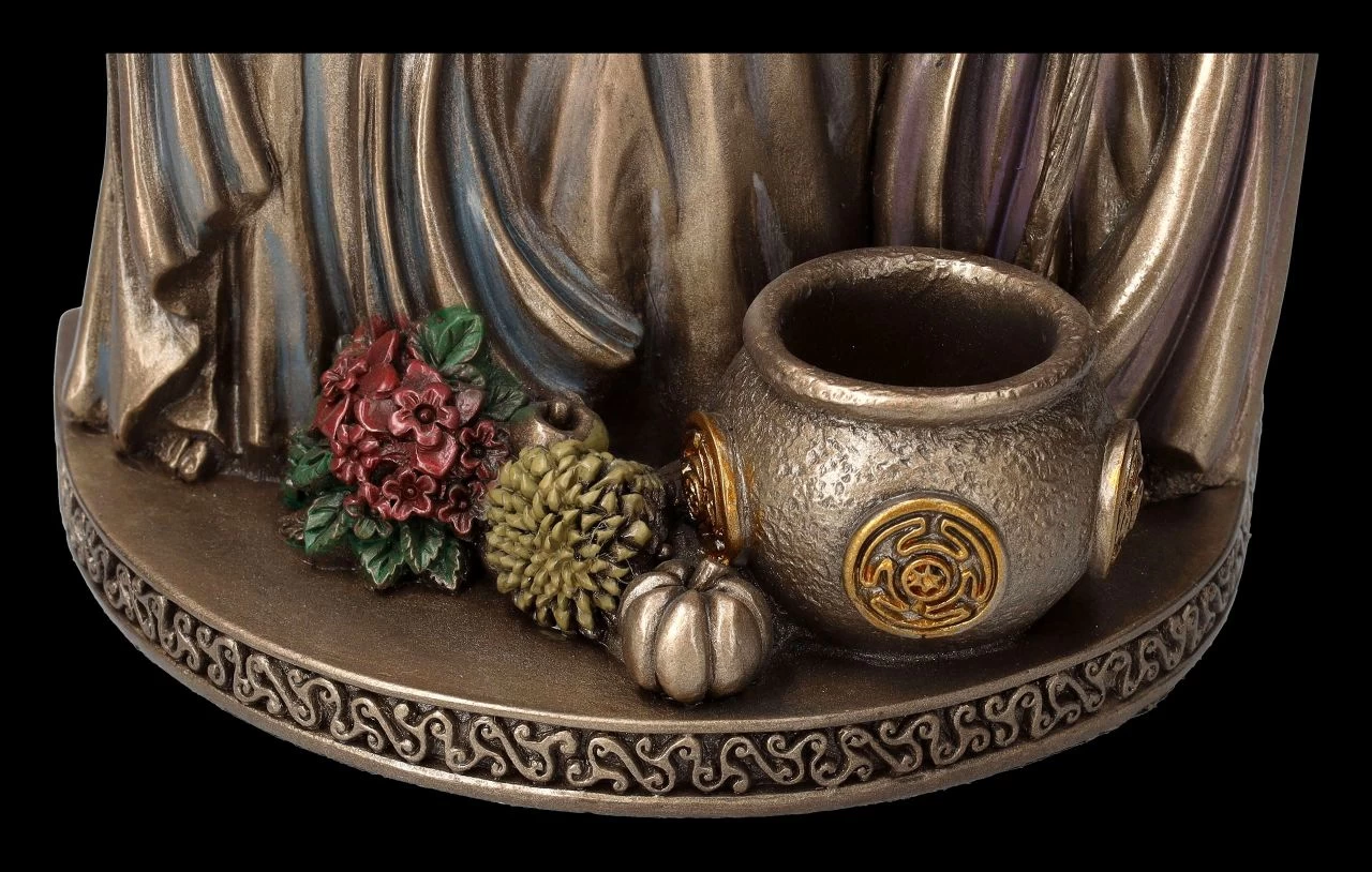 Hekate ist aus der altgriechischen Mythologie als die Göttin der Wandlung und als die Magierin unter den Göttern bekannt. Erst in späterer Zeit wird die Göttin des Wandels auch als dreifache Göttin – als Jungfrau, Mutter und alte Weise – bezeichnet. Zu den Symbolen bei den Darstellungen der Hekate gehören z.B., wie bei dieser edlen Dekofigur, auch Früchte, Blüten und Schalen. Die edel bronzierte und fein colorierte, 15 cm hohe, 12 cm breite und 8 cm tiefe Dekofigur der Hekate ist wunderbar detailreich aus Kunststein (Polyresin) gefertigt. Die Göttin als junge Frau trägt Blüten in ihren Händen und als alte Frau einen Stock, während die mittlere Figur unübesehbar und schön als Mutter dargestellt ist.