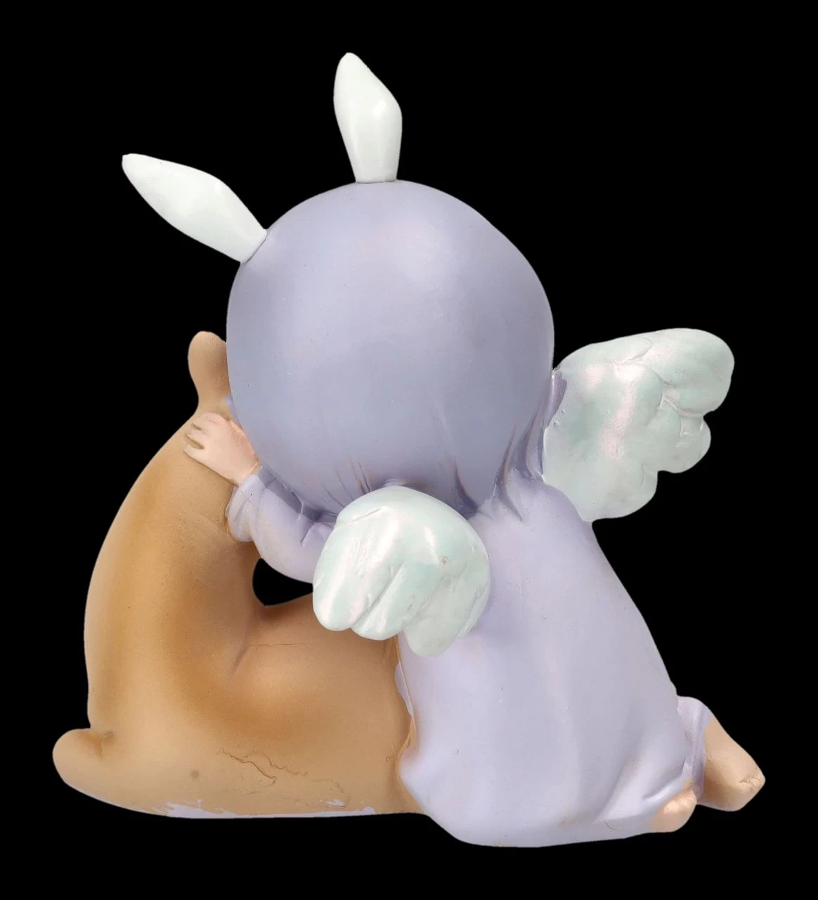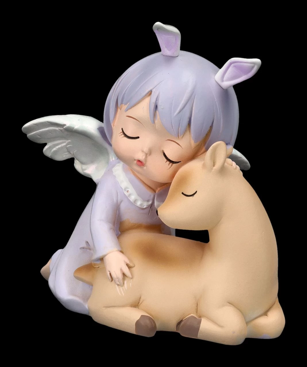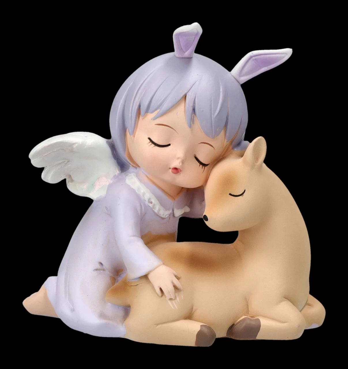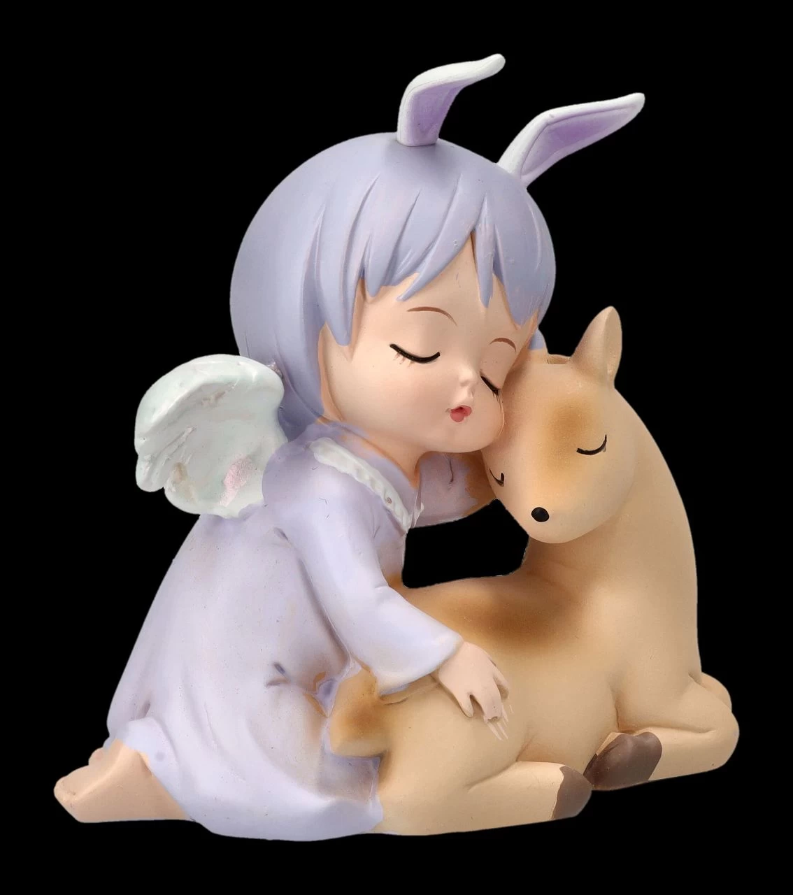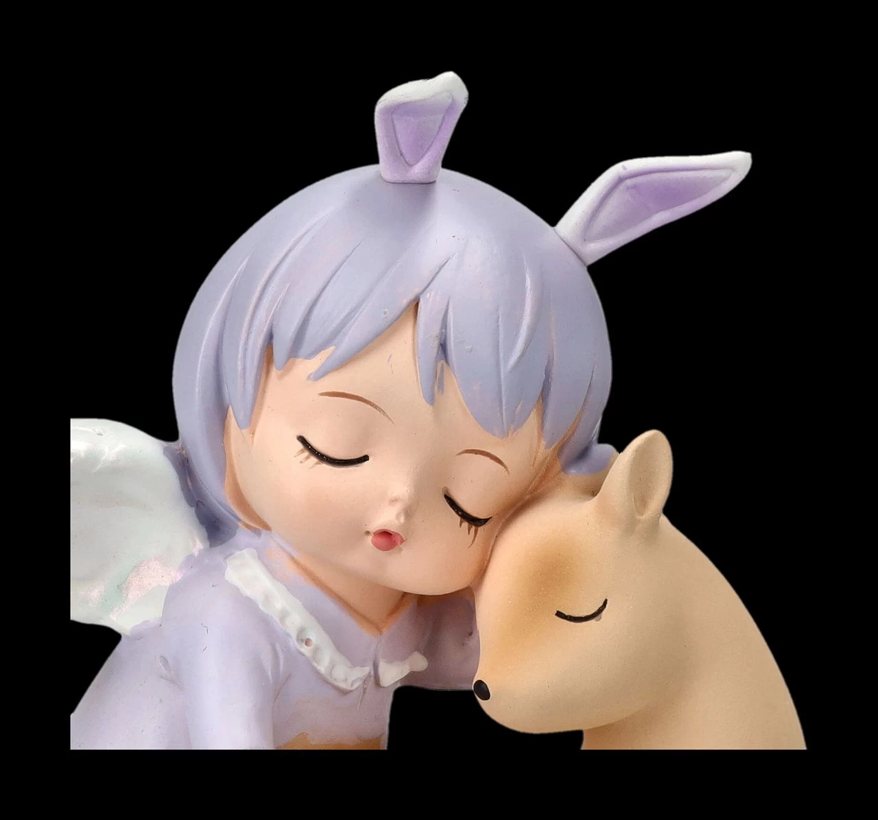 Bewacht von seinem Schutzengelchen schläft das Bambi selig und beruhigt ein. Im Traum begegnet das kleine Reh dem Engelchen mit den blaßlila Haaren, das eigentlich wie ein kleines Häschen aussieht. Das 8,5 cm hohe, 8 cm breite und 6 cm tiefe putzige schlafende Engelchen mit dem Reh wurde aus liebevoll handbemaltem Kunststein (Polyresin) gefertigt. Gemeinsam mit den anderen Schutzengelchen aus unserem Shop ist es eine niedliche Frühlingsdekoration und ein süßes Geschenk für alle, die Engel lieben.