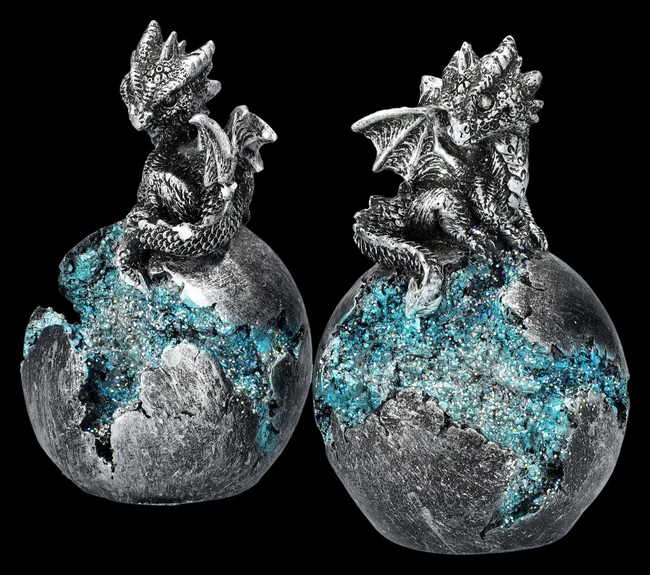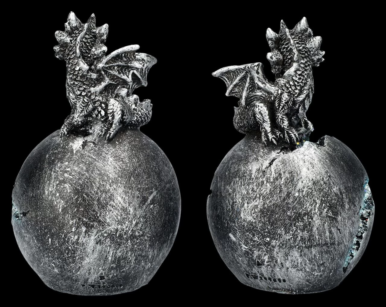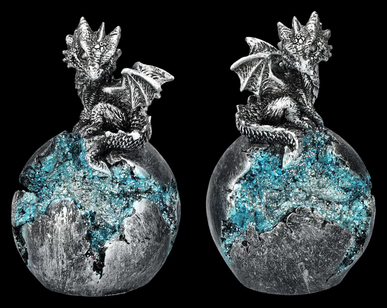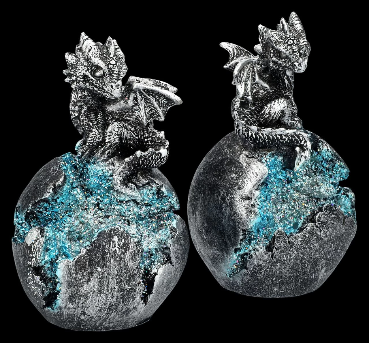 Die beiden niedlichen silberfarbenen auf einem Ei sitzenden Drachen sind nicht nur an Ostern eine bezaubernde Dekoration. Da sie im 2er-Set kommen, können sie auch mit Freunden geteilt werden. Die beiden, je 12,5 cm hohen, je 7,5 cm breiten und je 7,5 cm tiefen Drachen auf dem Ei sind aus handbemaltem Kunststein (Polyresin) gefertigt und werden durch die LED-Beleuchtung mit sanftem Farbwechsler selbst in der Dämmerung nicht übersehen. Für die batteriebetriebene LED-Beleuchtung werden je 2 x LR44 Batterien benötigt, die nicht in der Lieferung enthalten sind. Für alle Drachenfreunde sind diese silberfarbenen Drachen ein perfektes Geschenk.