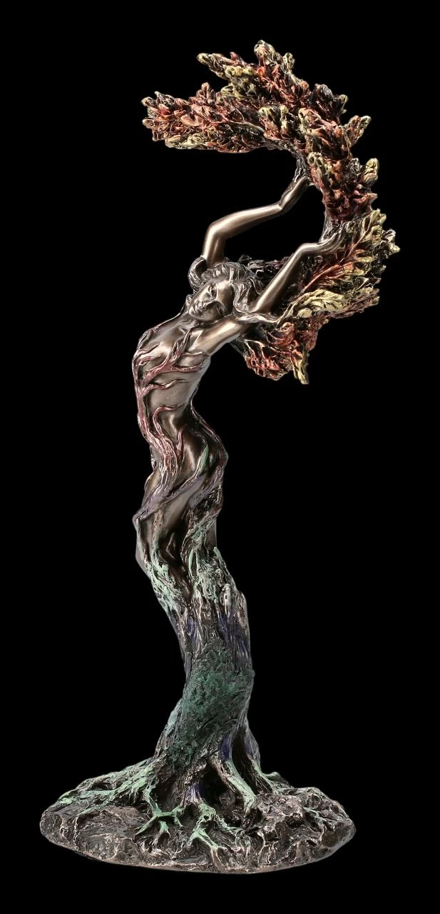 Aus dem Stamm einer Eiche reckt sich die verführerische Waldnymphe und stützt mit ihren Händen die Baumkrone mit den herbstlich gefärbten Blättern. Die wunderschöne Waldnymphe gehört zum Geschlecht der Dryaden, die in der Griechischen Mythologie als Baumgeister die Bewohner und Beschützerinnen des Waldes waren. Vor allem gelten sie nach wie vor als die Nymphen der Eichenbäume und sind stets eng verbunden mit dem Baum, in dem sie leben. Die ästhetische Herbst-Waldnymphe aus der Studio Collection von Veronese ist 26 cm hoch, 12 cm breit und 10 cm tief. Die aus edel bronziertem und sehr fein coloriertem Kunststein (Polyresin) gefertigte Dryade ist ein wunderbares Geschenk und eine herrliche Deko für jeden, der die Natur liebt.