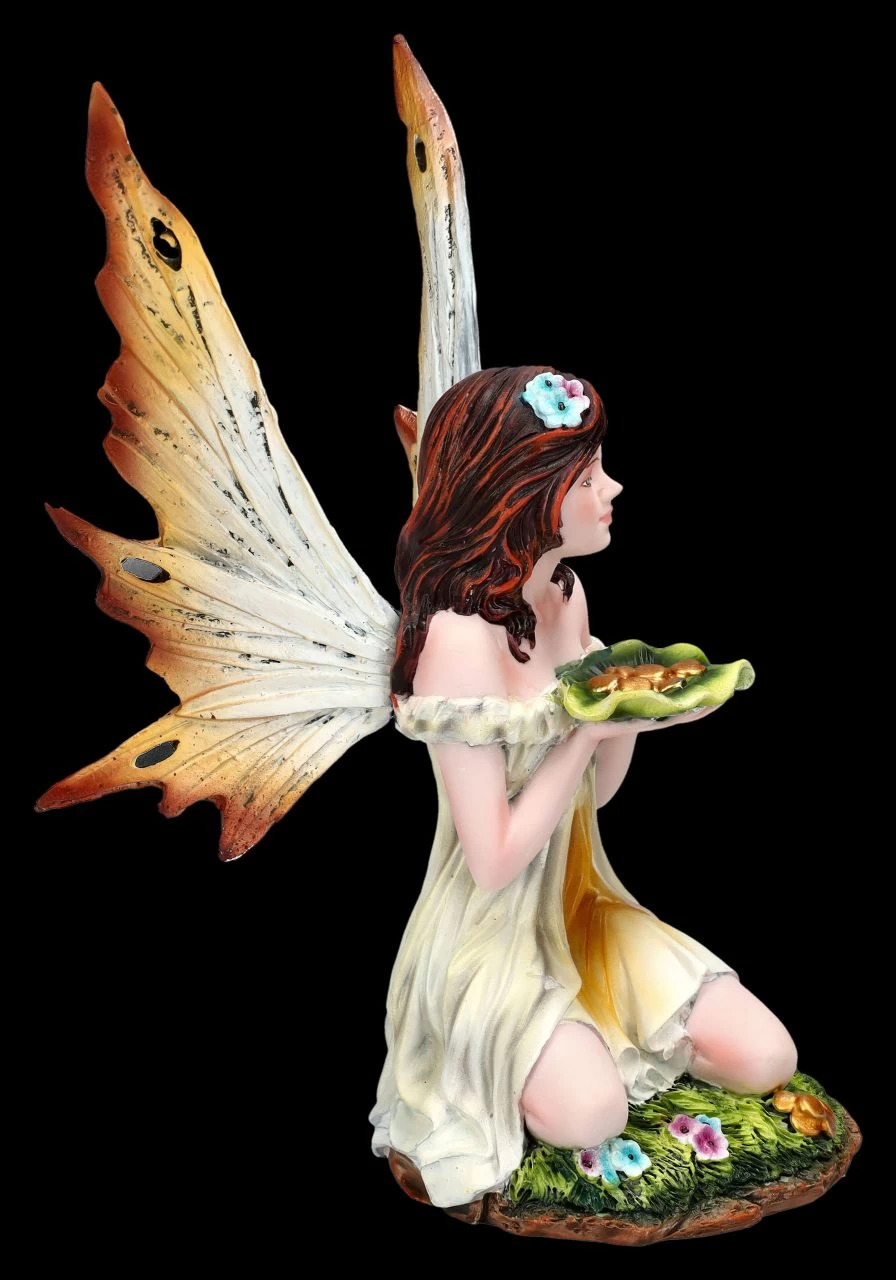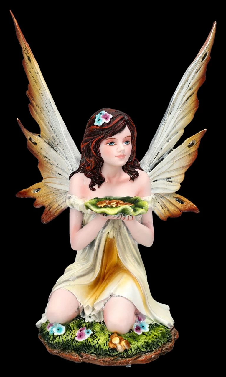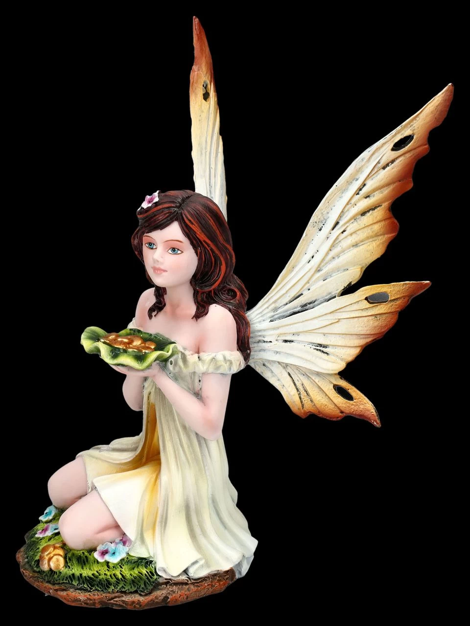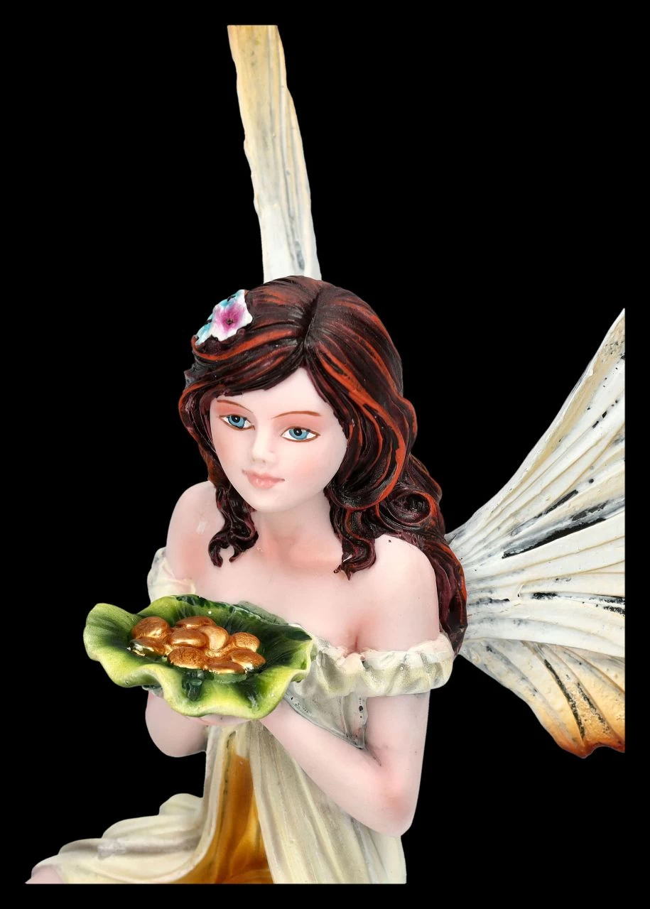 Neuen Job angetreten, oder ist eine wichtige Anschaffung geplant? Dann ist die niedliche Elfe Bloei doch ein perfektes Geschenk für alle, denen Sie Glück wünschen möchten. Auf einer Blütenwiese kniet die niedliche Elfe Bloei und präsentiert ein mit Münzen befülltes Glückskleeblatt. In ihrem hübschen Kleid und mit den großen filigranen Flügeln ist sie doch ein ganz bezaubernder Glücksbote und schaut absolut niedlich aus. Die Flügel der 17 cm hohen, 11 cm breiten und 11 cm tiefen Elfenfigur aus liebevoll handbemaltem Kunststein (Polyresin) sind zum Stecken. Eine zauberhafte Elfe, die nicht nur Sammlern große Freude bereitet.