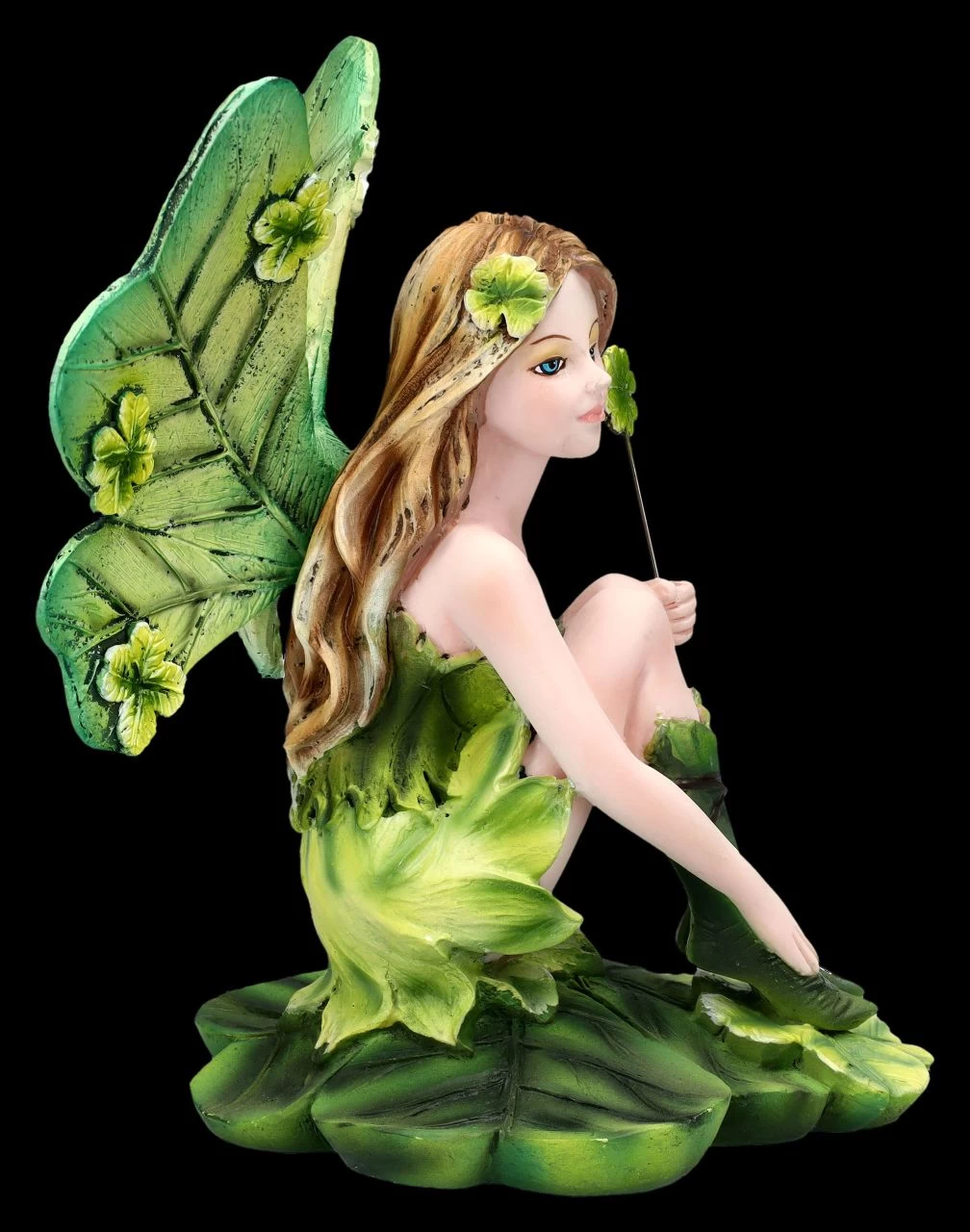 Auf einem vierblättrigen Kleeblatt sitzt verträumt die niedliche Glücksfee Lindir. Mit ihren Kleeblatt-Flügeln und dem Blätterkleid ist sie doch ein ganz bezaubernder Glücksbote und mit ihren grünen Stiefelchen schaut sie doch absolut niedlich aus. Die Flügel der 14 cm hohen, 11 cm breiten und 11 cm tiefen Elfenfigur aus liebevoll handbemaltem Kunststein (Polyresin) sind zum Stecken. Glück ist relativ und da es für jeden eine andere Bedeutung hat, gibt es zahlreiche Symbole. Ein vierblättriges Kleeblatt ist aber für viele ein wichtiges Glückssymbol – und das sicher nicht nur zu Neujahr. Damit ist die Glücksfee Lindir doch ein perfektes Geschenk für alle, denen Sie Glück wünschen möchten.