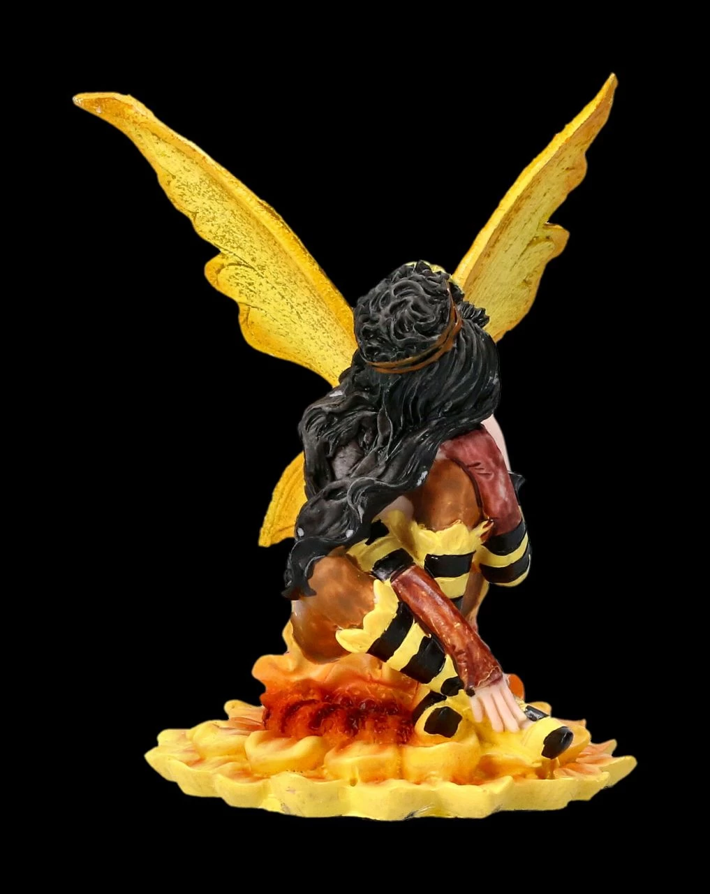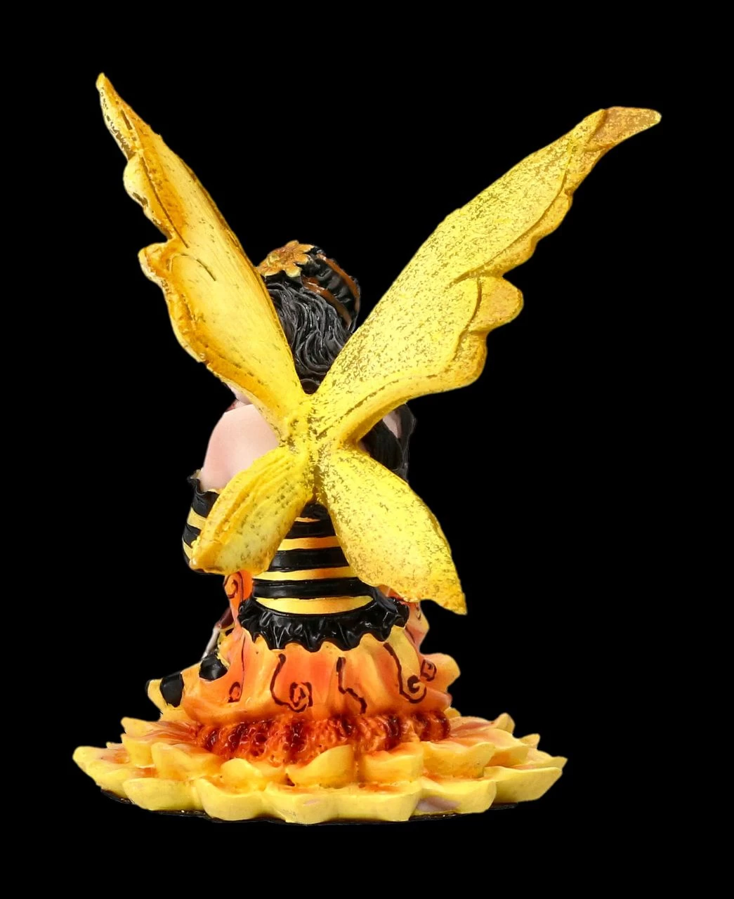 Ihr niedliches Köpfchen mit den langen schwarzen Haaren auf Hand und Knie gestützt, sitzt die süße kleine Mini Fee mitten in einer Sonnenblume. Ihr gelb und schwarz gestreiftes Kleidchen und die Ringelstrümpfe legen nahe, dass sie wie die Bienen vom Nektar naschen möchte. Mit ihrer Höhe von 8 cm, der Breite von 6 cm und der Tiefe von 6 cm ist die sehr detailreich aus Kunststein (Polyresin) gefertigte und liebevoll handbemalte süße kleine Elfen Figur ein wunderbares Geschenk nicht nur für Elfenfreunde und -Sammler, sie ist auch eine romantische Dekoration für jede Blumenbank.