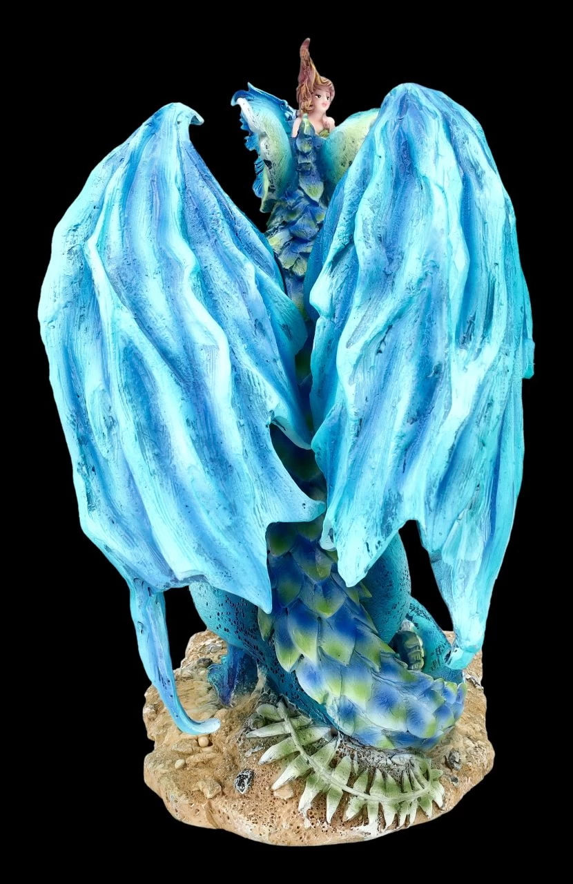 „Was machst du da – brütest du ein Ei aus, oder denkst du philosophisch über Gott und die Welt nach?“ scheint die kleine freche Elfe neugierig den großen blauen Drachen zu fragen, der vor ihr auf dem Waldboden sitzt. Die kleine Elfe in ihrem grünen Kleidchen und den blau geringelten Strümpfen möchte alles ganz genau wissen. Auch wenn sie keine Angst hat, flattert sie doch lieber in sicherem Abstand vor dem blauen Drachen und so kann sie ihm auch viel besser in die Augen schauen. ‚Close Encounter‘, also ‚Nahe Begegnung‘ nennt die amerikanische Fantasykünstlerin Amy Brown, die für ihre fantasievollen Arbeiten berühmt ist, den blauen Drachen mit der kleinen Elfe. Amy Brown hatte sich schon als Kind für die sagenhafte Welt der Elfen, Feen und Drachen interessiert und machte sie später zum Mittelpunkt ihrer kreativen Arbeit. Die niedliche Elfen-Figur mit dem blauen Drachen wurde aus hochwertigem Kunststein (Polyresin) gegossen und liebevoll von Hand bemalt. Sie ist 17,5 cm hoch, 25 cm breit und 12 cm tief und die großen Flügel des Drachens sind zum Stecken. Close Encounter ist ein perfektes Geschenk für Sammler der Arbeiten von Amy Brown und für alle, die sich gerne in die Welt der Elfen, Feen und Drachen hineinträumen.