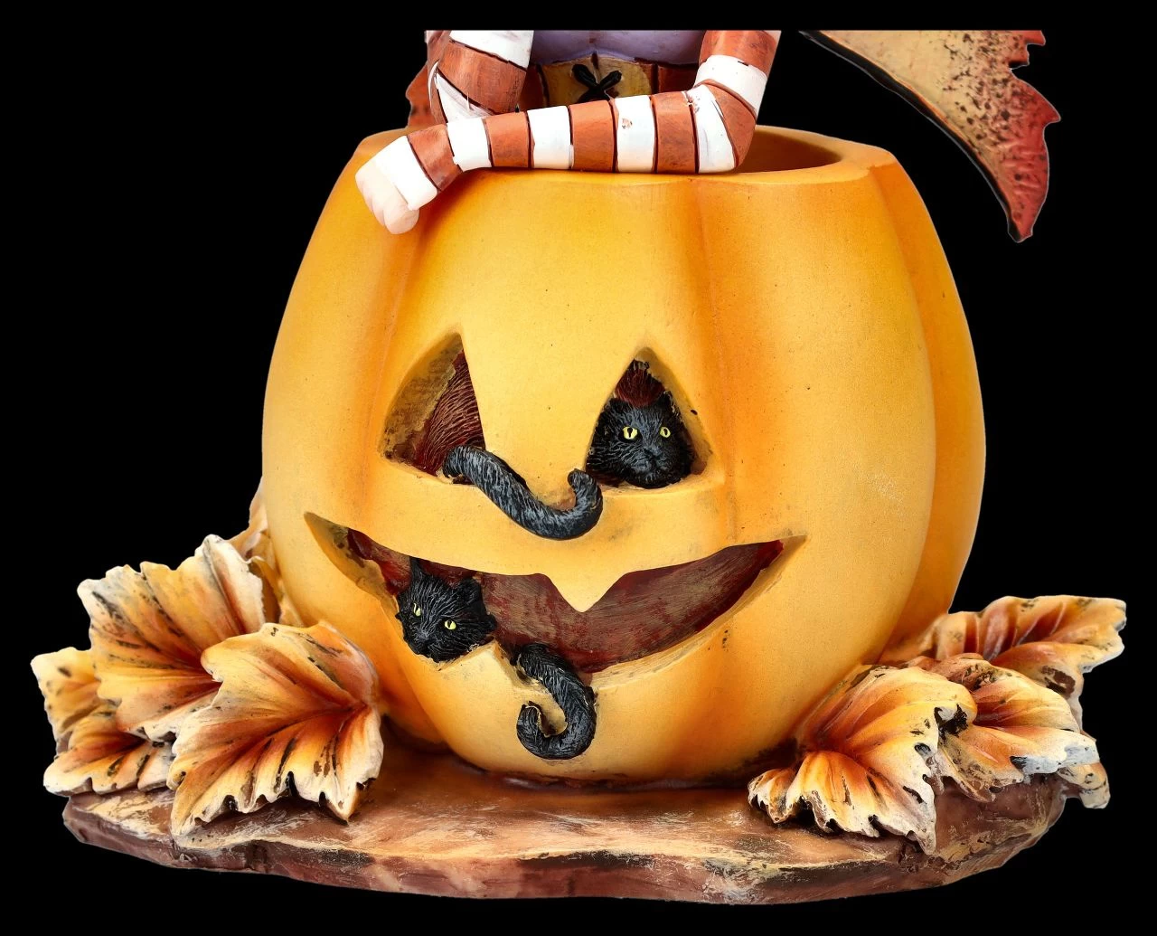 Soll ich jetzt echt bis zum nächsten Halloween im Kürbis sitzen bleiben und darauf warten, was meine drei kleinen Hexenkatzen bis dahin so alles anstellen? Während eine der drei schwarzen Kätzchen ihre Frisur durcheinanderwirbelt, stützt die schöne rothaarige Elfe ihren Kopf nachdenklich auf die Hand in den geringelten Handschuhen. Mischief – die Elfe mit ihren Katzen im Kürbis stammt von der großen amerikanischen Fantasy-Künstlerin Amy Brown. Die 16,5 cm hohe, 13,5 cm breite und 9 cm tiefe Elfen-Figur wurde bis zu den herbstlichen Blättern detailreich aus Kunststein (Polyresin) gefertigt und liebevoll von Hand bemalt. Die Flügel der hübschen Elfe mit den langen roten Locken sind zum Stecken. Mischief muss nicht nur zu Halloween ihren Platz einnehmen, sie ist auch das ganze Jahr über – zum Beispiel zwischen grünen Pflanzen auf der Blumenbank – ein schöner Blickfang und damit ein tolles Geschenk für alle, die Halloween feiern, aber natürlich auch alle, die Elfen lieben.