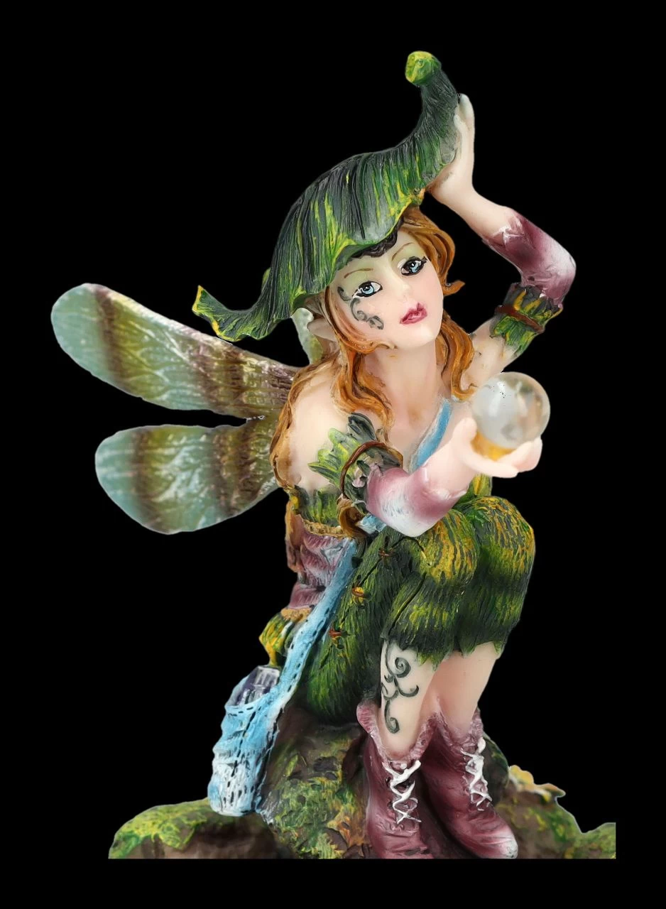 In ihrer moosfarbenen Hose und dem Mieder, den kleinen dunkelroten Stiefelchen, dem frechen Hut, den sie mühevoll festhält und der blauen Umhängetasche sieht die kleine Elfe mit den Libellenflügeln aus, als wäre sie auf Wanderschaft und gerade auf den Steinen am Teich gelandet. Was wohl passiert, wenn sie die magische Kugel in ihren Händen in den Teich fallen lässt? Kommt dann ihr Libellen-Prinz, der sie auf der Wanderschaft begleitet? Die niedliche 11,5 cm hohe, 8 cm breite und 12 cm tiefe Elfe aus liebevoll handbemaltem Kunststein (Polyresin) freut sich auf enen Platz zwischen den Pflanzen auf Ihrer Blumenbank oder der Fensterbank, ist aber auch ein wunderbares Geschenk für alle, die die magische Welt der Elfen lieben.
