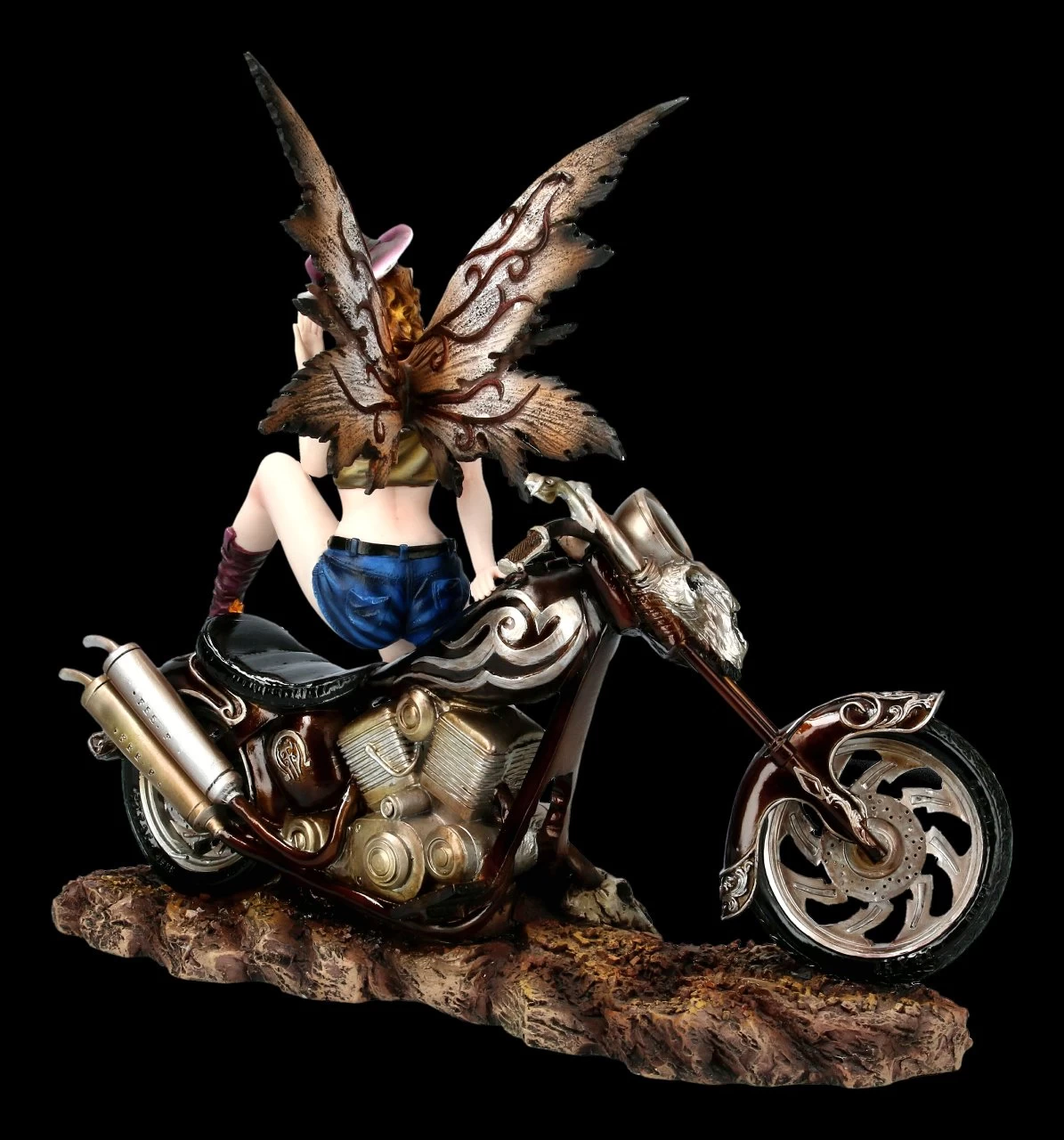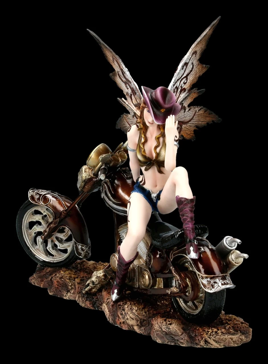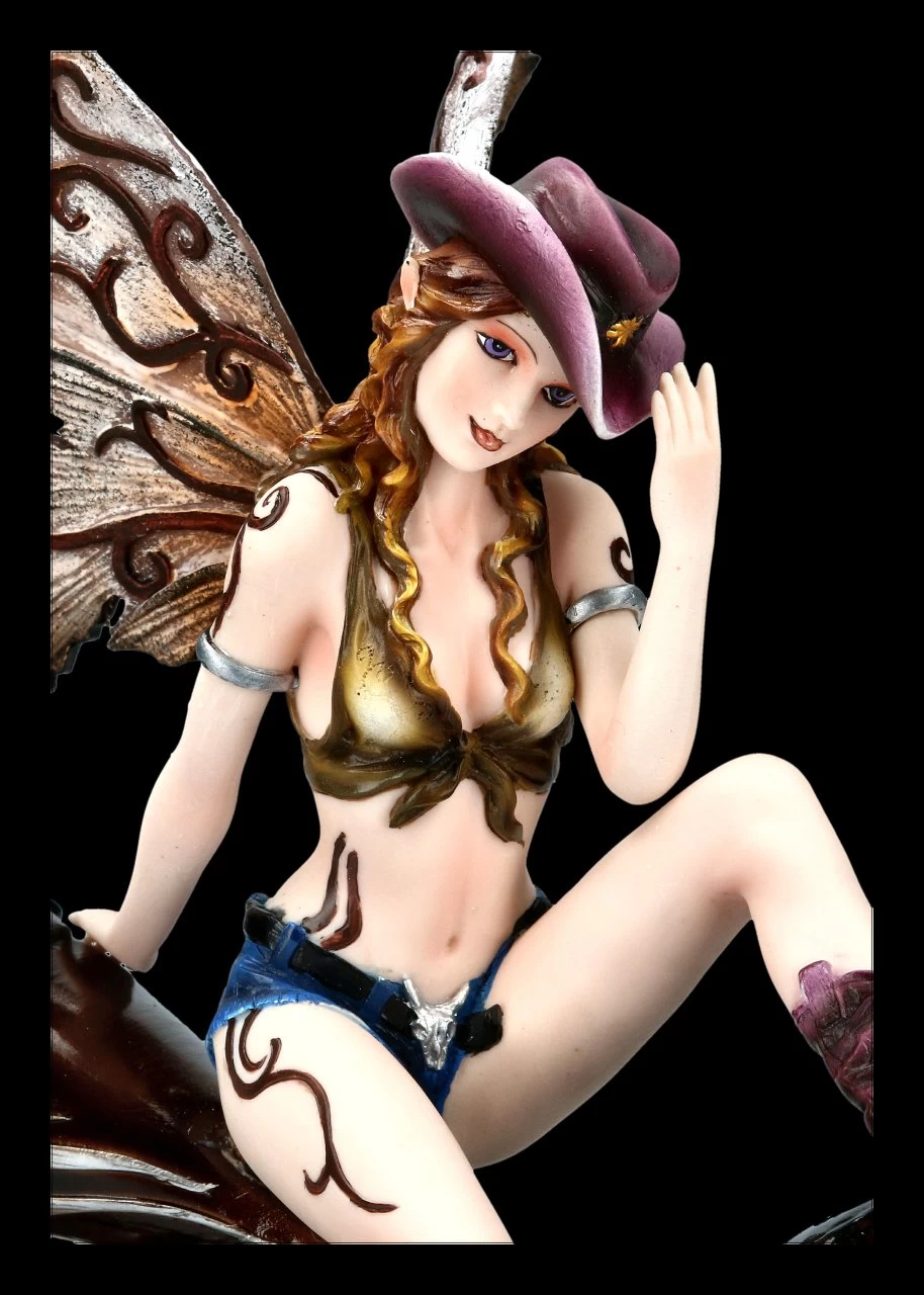 Mit ihrem Cowboy Hut und ihrem sexy Outfit wartet das Cowgirl auf dem Bike ihres Liebsten. Diese sinnliche Elfe wird nicht nur Biker erfreuen, sondern auch jeden, der außergewöhnliche Elfen mag.