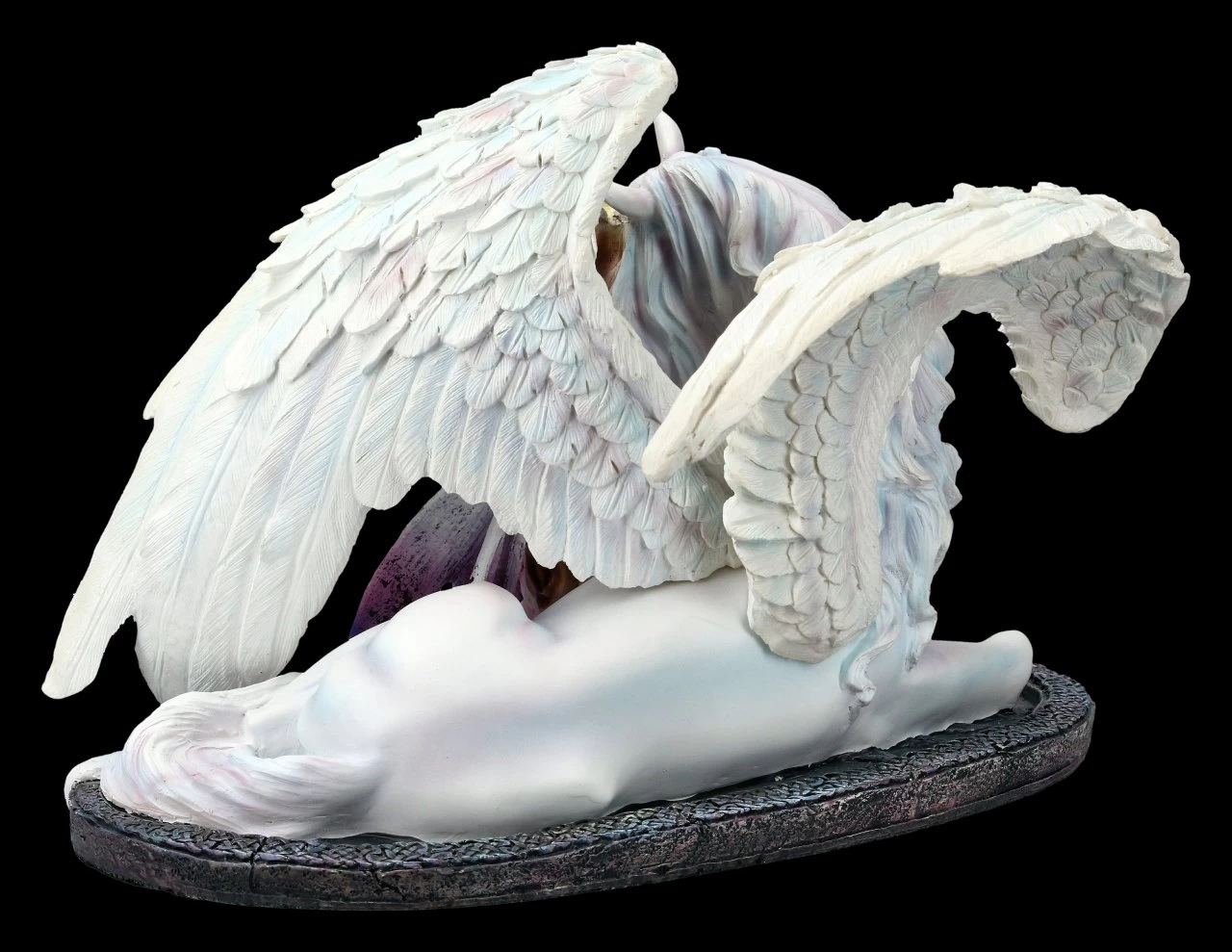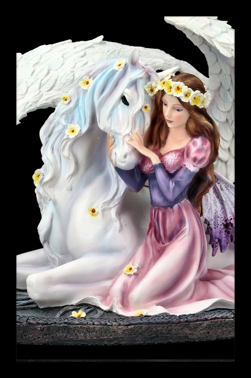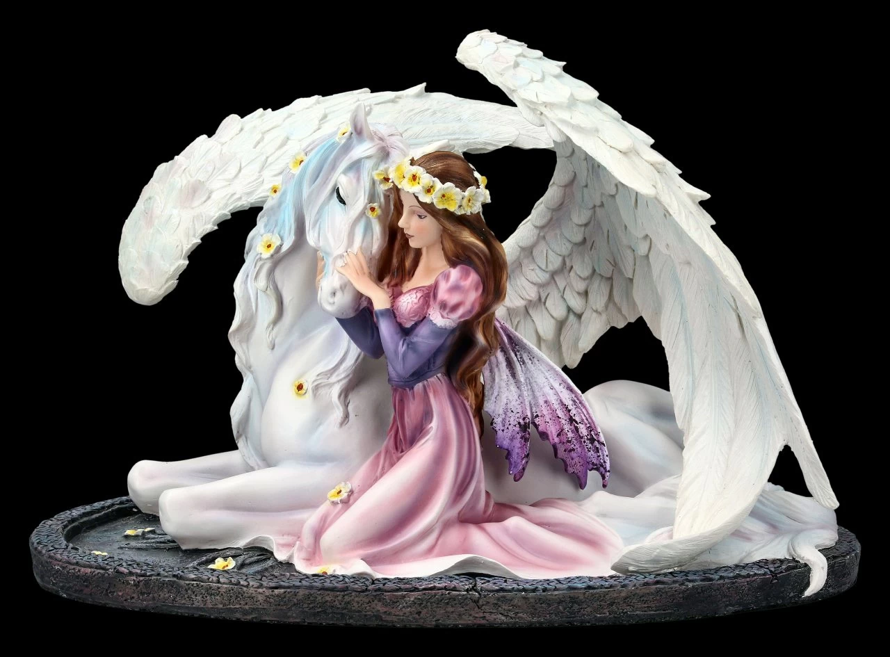 Die Elfenprinzessin Amalia kümmert sich liebevoll um den ruhenden Pegasus. Das geflügelte Pferd ist sehr scheu und lebt zurückgezogen. Allerdings vertraut das stolze Pferd der Prinzessin und lässt sich von ihr verwöhnen.