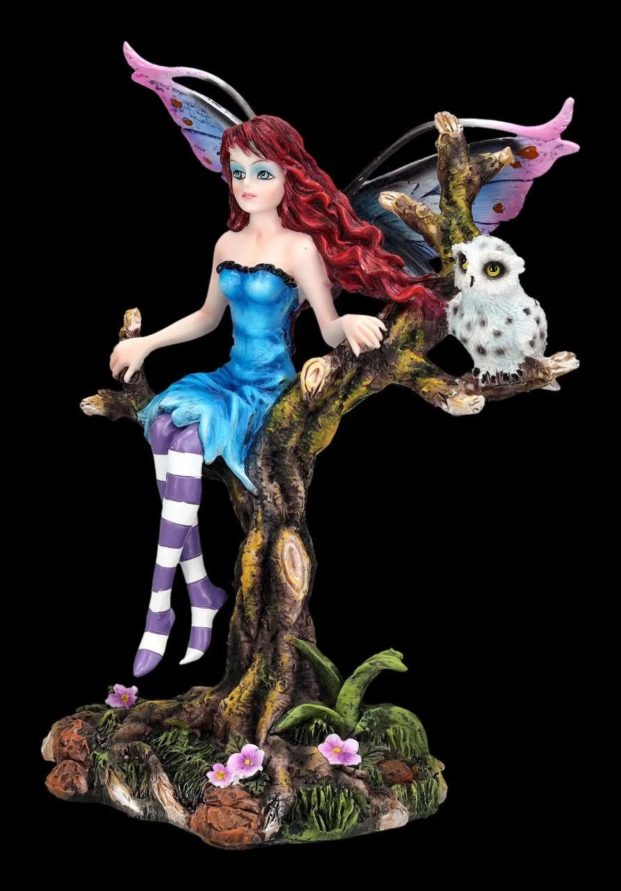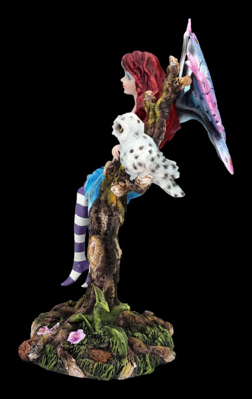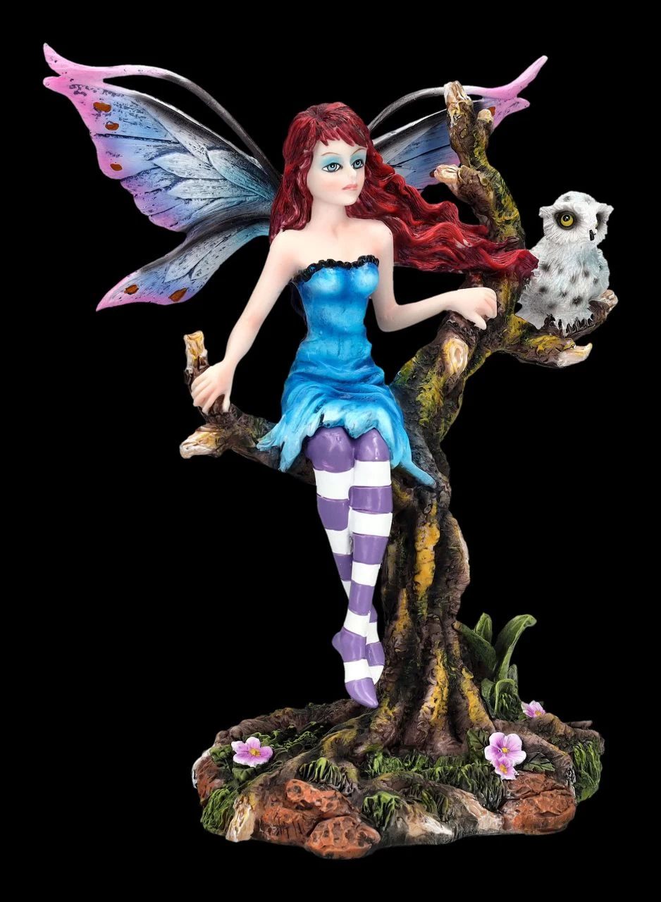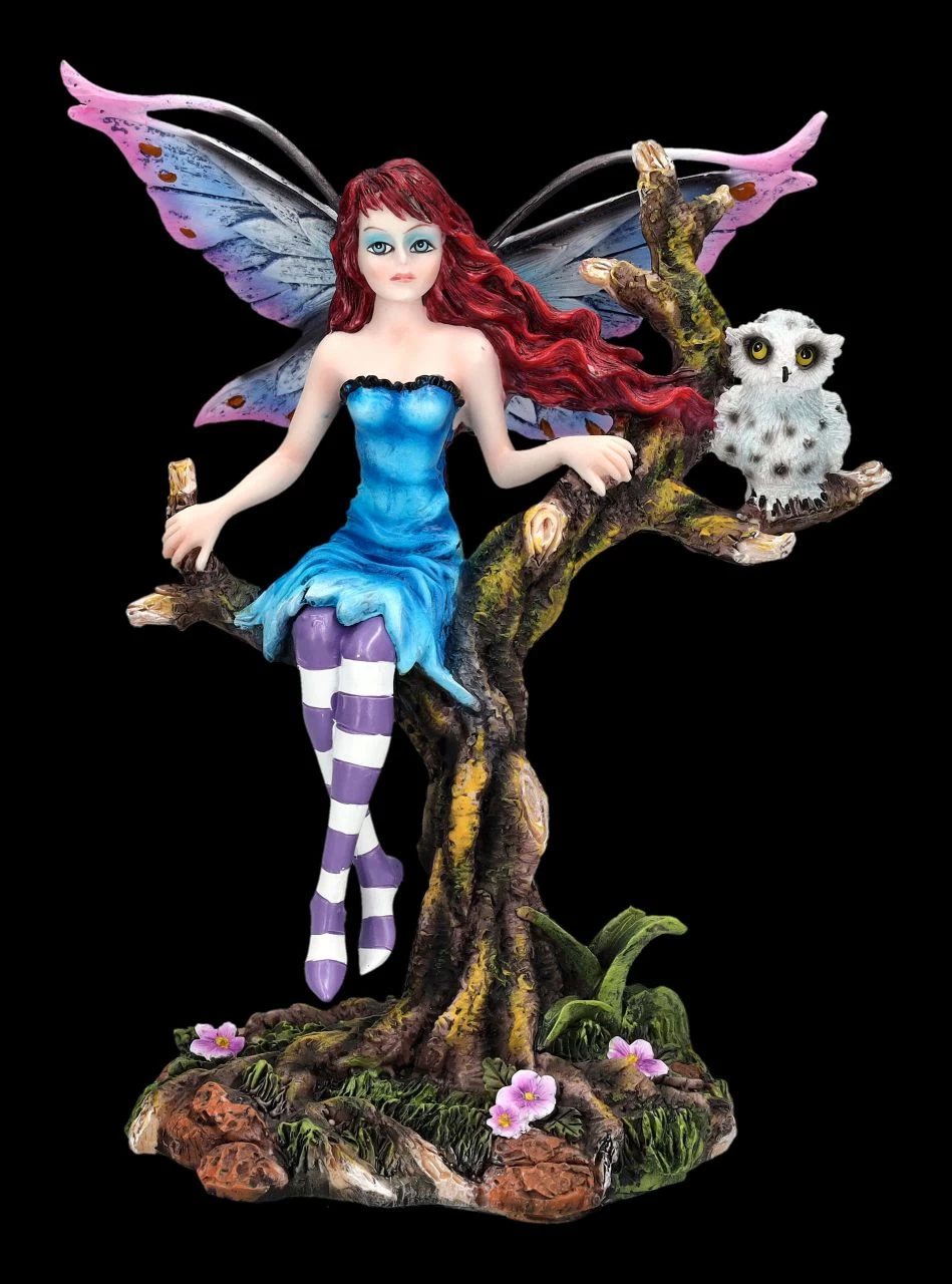 Völlig konzentriert schauen die Elfe und ihre Eule auf alles, was sich vor ihnen bewegt. Nicht einmal der Wind, der durch die langen roten Haare und die zarten Flügel der Elfe weht und der das Gefieder der Eule zerzaust veranlasst sie, den tollen Aussichtsplatz hoch oben auf einem Ast im alten Baum zu verlassen. Die niedliche Elfe scheint in ihrem dünnen blauen Kleidchen nicht einmal zu frieren, aber an den lustigen Ringelstrümpfen kann jeder sofort erkennen, dass sie ohnehin zu den ganz mutigen oder auch sehr neugierigen Elfen gehört. Die hübsche Elfen-Figur mit der Eule ist 18 cm hoch, 14 cm breit und 11 cm tief und aus liebevoll handbemaltem Kunststein (Polyresin) gefertigt. Die zarten Flügel sind zum Stecken.