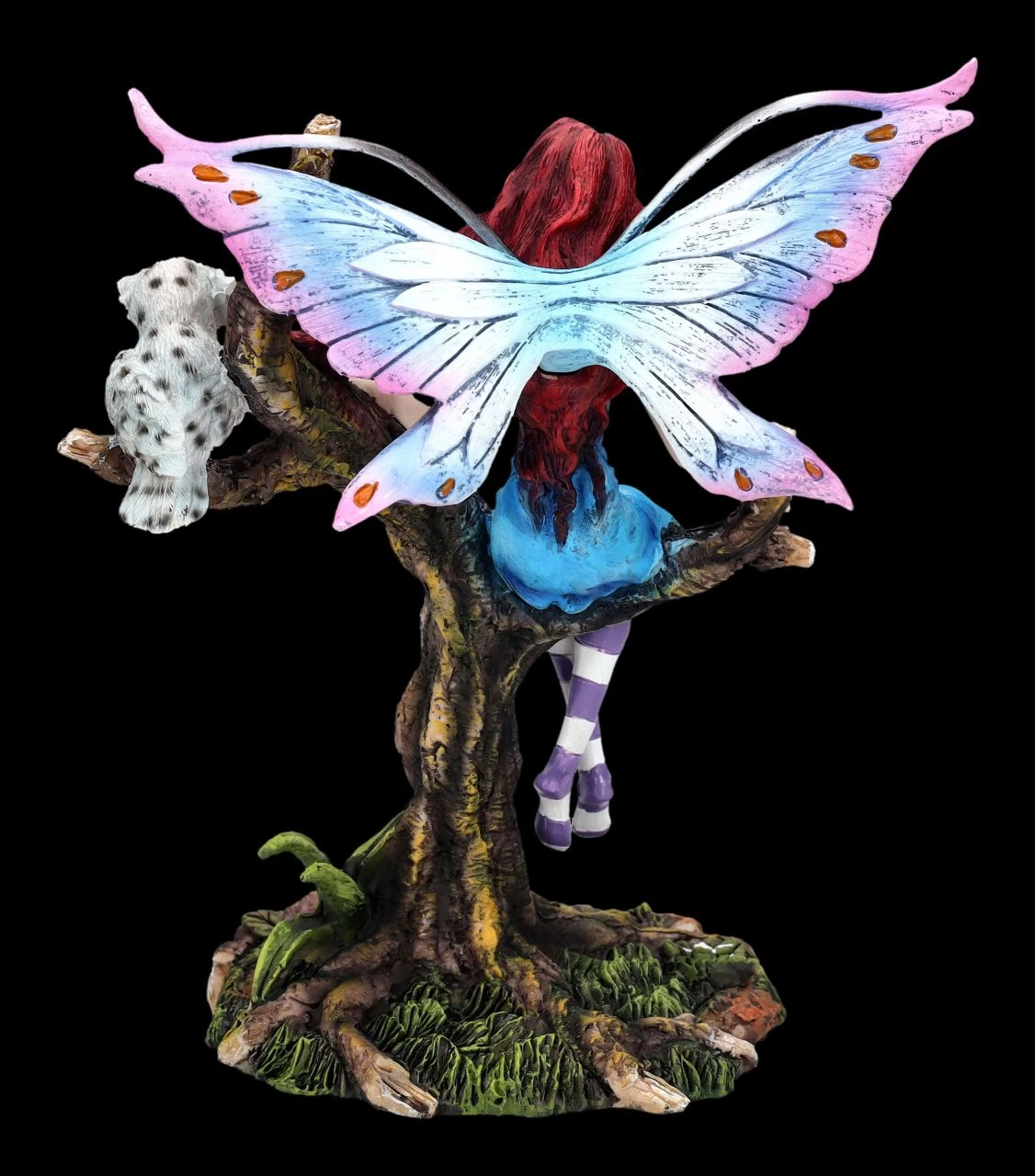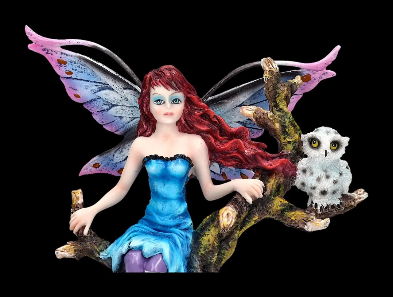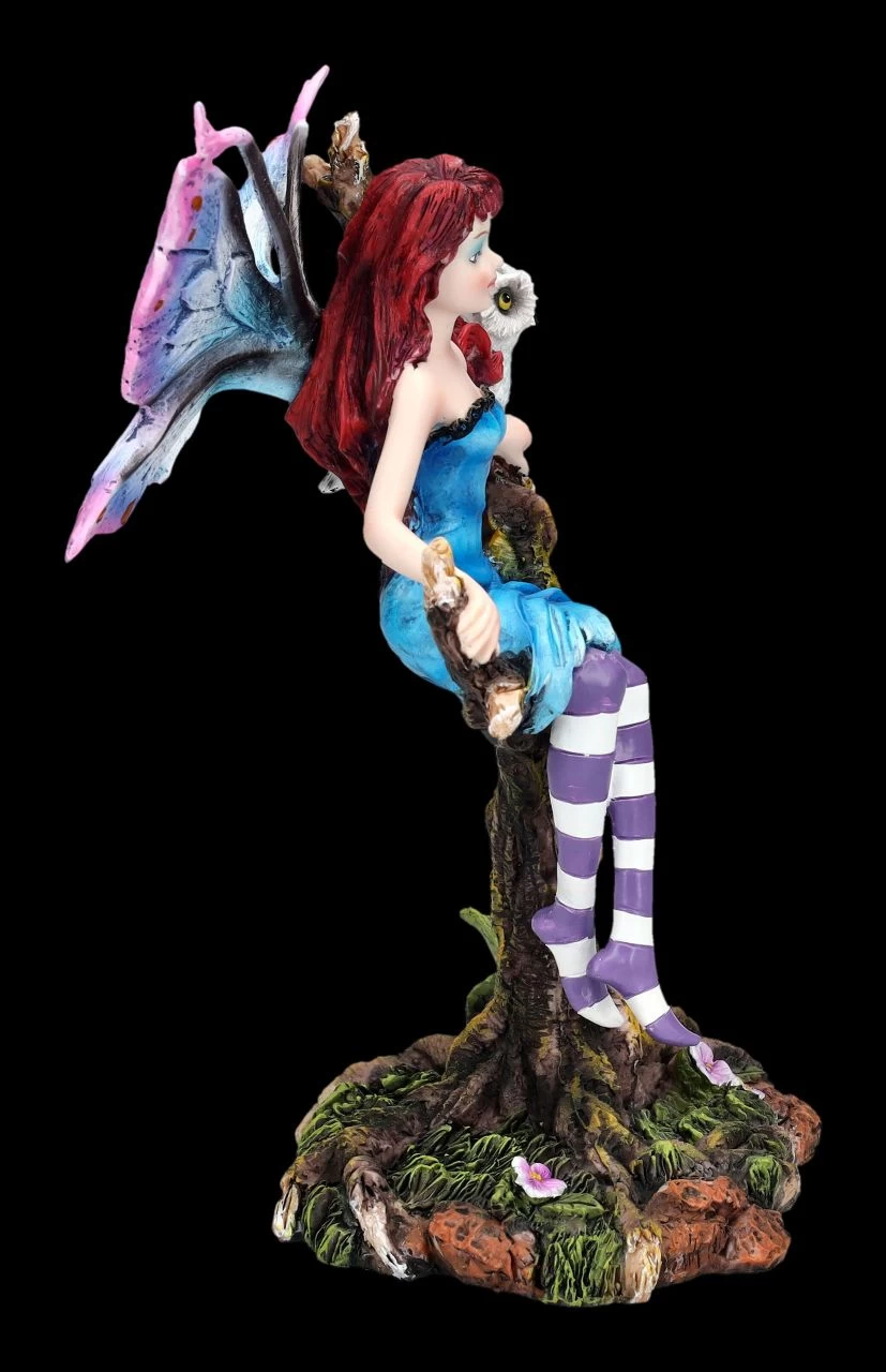 Völlig konzentriert schauen die Elfe und ihre Eule auf alles, was sich vor ihnen bewegt. Nicht einmal der Wind, der durch die langen roten Haare und die zarten Flügel der Elfe weht und der das Gefieder der Eule zerzaust veranlasst sie, den tollen Aussichtsplatz hoch oben auf einem Ast im alten Baum zu verlassen. Die niedliche Elfe scheint in ihrem dünnen blauen Kleidchen nicht einmal zu frieren, aber an den lustigen Ringelstrümpfen kann jeder sofort erkennen, dass sie ohnehin zu den ganz mutigen oder auch sehr neugierigen Elfen gehört. Die hübsche Elfen-Figur mit der Eule ist 18 cm hoch, 14 cm breit und 11 cm tief und aus liebevoll handbemaltem Kunststein (Polyresin) gefertigt. Die zarten Flügel sind zum Stecken.