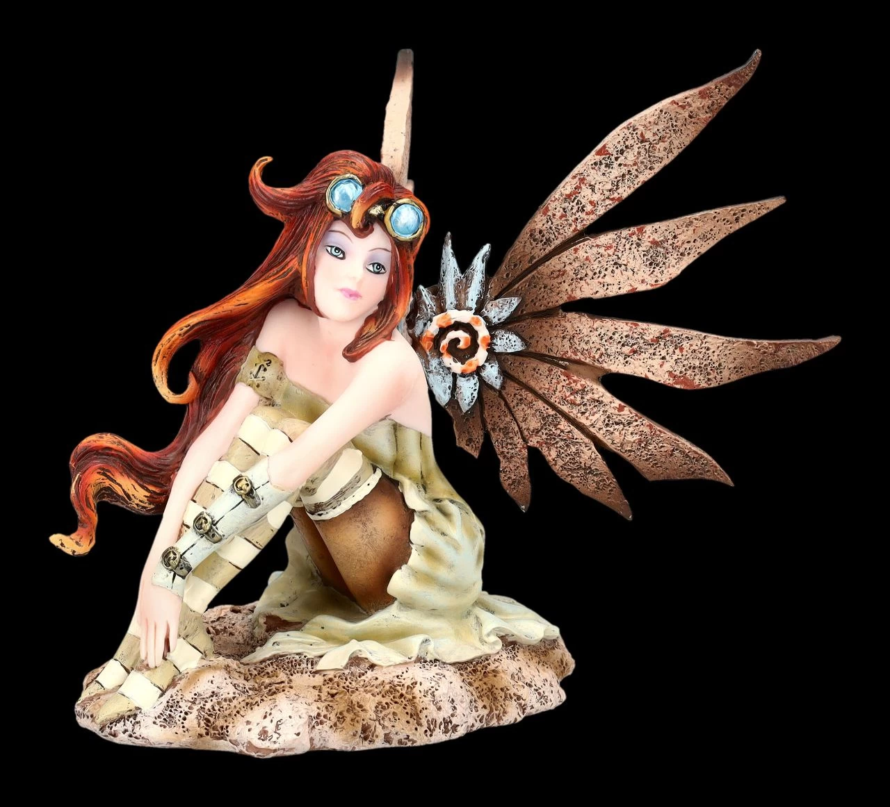 Mode- und Stilrichtungen gehen auch in der Welt der Elfen und Feen nicht so einfach vorbei und rebellische kleine Elfen, die sich – noch – nicht mit feinen Kleidern schmücken, gibt es natürlich auch. Die kleine Elfe mit den langen roten Haaren und den lustig geringelten Strümpfen liebt, wie man sieht, den Steampunk und hat sich sogar die passenden Flügel angesteckt. Sie sitzt auf einem Stein und blickt jeden herausfordernd an. Und so nennt die amerikanische Fantasykünstlerin Amy Brown, die für ihre fantasievollen Arbeiten berühmt ist, die kleine freche Elfe auch ‚Steampunk Fae‘. Amy Brown, die sich schon als Kind für die sagenhafte Welt der Elfen, Feen und Drachen interessiert hatte, machte sie später zum Mittelpunkt ihrer kreativen Arbeit. Die niedliche Elfen-Figur wurde aus hochwertigem Kunststein (Polyresin) gegossen und liebevoll von Hand bemalt. Sie ist 14 cm hoch, 14,5 cm breit und 14 cm tief und die Flügel sind zum Stecken. Die Steampunk Fae ist ein perfektes Geschenk für Sammler der Arbeiten von Amy Brown und für alle, die sich gerne in die Welt der Elfen, Feen und Drachen hineinträumen.