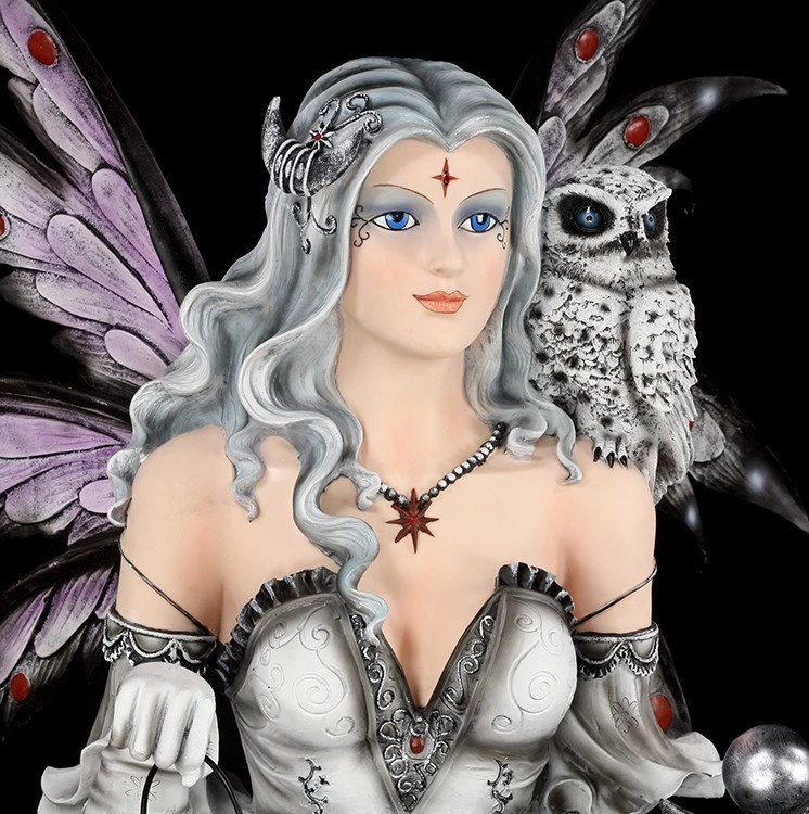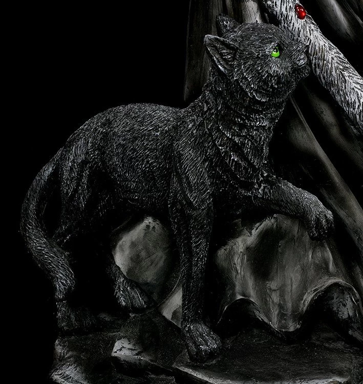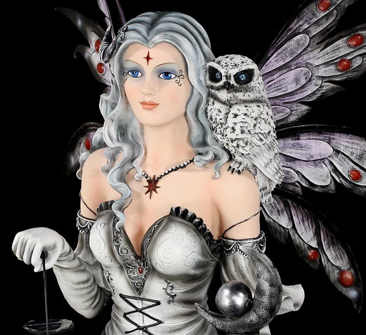 Eine anmutige Hexe streift durch den Zauberwald. Sie wird begleitet von ihrer schwarzen Katze und einer niedlichen Eule. Mit dieser 140 cm große Elfe holen Sie sich den Zauber der Fantasie in Ihre Wohnung. Die Figur wurde mit viel Liebe zum Detail aus hochwertigem Kunststein gefertigt und äußerst detailliert handbemalt. Sie wirkt durch die gegebene Körperhaltung und das gelungene Spiel mit den Farben und mit Licht und Schatten beinahe lebendig. In ihrer Hand hält sie eine Laterne. Sie wird zu dem Hingucker in einer Wohnung.