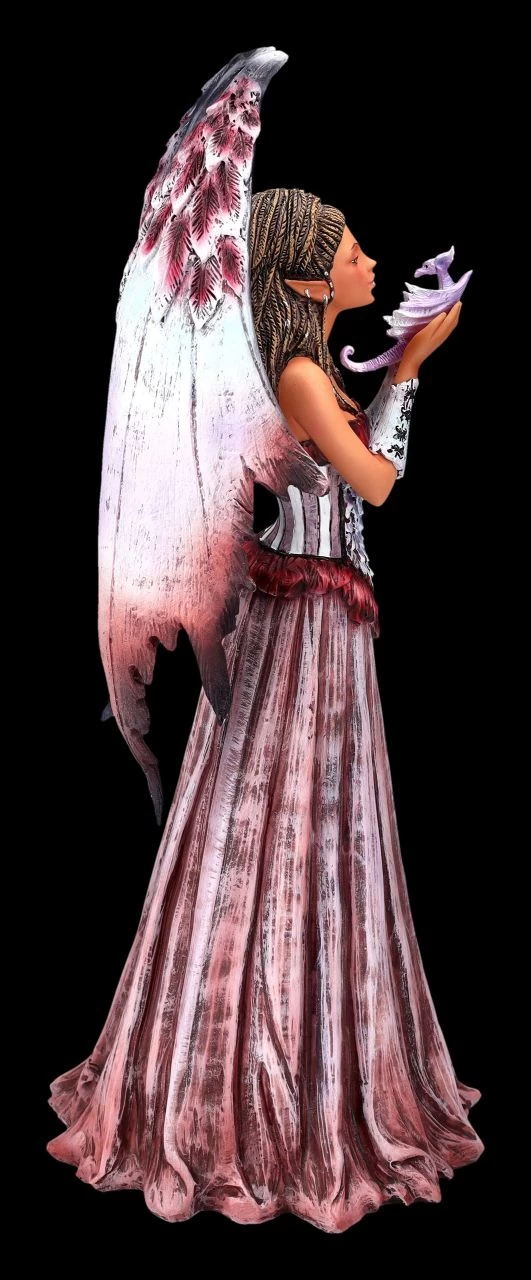 Die meisten von uns stellen sich Engel mit schneeweißem Gewand und Gefieder vor, nicht so die Fantasy-Künstlerin Amy Brown. Sie sagt von sich selbst: „Ich hoffe, Bilder zu schaffen, die andere zum Schaffen inspirieren, Menschen glücklich machen und allgemein ihre Stimmung aufhellen“.Und weiter sagt sie, dass wir alle an ein wenig Magie glauben sollen, auch wenn es nur für kurze Zeit ist. Diese außergewöhniche Elfe hat Amie Brown zum Schutzengel des Drachenbabys gemacht, das der wunderschöne Engel vorsichtig in Händen hält. Mit ‚Adoration Fairy‘ kann jeder seine Fantasie spielen lassen, wenn er diese mystisch schöne Engel mit den großen farblich zu ihrem schönen Gewand passenden Flügeln erblickt. Die fantasievolle Engel-Figur von Amy Brown mit den vielen Details und den tollen Farben wurde aus liebevoll handbemaltem Kunststein (Polyresin) geschaffen. Mit der Höhe von 35 cm, der Breite von 19 cm und der Tiefe von 14 cm wird der herrliche und sicher nicht nur von dem Drachenbaby angebetete Engel von allen bewundert werden. Nicht nur für Elfen-Sammler, sondern für alle die von der Welt der Drachen und Elfen fasziniert sind, ist diese ‚Adoration Fairy von Amy Brown ein perfektes Geschenk. Die schönen großen Flügel sind zum Stecken