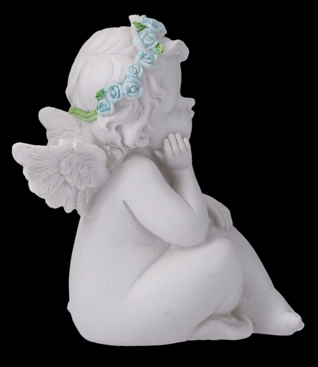 Ist das nicht süß? Den Kopf mit dem blauen Rosenkranz auf die Hand gestützt, sitzt die kleine weiße Putte sanft lächelnd auf dem Boden. Ob mit Flügeln oder ohne – die niedlichen kleinen Putten kennt man bereits seit der Antike. Die bezaubernde Engel-Figur ist aus liebevoll handbemaltem Kunststein (Polyresin) und 14 cm hoch, 10 cm breit und 12,5 cm tief. Als kleine Liebesgabe oder als Deko bei einer Hochzeitstafel, diese mit blauen Rosen bekränzte zauberhafte Putte ist auch ein bezauberndes Geschenk.