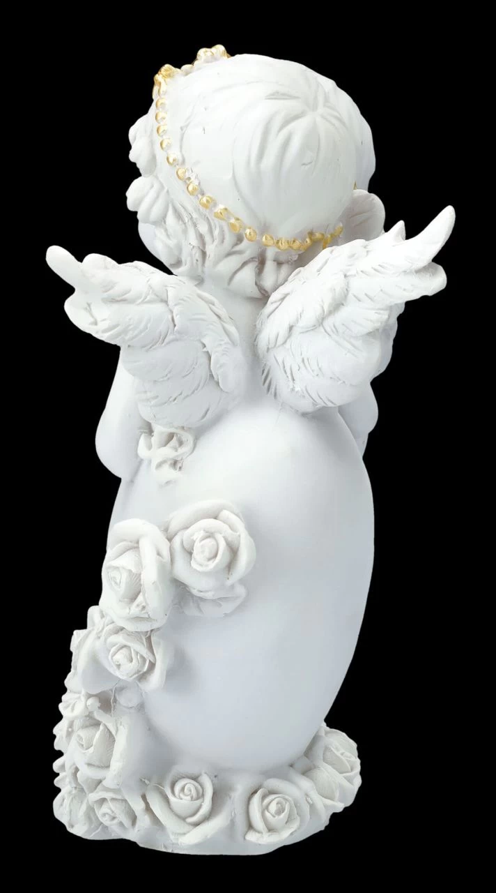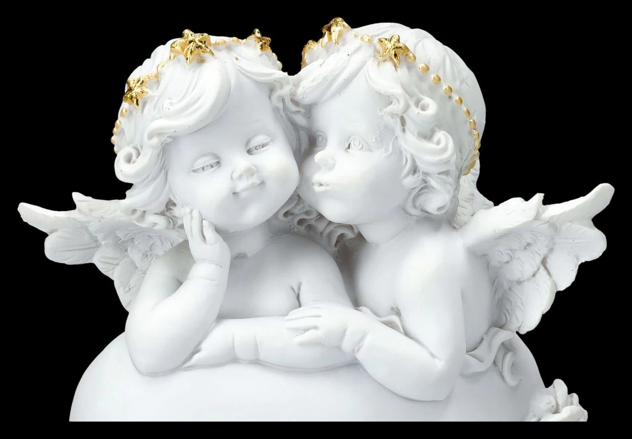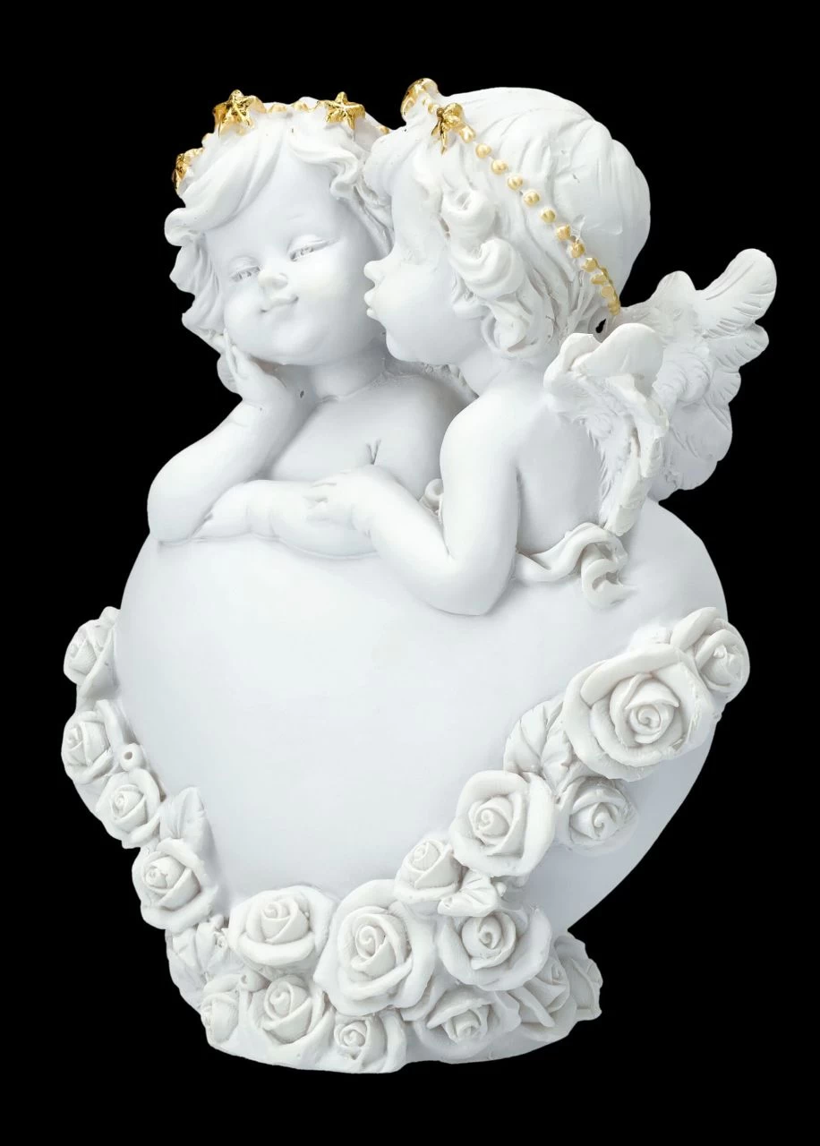 Ist das nicht niedlich? Aus einem mit Rosen geschmückten Herzen scheinen diese beiden kleinen Putten hervorzuschauen und eine der beiden Putten mit goldenen Sternenkränzen in den Haaren gibt der anderen ein zartes ‚Bussi‘. Dieses zauberhafte weiße Engel-Figur mit den goldenen Akzenten ist eine wirklich hübsche Dekoration auf einer Hochzeitstafel, aber auch ein reizendes Geschenk, denn bereits in der Antike kannte man den pausbäckigen ‚Putto‘, was im Lateinischen eigentlich ‚Knäblein‘ bedeutete, als Liebesengel. Die bezaubernden küssenden Putten mit dem Herz sind aus liebevoll handbemaltem Kunststein (Polyresin) und 15 cm hoch, 12 cm breit und 7 cm tief.