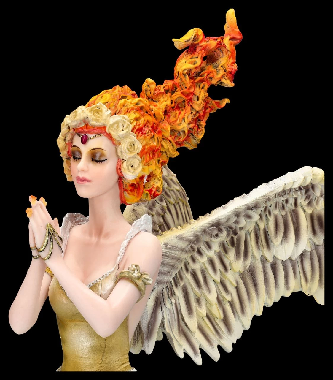 Der wunderschöne Engel ‚Spirit of Flame‘ ist eine Arbeit der beliebten amerikanischen Fantasy-Künstlerin Nene Thomas aus Oklahoma City. Sie schafft es immer wieder, Engel nicht nur als ätherische, sondern auch als leidenschaftliche Wesen darzustellen. Wie auch bei diesem zauberhaften Engel mit dem weißen Rosenkranz im welligen roten Haar, das wie Flammen den Himmel zum Leuchten bringt. Da kann man sich wunderbare Sonnenaufgänge oder prächtige Sonnenuntergänge vorstellen, die von diesem herrlichen Engel in Flammen gesetzt werden. Aber auch Thomas von Aquin hat schon gesagt: ‚Wer von einem Engel erleuchtet wird, erkennt, von wem er erleuchtet wird‘. Das passt perfekt auf diesen Engel, der von seinem frühlingshaften Kleid mit den Blumen am Saum und den filigranen Flügeln bis zu den zarten Hauttönen und vor allem dem flammendroten Haar wunderbar detailreich aus liebevoll handbemaltem Kunststein (Polyresin) entstanden ist. Die Flügel sind übrigens zum Stecken. Der 35 cm hohe, 14,5 cm breite und 22 cm tiefe Engel von Nene Thomas wird zum leuchtenden Mittelpunkt einer Sammlung. Er ist aber auch ein prachtvolles Geschenk für den persönlichen Engel.