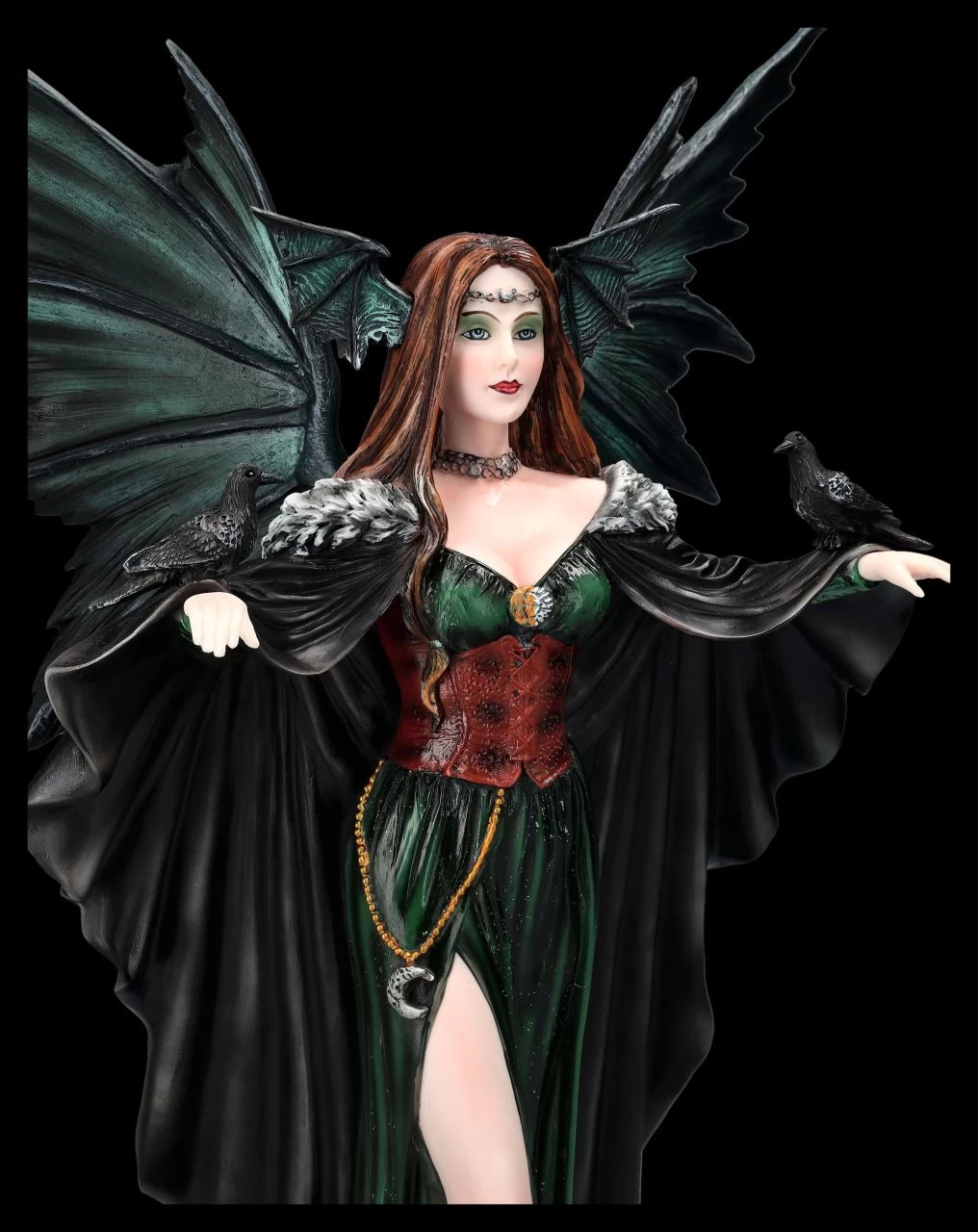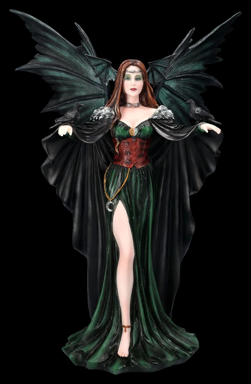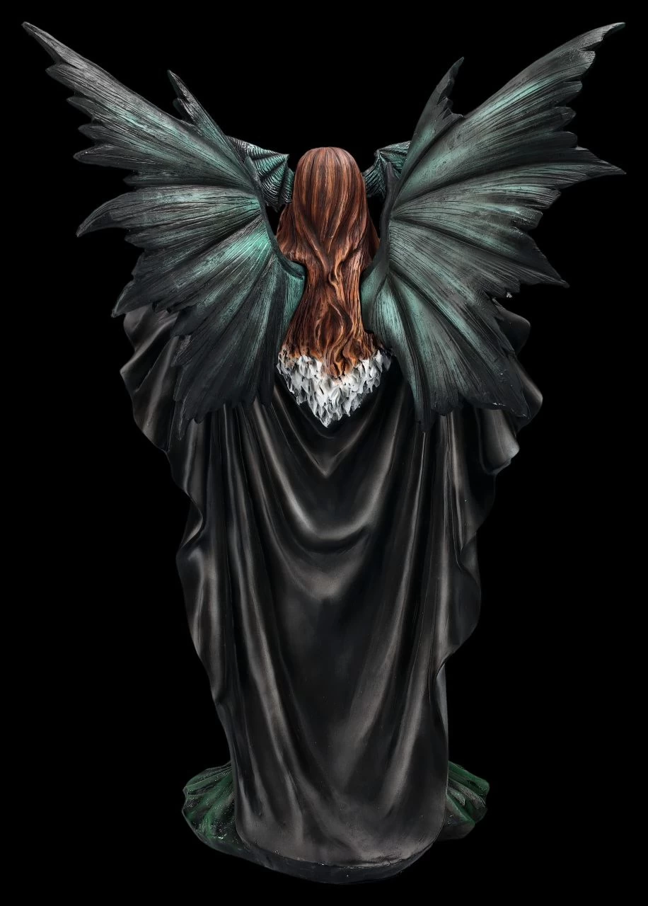 Welcome to the Darness! Doch an welchem Höllentor wartet dieser prachtvolle dunkle Engel? Es ist Ansichtssache, denn in dem hochgeschlitzten grünen Kleid mit rotem Mieder und schwarzem Umhang schaut dieser herrliche Engel für den einen gefährlich, für den anderen jedoch sehr verführerisch aus. Wenn schon, denn schon – wer möchte nicht von diesem herrlichen Engel empfangen werden? Also sollte er da einen Platz finden, an dem er einfach jeden willkommen heißen kann. Die prächtige Engel-Figur mit den beiden Raben auf den zum Empfang weit ausgebreiteten Händen wurde detailreich aus hochwertigem Kunststein (Polyresin) gefertigt und sorgfältig von Hand bemalt. Die detailreichen und prächtigen Flügel sind zum Stecken. Der 42 cm hohe, 26,5 cm breite und 19,5 cm tiefe dunkle Engel ist einfach wundervoll anzusehen und damit auch ein perfektes Geschenk für jeden Sammler.