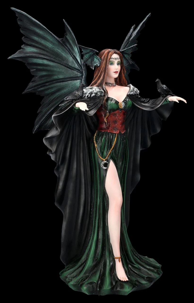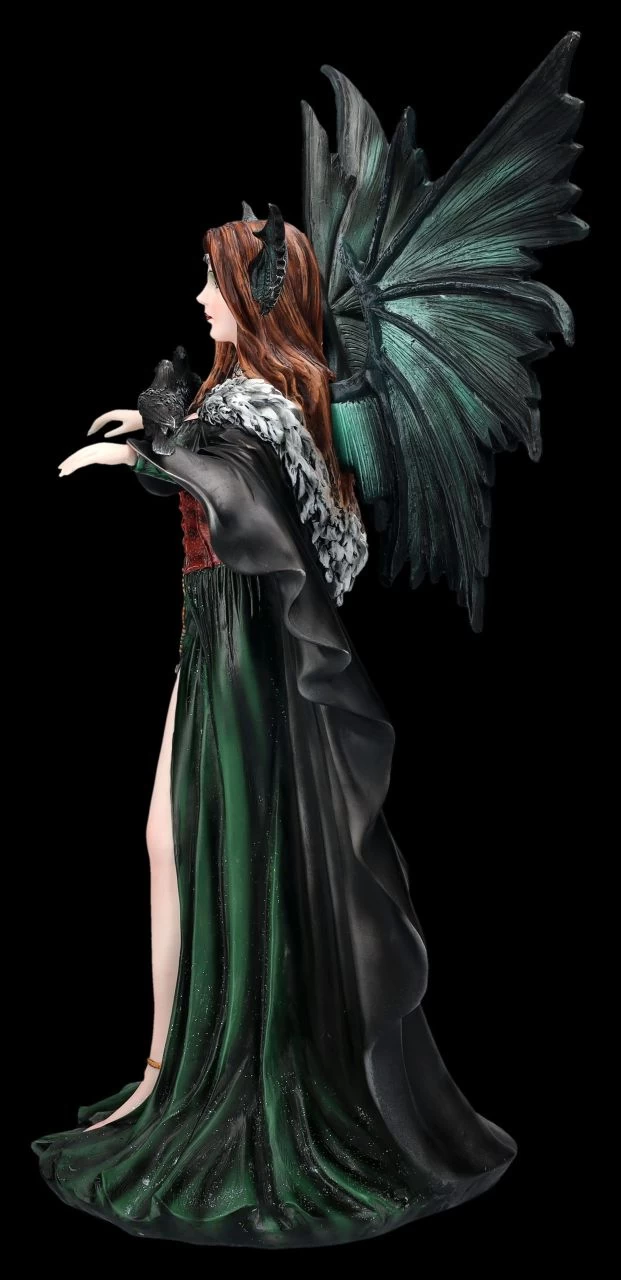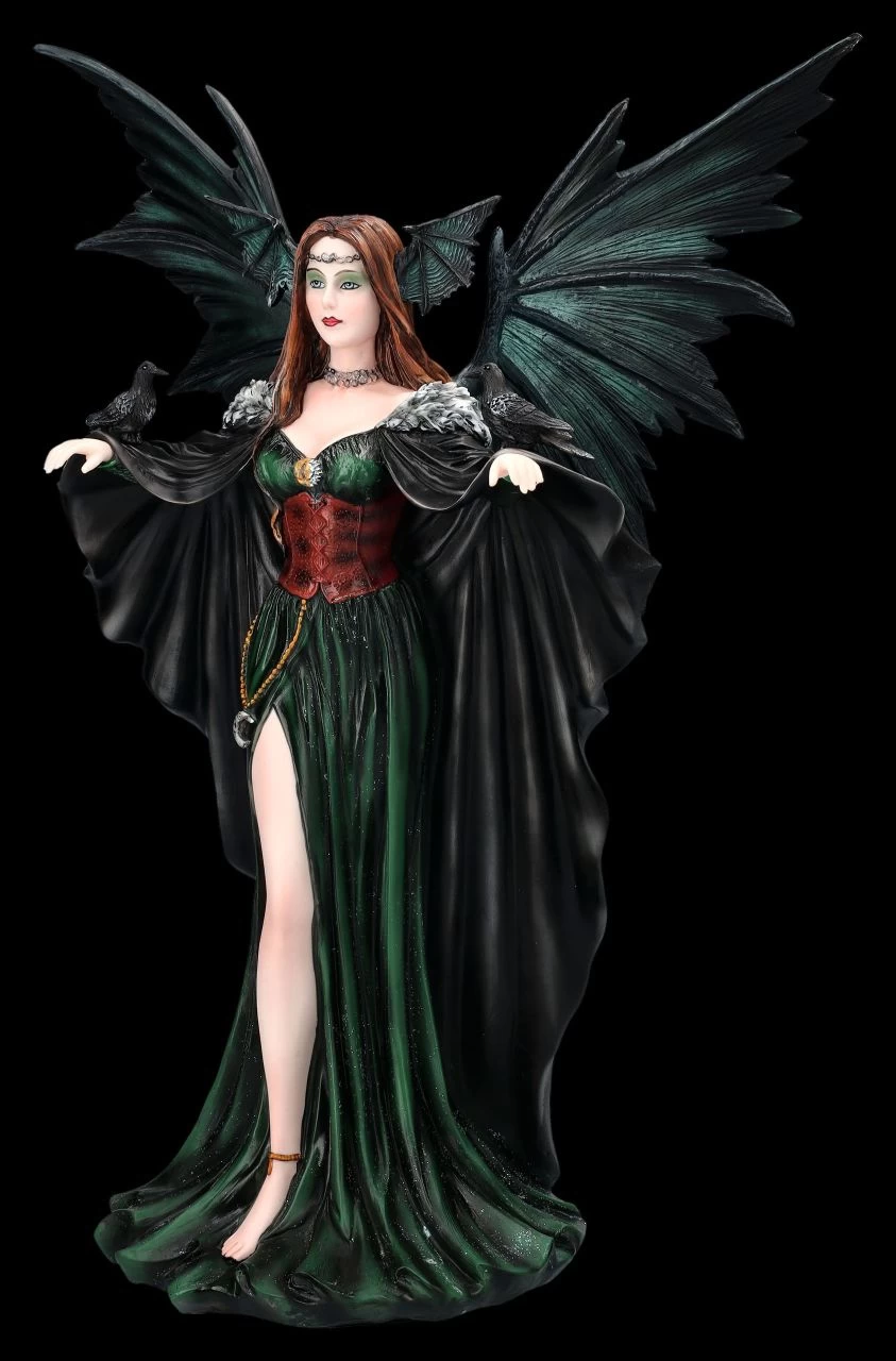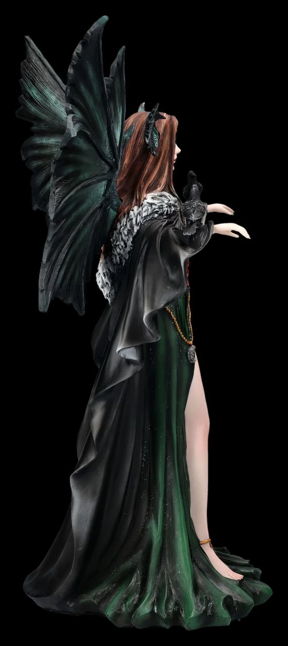 Welcome to the Darness! Doch an welchem Höllentor wartet dieser prachtvolle dunkle Engel? Es ist Ansichtssache, denn in dem hochgeschlitzten grünen Kleid mit rotem Mieder und schwarzem Umhang schaut dieser herrliche Engel für den einen gefährlich, für den anderen jedoch sehr verführerisch aus. Wenn schon, denn schon – wer möchte nicht von diesem herrlichen Engel empfangen werden? Also sollte er da einen Platz finden, an dem er einfach jeden willkommen heißen kann. Die prächtige Engel-Figur mit den beiden Raben auf den zum Empfang weit ausgebreiteten Händen wurde detailreich aus hochwertigem Kunststein (Polyresin) gefertigt und sorgfältig von Hand bemalt. Die detailreichen und prächtigen Flügel sind zum Stecken. Der 42 cm hohe, 26,5 cm breite und 19,5 cm tiefe dunkle Engel ist einfach wundervoll anzusehen und damit auch ein perfektes Geschenk für jeden Sammler.