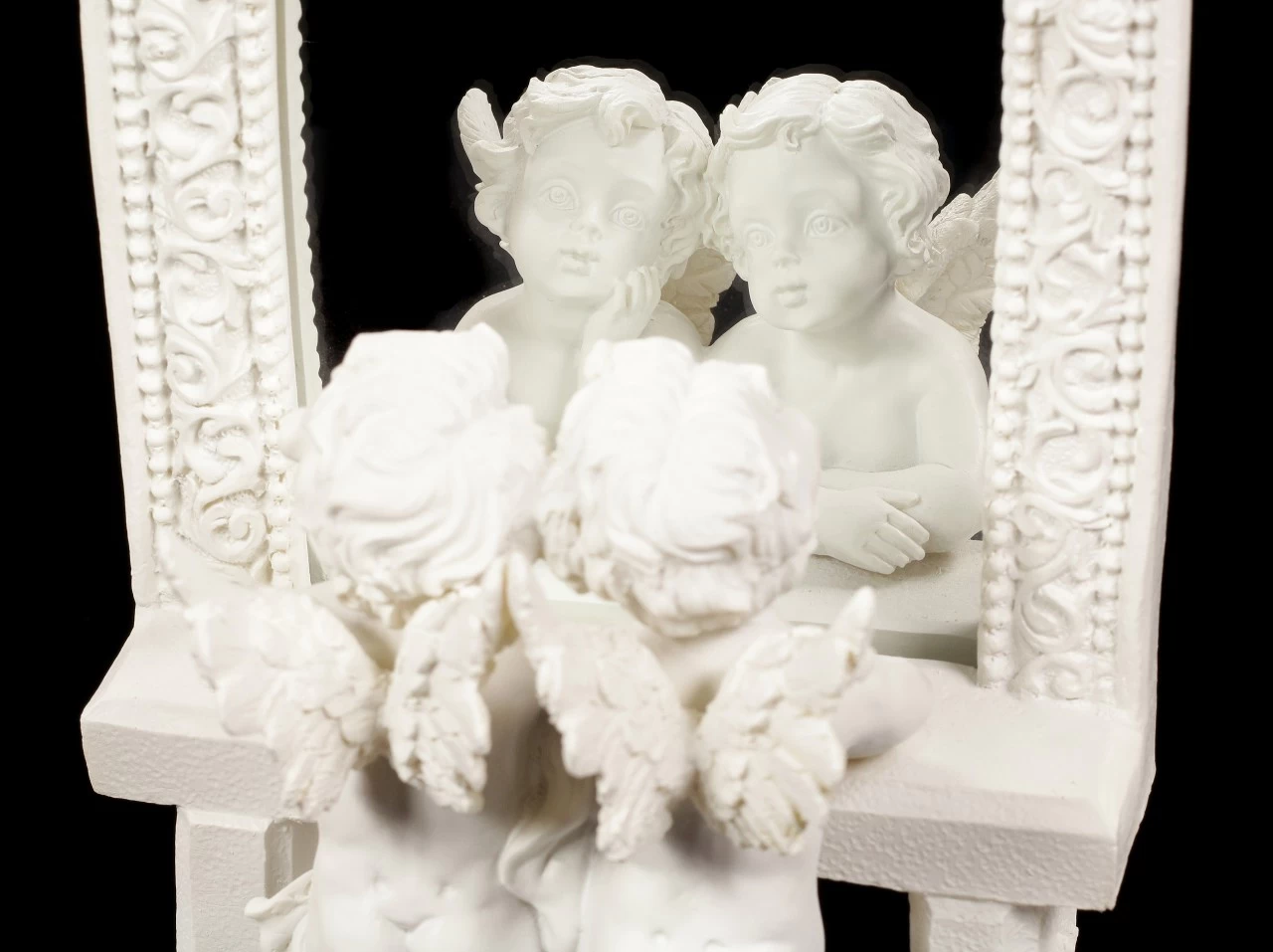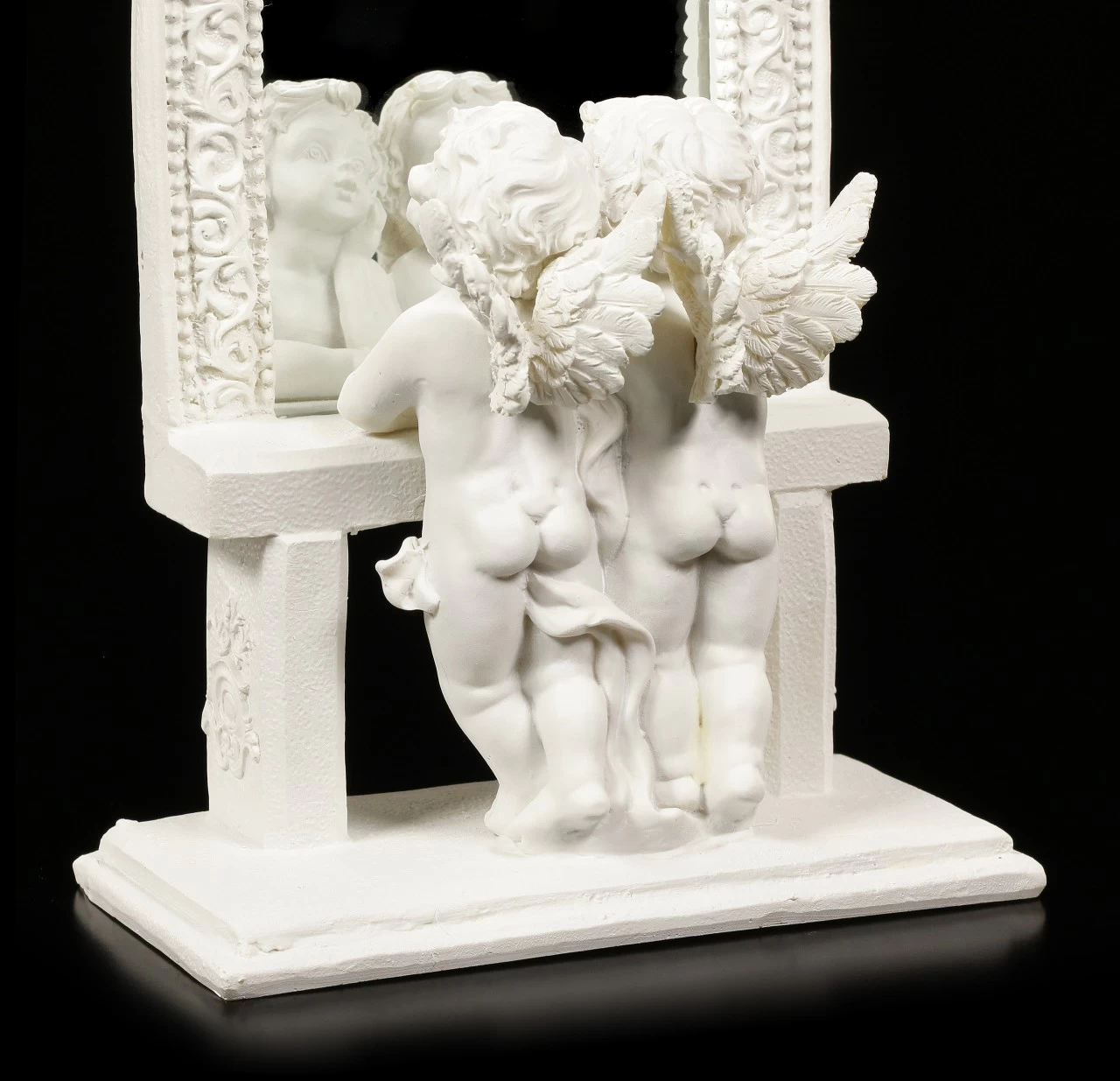 Dieser kleine Tischspiegel ist eine wundervolle Ergänzung für Ihre Engel Sammlung. Die beiden kleinen Putten stehen vor dem Spiegel und können so einen Blick in unsere Welt werfen.
