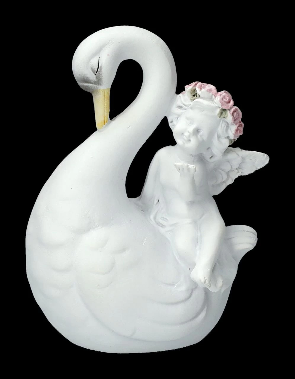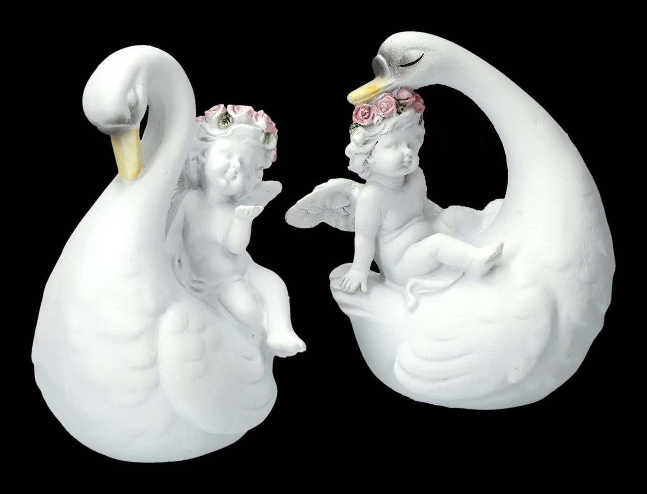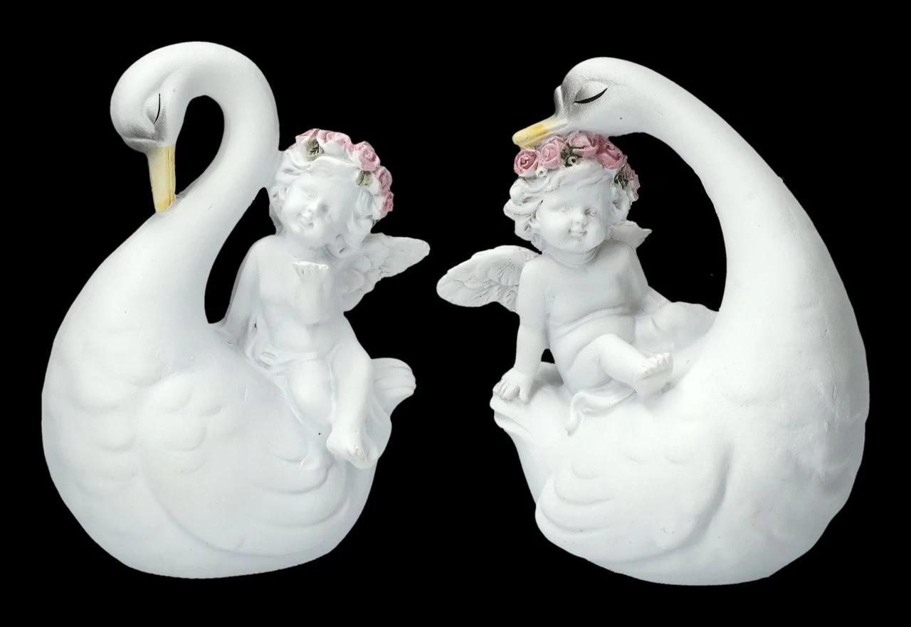 Am liebsten würden sie hoch oben auf einer Hochzeitstorte in der wolkenhaft weißen weichen Sahne sitzen und da passen sie wirklich auch hin – die schönen verliebten Schwäne mit den süßen Putten. Gemeinsam mit einer großen Engelschar sind die kleinen Putten mit den Schwänen gut in unserem Shop gelandet. Sie wurden aus liebevoll handbemaltem Kunststein (Polyresin) gefertigt und sind je 10 cm hoch, 7,5 – 8,5 cm breit und je 5,5 cm tief. Auf jedem Hochzeitstisch ist dieses niedliche 2-er Set eine tolle Deko, es ist aber auch ein vielsagendes Geschenk für einen ganz besonderen Engel.