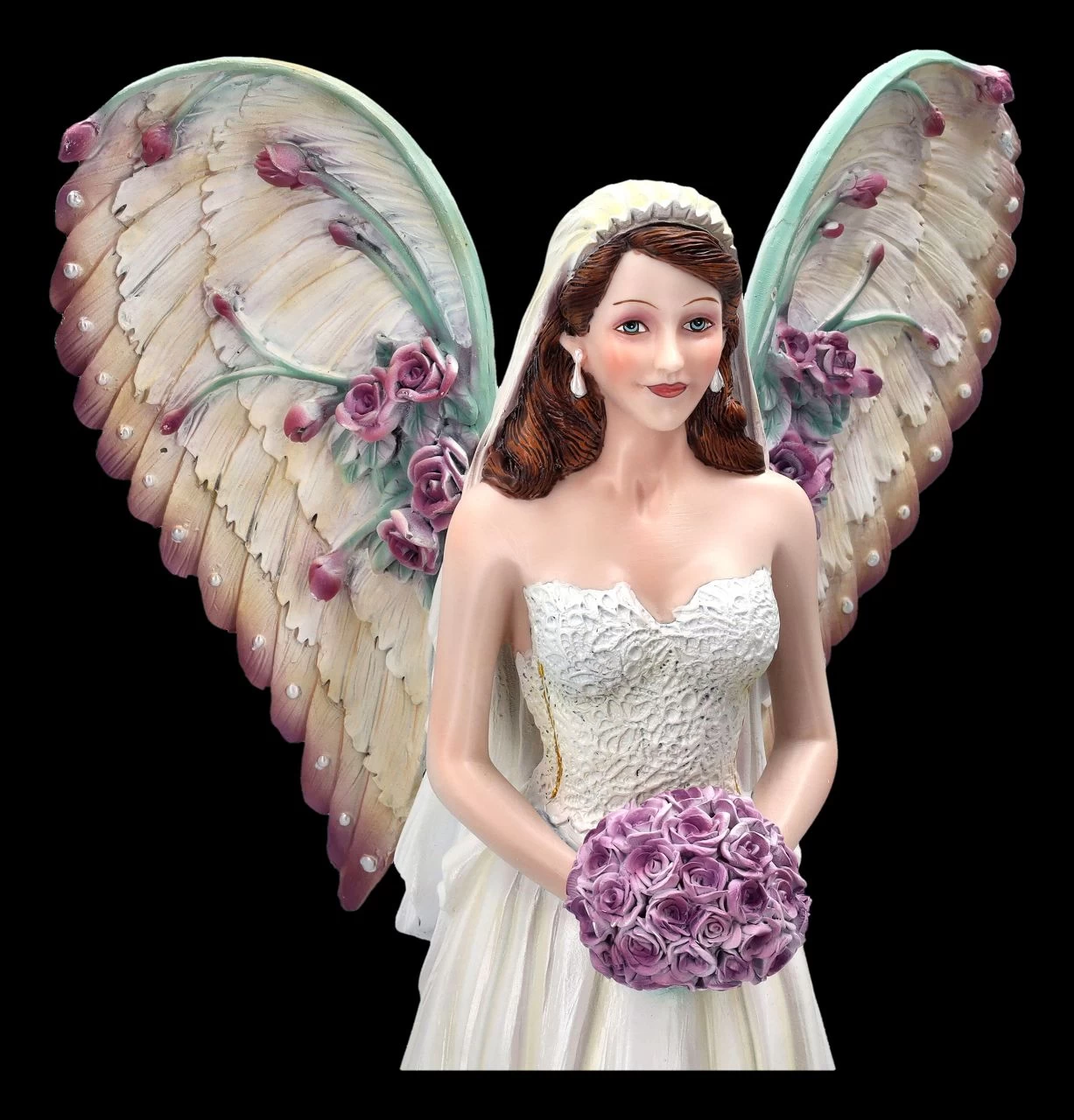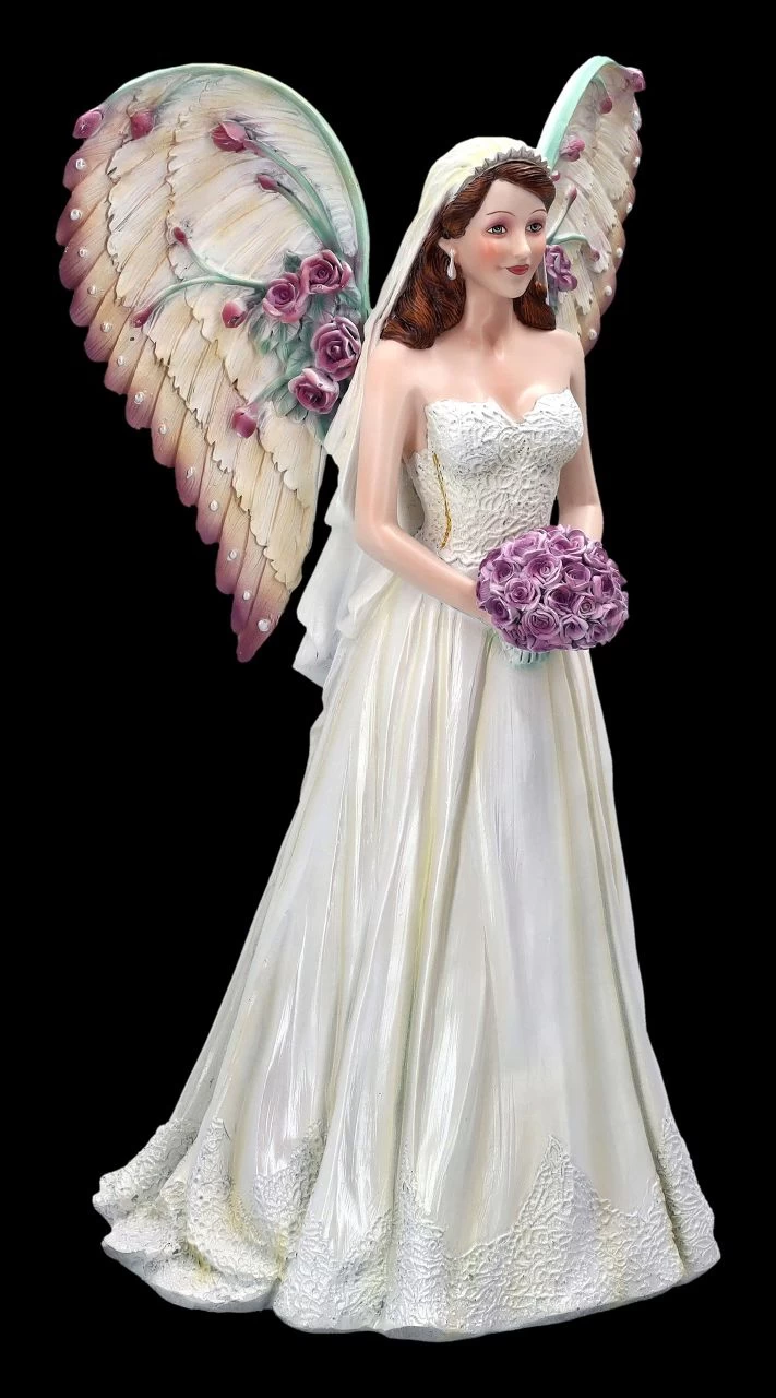 Was gibt es Schöneres, als zur Hochzeit einen Engel geschenkt zu bekommen. Möge der Engel der Liebe und Freude als Schutzengel über das gemeinsame Leben wachen. Im langen Hochzeitskleid, einen Brautstrauß mit rosa Rosen in der Hand, die wunderschönen Flügel mit Blüten bestreut, wurde der zauberhafte Engel detailreich aus Kunststein (Polyresin) gefertigt und liebevoll von Hand bemalt. Mit der Höhe von 37 cm, der Breite von 20 cm und der Tiefe von 20 cm wird dieser bezaubernde Engel auf der Hochzeitstafel sicher alle Blicke auf sich ziehen. Als persönlicher Schutzengel ist diese beeindruckende und wunderschöne Engelfigur mit dem Blumenstrauß ein perfektes Geschenk zur Hochzeit. Die zum Kleid passenden und mit Blüten verzierten Flügel sind zum Stecken.