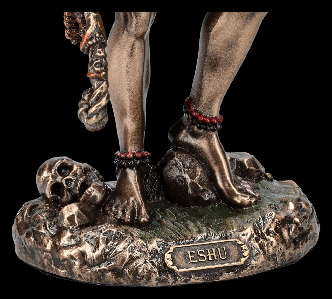 Wunderbar ästhetisch dargestellt ist diese athletische Eshu Figur des Yoruba Gottes, der einer der Hauptgötter des großen Volkes der Yoruba ist. Eshu wird als sogenannter ‚Trickster-Gott‘ bezeichnet, der Gutes, aber auch Böses bewirken kann. Daher sollte man sich gut mit ihm stellen. Viele Details zeichnen diese herrliche Figur aus der Studio Collection von Veronese aus. Die 21,5 cm hohe, 10 cm breite und 8 cm tiefe Skulptur aus hochwertigem Kunstsein (Polyresin) ist edel bronziert und sehr schön und zurückhaltend coloriert. Die Eshu-Figur des Yoruba Gottes ist nicht nur ein ganz besonderes Geschenk, sie ist in ihrer Darstellung auch sehr dekorativ und wird mit Sicherheit überall zum sofortigen Blickfang.