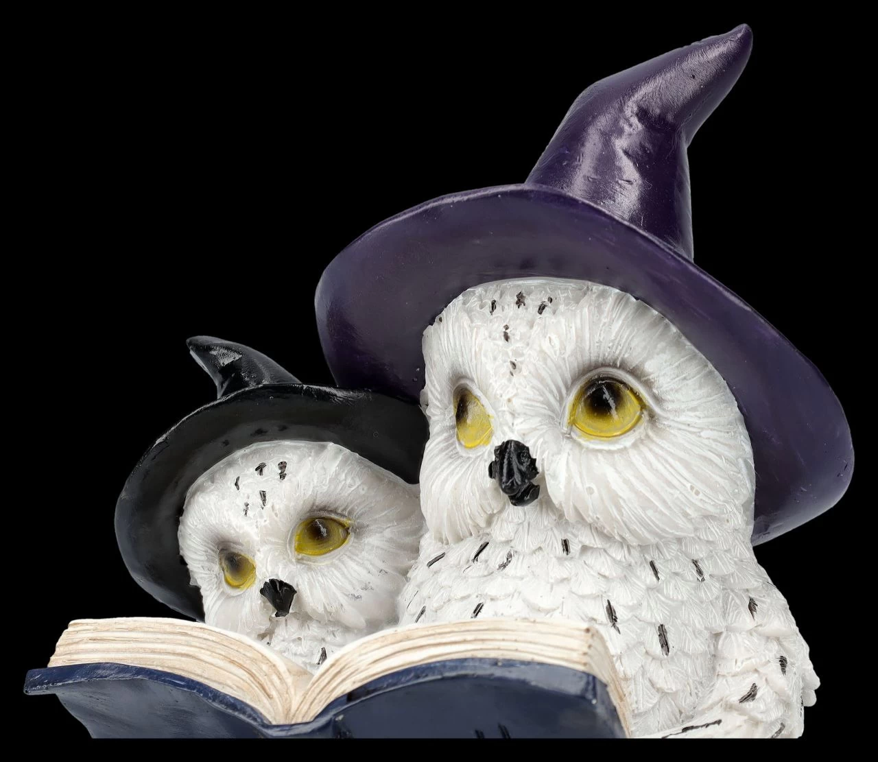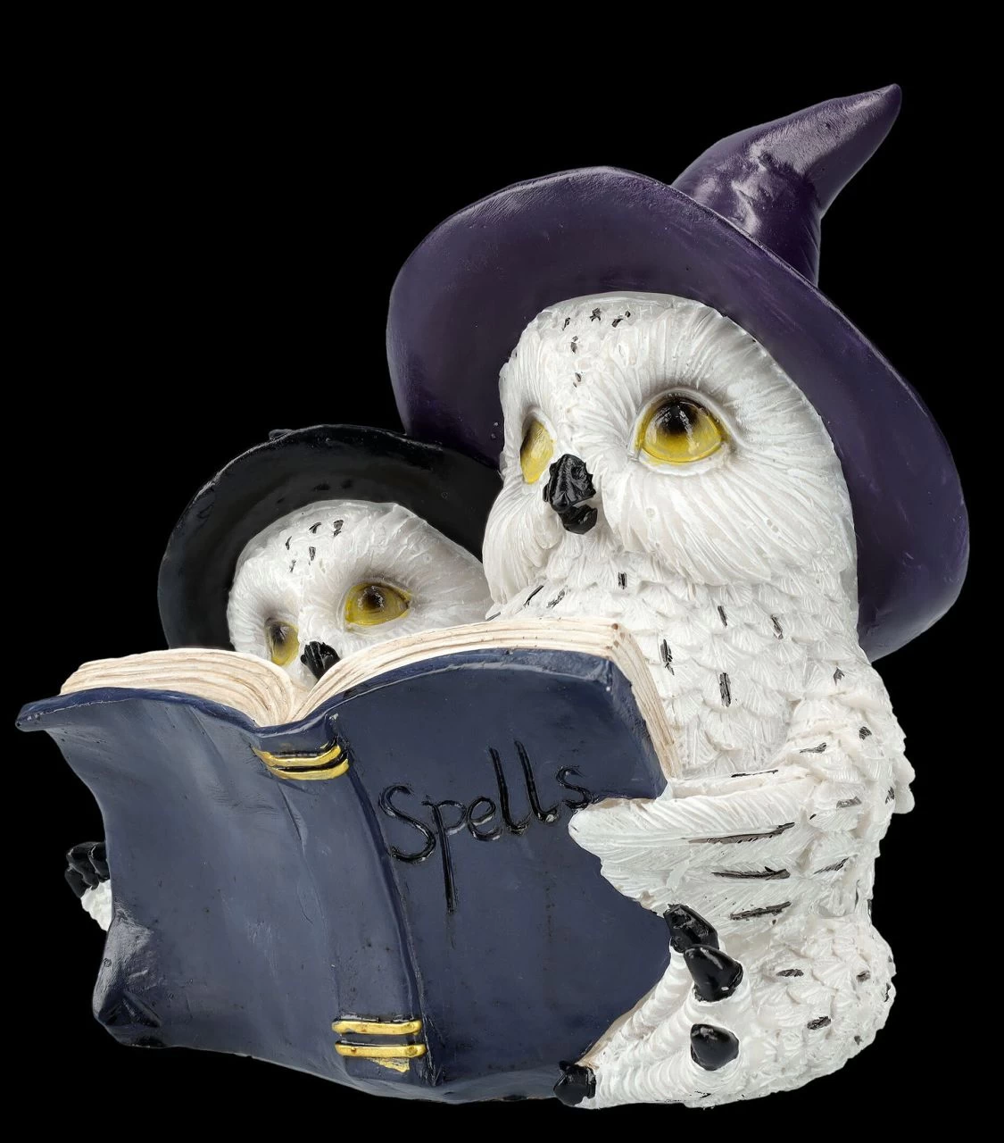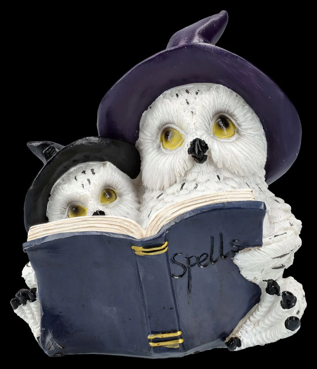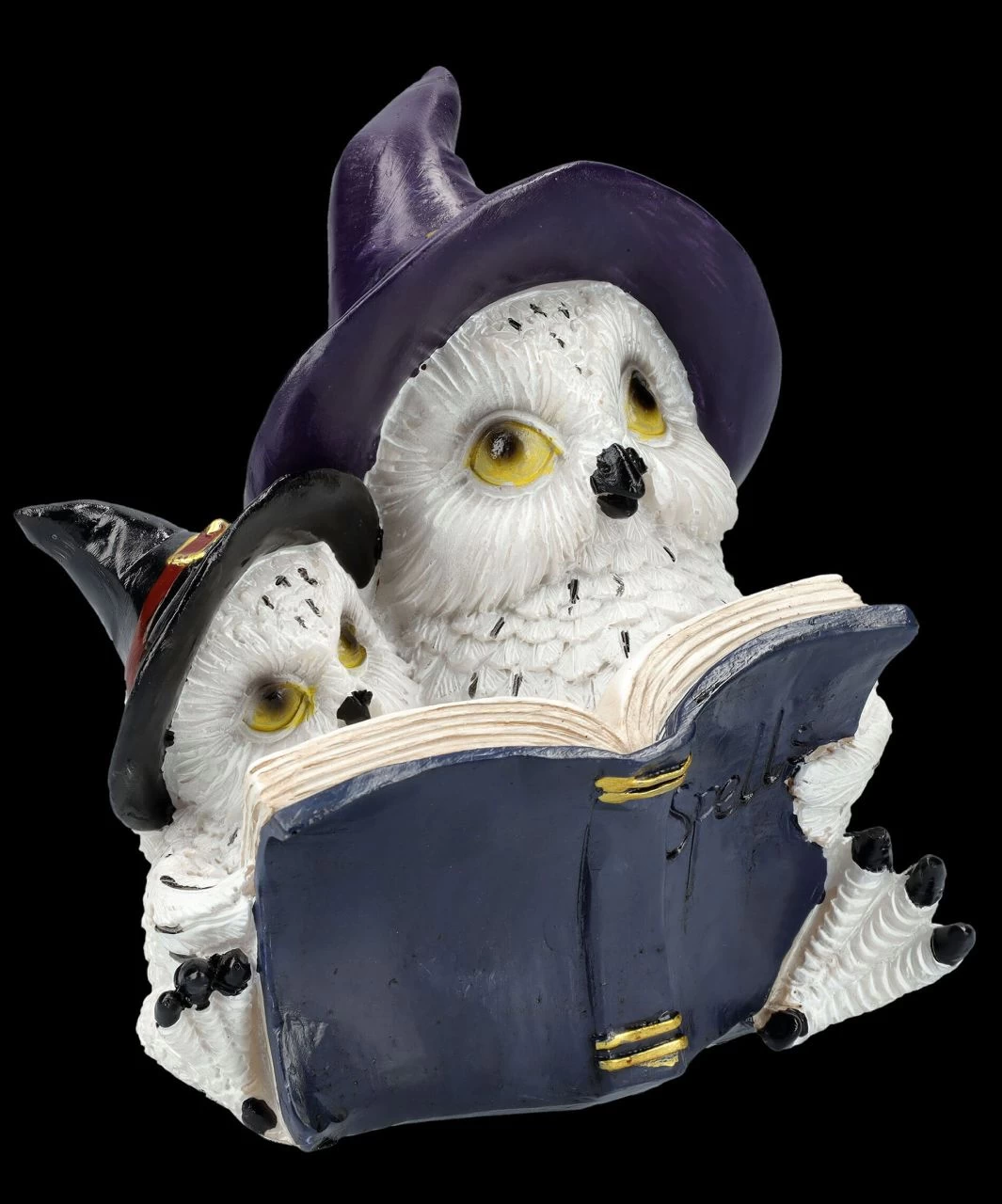 Mama Eule und ihr Kleines schauen etwas erschrocken nach oben. Was war das für ein seltsames Geräusch, das sie gerade gehört hatten. Ja ja, das kommt davon, wenn man spät abends ausgerechnet aus dem Zauberbuch eine magische Gute Nacht-Geschichte vorliest…. Selbst wenn man sich – wie die beiden Eulen – die Zauberhüte aufsetzt, kann man sich gruseln. Die lustige Eulen-Figur aus handbemaltem Kunststein (Polyresin) ist 12,5 cm hoch, 11,5 cm breit und 9,5 cm tief. Sie ist zum Beispiel eine perfekte Deko in einem Bücherregal und damit auch ein witziges Geschenk für Leseratten.