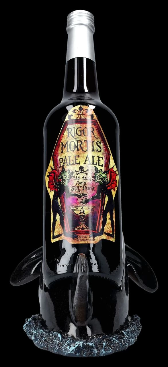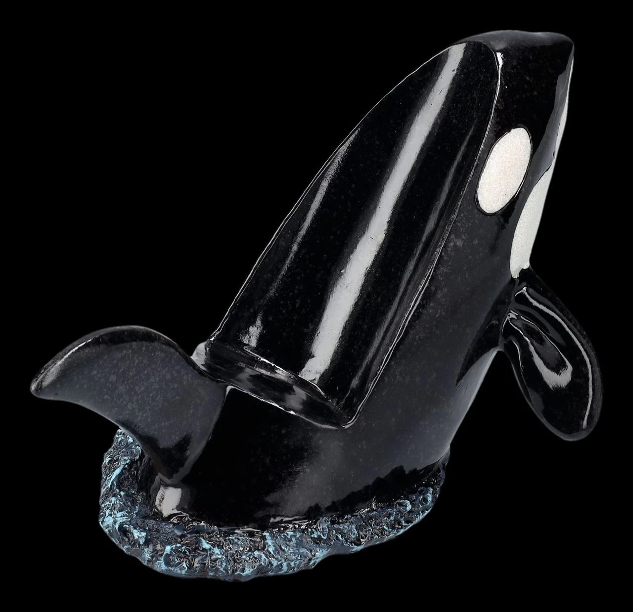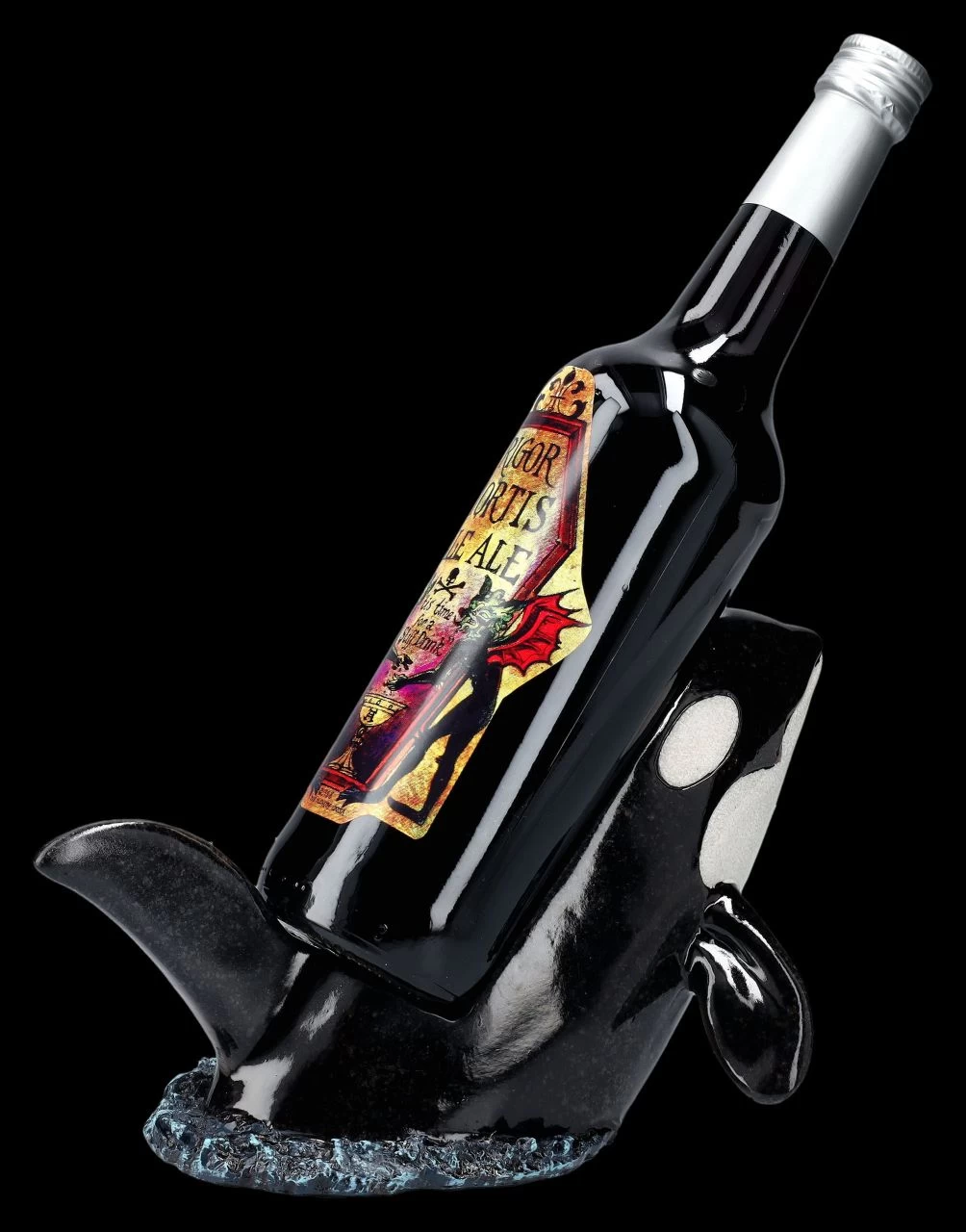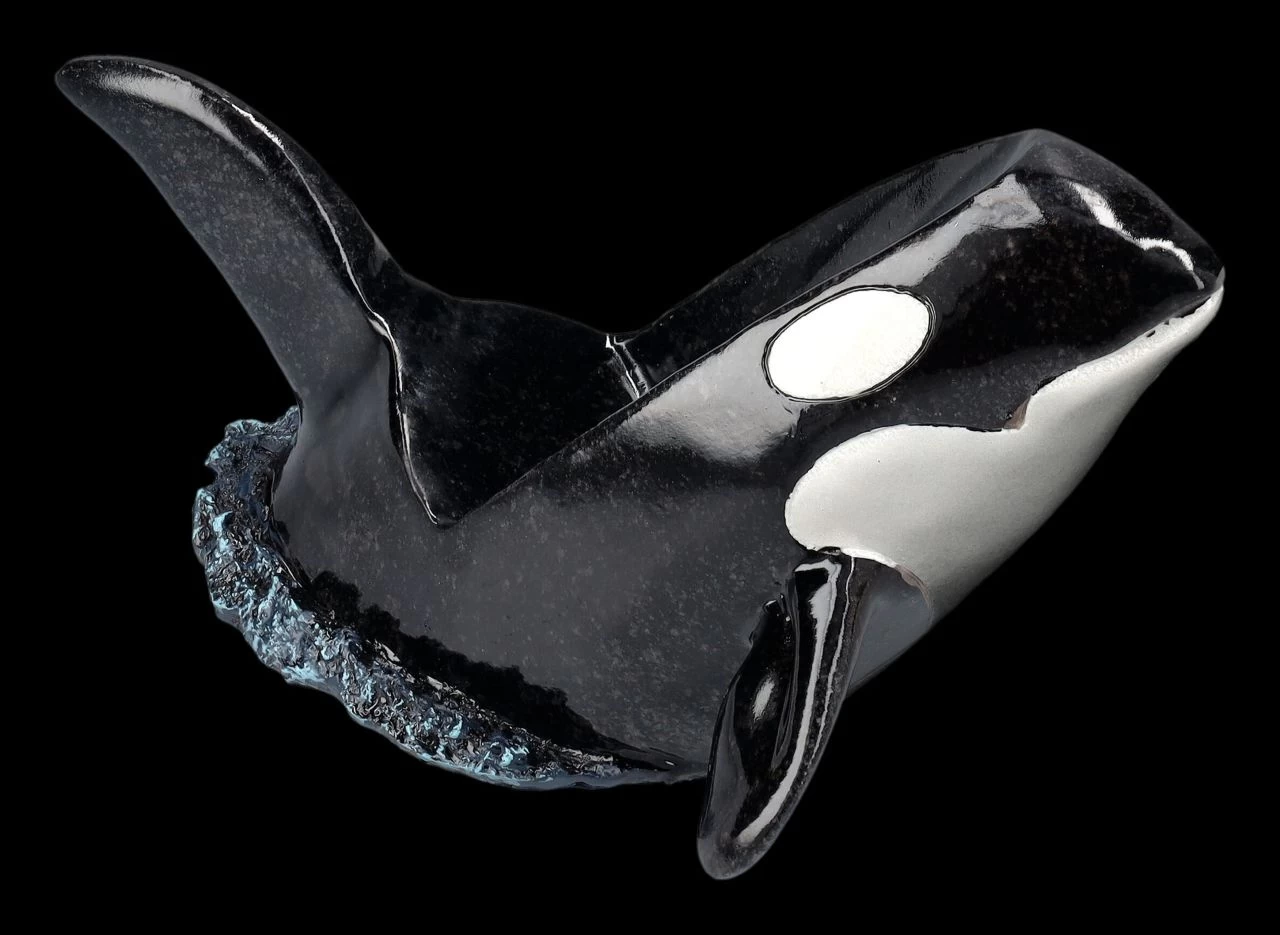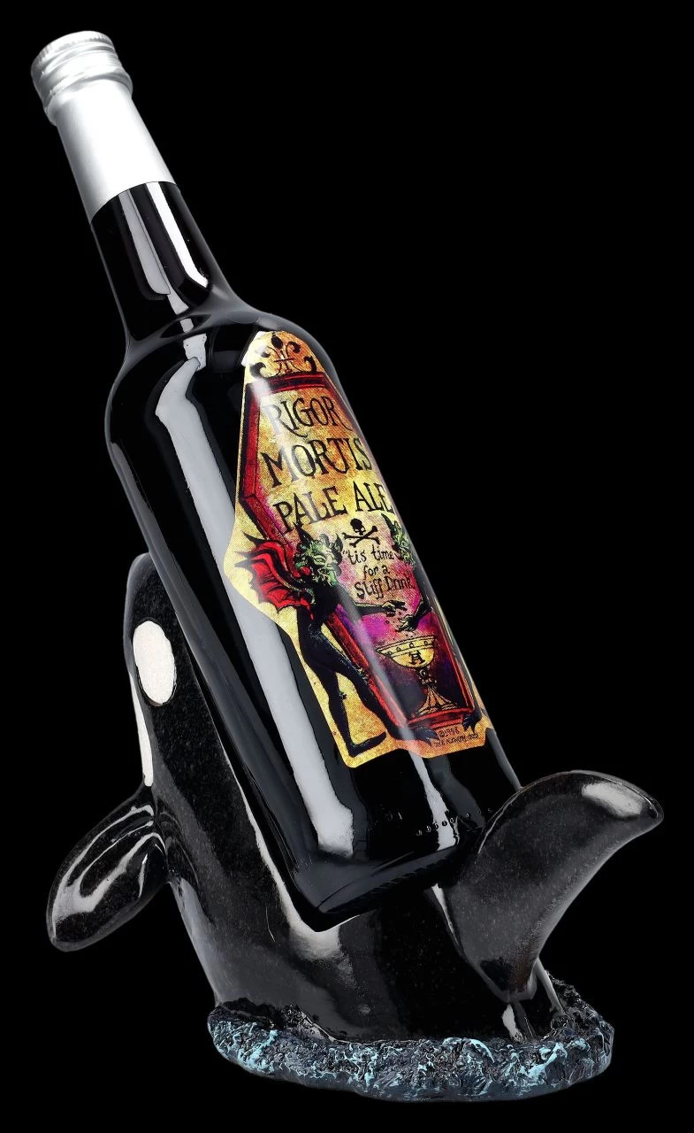 Keine Bange – wenn Orcas auch als Killerwal bezeichnet werden, sie ernähren sich ausschließlich von Fisch. Flaschen gehören normalerweise nicht dazu, außer es wird versehentlich eine Flaschenpost verschluckt, was den Orcas aber sicherlich nicht behagt. Dieser 15 cm hohe, 25 cm breite und 15 cm tiefe Orca aus hochwertigem handbemaltem Kunststein (Polyresin) hat das aber garantiert nicht vor. Im Gegenteil, er wird Flaschen mit einem Durchmesser bis ca. 7,5 cm perfekt halten. Dieser faszinierende Flaschenhalter wird zum dekorativen Blickfang auf dem Esstisch oder auch in der Bar. Er ist aber auch – vielleicht gleich mit dem passenden Getränk – ein fantasievolles Geschenk. Die Flasche aus unserer Dekoration ist nicht in der Lieferung enthalten.