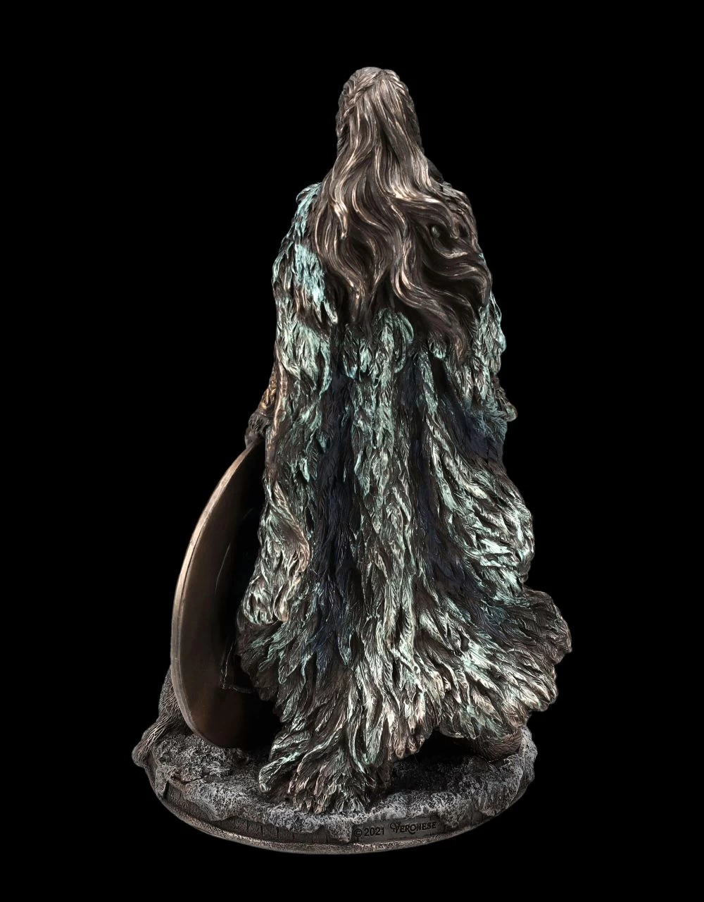 Freya, die Wanengöttin der Liebe und der Ehe gilt in der nordgermanischen Mythologie auch als Göttin des Frühlings, der Fruchtbarkeit, des Glücks und der Liebe. Als Anführerin der Walküren wurde sie auch als Kämpferin bezeichnet. Und als mutige Kämpferin und Schildmaid wird die Göttin bei dieser fantastischen Figur von Veronese auch dargestellt. Mit dem Schwert und dem Schild in den Händen und angetan mit ihrem Falkenumhang steht die schöne Göttin Freya aufrecht und stolz da. Begleitet wird sie von den Waldkatzen, die ihren Wagen gezogen hatten. Die fantastisch detailreiche Skulptur der Göttin Freya ist 21 cm hoch, 12 cm breit und 11,5 cm tief. Sie wurde aus edel bronziertem und zurückhaltend coloriertem Kunststein (Polyresin) gefertigt. Die schöne Skulptur der germanischen Göttin Freya ist für alle Anhänger der nordischen Mythologie auch ein wunderbares Geschenk.