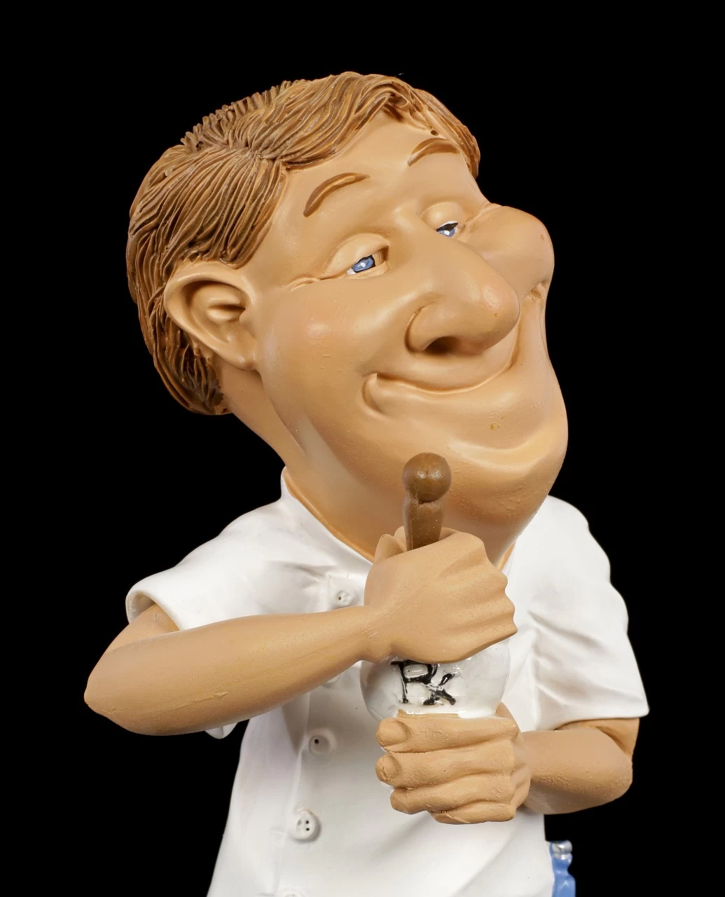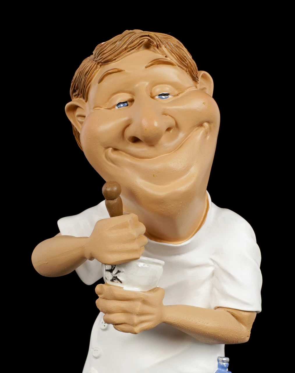 Grinsend zerreibt der Apotheker Medikamente mit einem Tablettenmörser. Er liebt sichtlich seine Arbeit. Der Apotheker von Funny Jobs wurde im lustigen Karikatur Jobs gehalten und begeistert durch die liebevolle Ausarbeitung aus handbemaltem Kunststein (Polyresin).