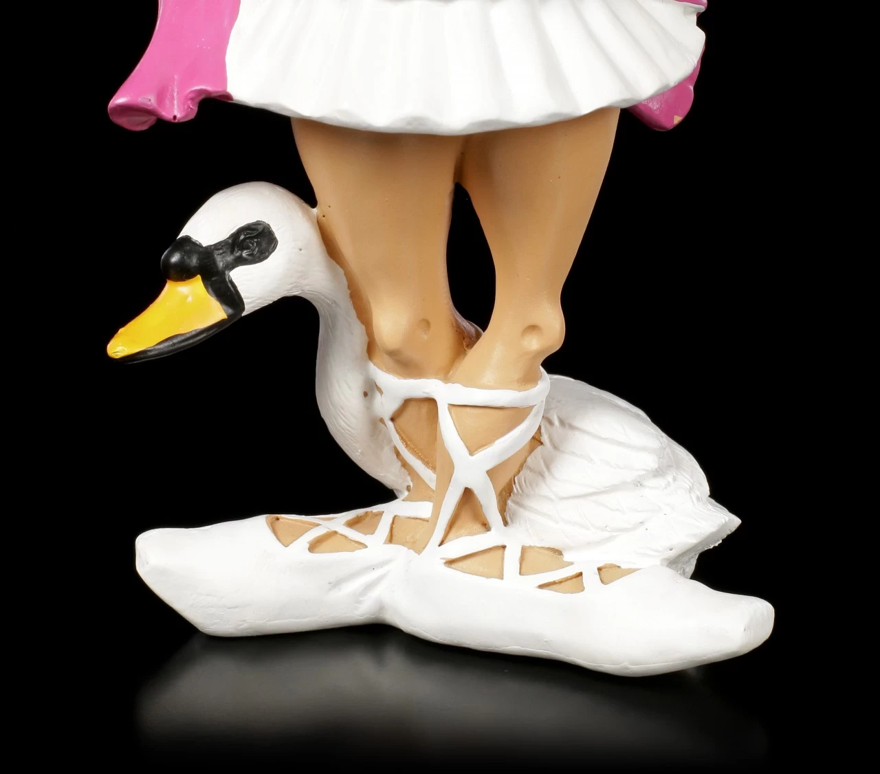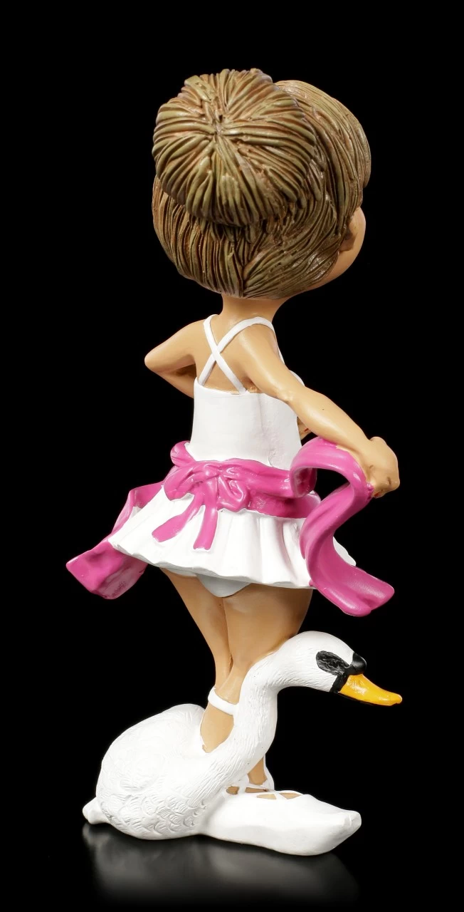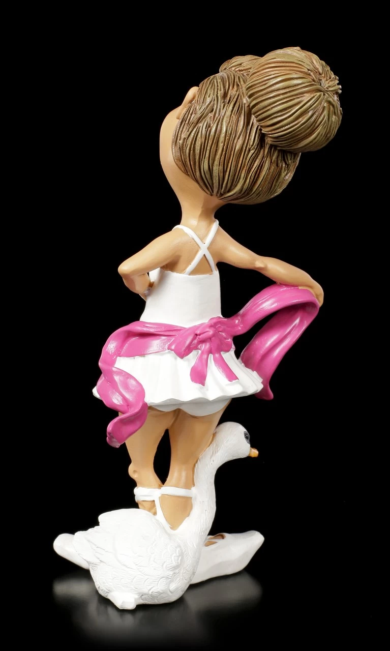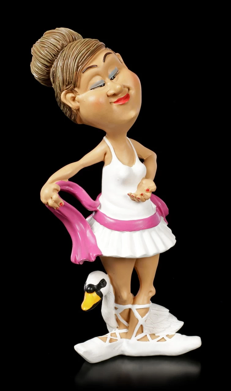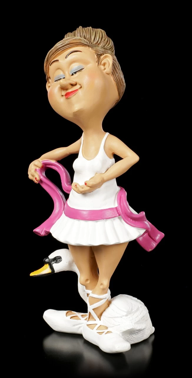 Die Ballett Tänzenerin übt mit sicheren und anmutigen Bewegungen immr wieder Ballettschritte aus Schwanensee. Als Maskottchen hat sie daher stets ihren weißen Schwan dabei. Das weiße Ballettkostüm erinnert selbst an einen eleganten Schwan. Die lustige Funny Job Figur aus Kunststein (Polyresin) ist im berühmten Karikatur Stil gehalten und liebevoll handbemalt.