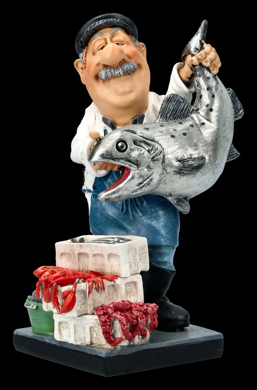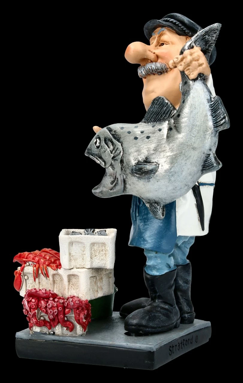 Frischer Fisch gefällig?.Stolz präsentiert der Fischhändler seine Ware. Die lustige Funny Job Figur von Warren Stratford ist 16,5 cm hoch, 11,5 cm breit und 9 cm tief und bis zu den Einzelheiten, wie dem Marktstand mit den Krebsen, Tintenfisch und Muscheln, sehr detailreich aus handbemaltem Kunststein (Polyresin) gefertigt. Für Fischliebhaber ist der Fischhändler sicher ein witziges Geschenk.