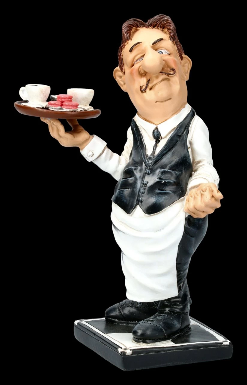 Etwas ratlos schaut der Kellner in die Runde und fragt sich anscheinend, wer jetzt die beiden Kaffees und Macrons bestellt hat. Die lustige Funny Job Figur von Warren Stratford hat eine Höhe von 17 cm, eine Breite von 10 cm und eine Tiefe von 9,5 cm. Die witzige Kellner Figur aus Kunststein (Polyresin) ist detailliert handbemalt und nicht nur für Kellner, sondern auch für Ihr Lieblingscafé sicher ein humorvolles Geschenk.