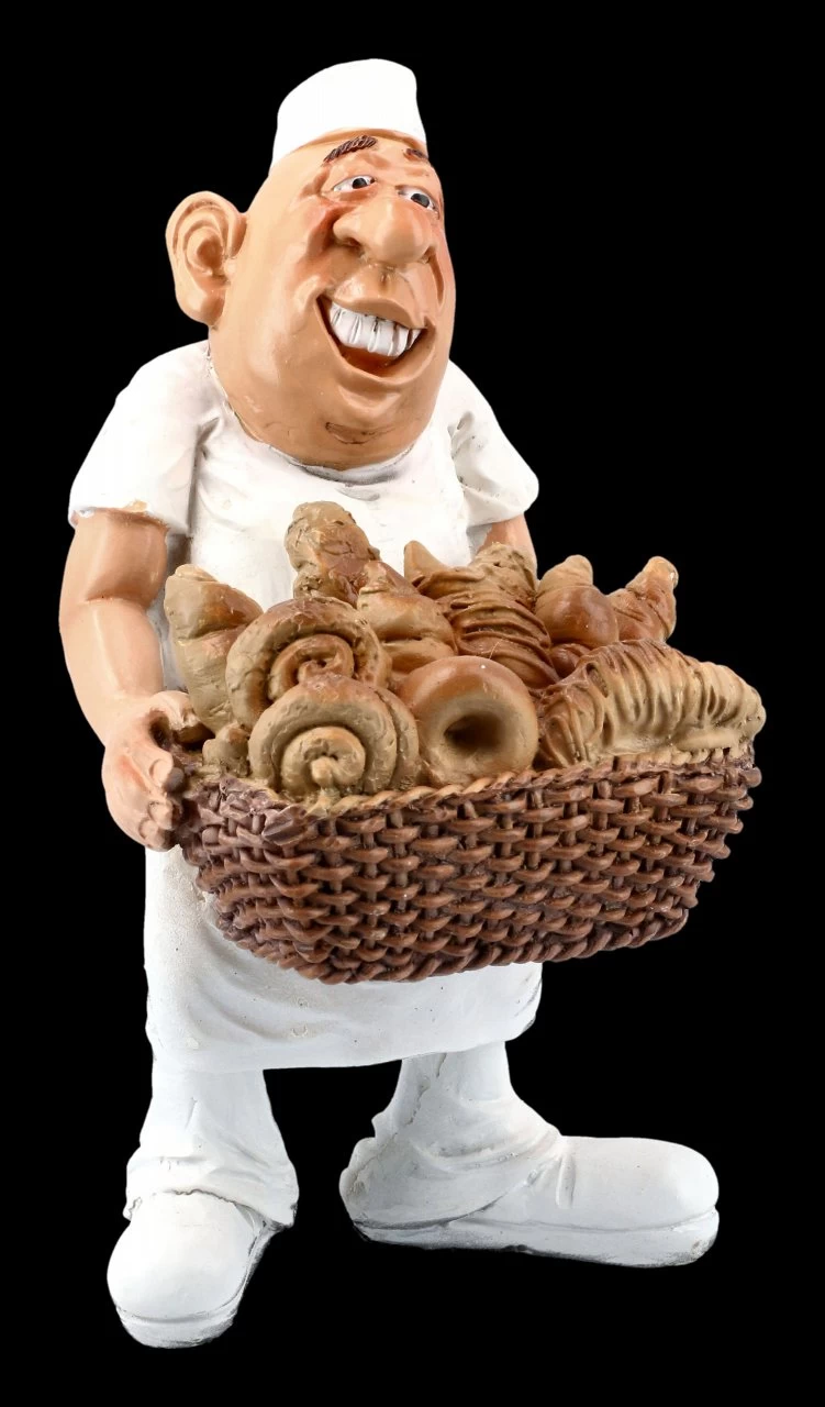Aus der Serie Funny Jobs ist diese witzige Bäcker Figur aus handbemaltem Kunststein (Polyresin).. Morgenstund hat Gold im Mund! Der fleißige Bäcker hat einen lecker duftenden Korb voller Köstlichkeiten dabei. Die lustige Figur ist das perfekte Geschenk für einen fleißigen Bäcker.