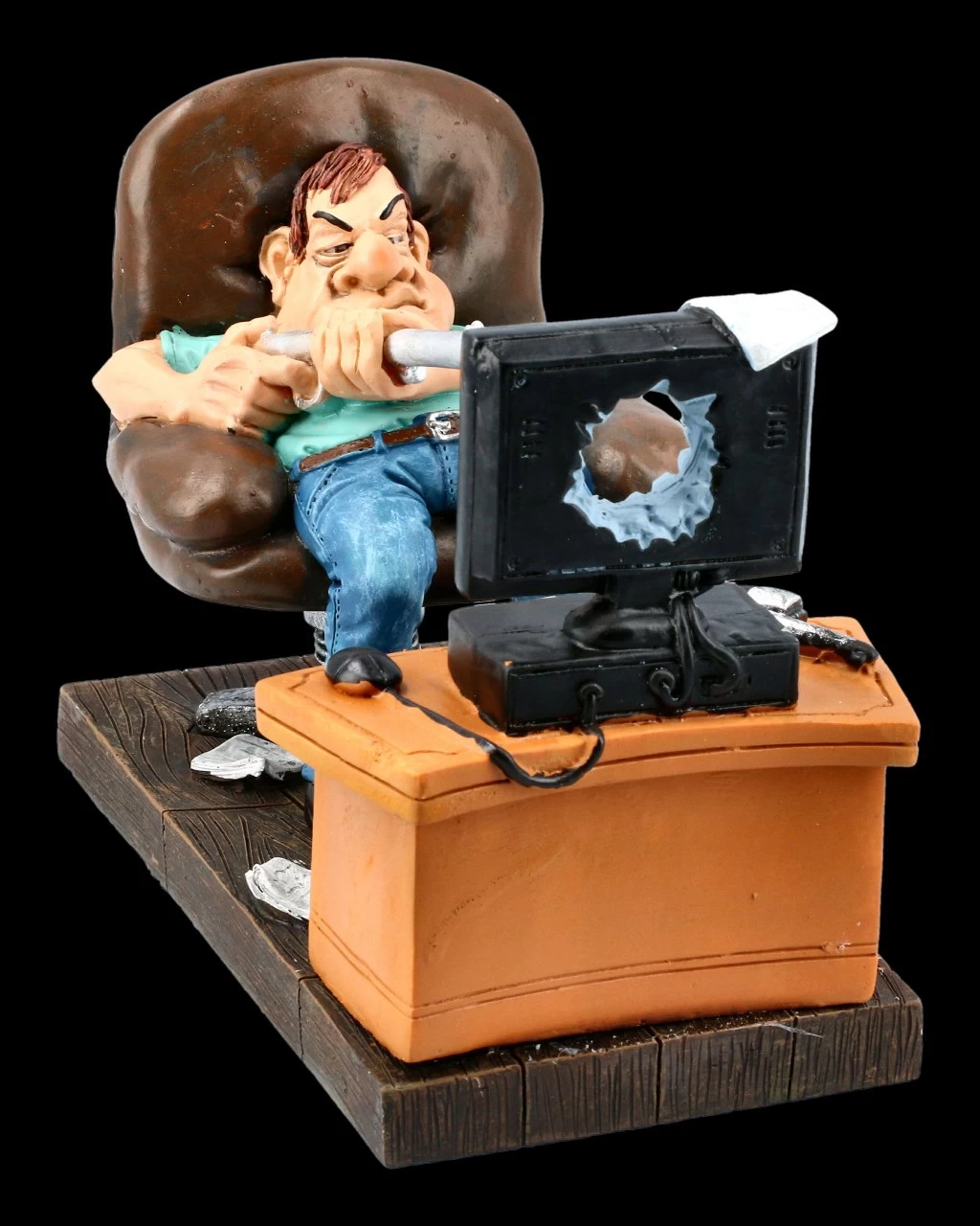 Aus der Serie Funny Jobs ist diese witzige Gamer Figur aus handbemaltem Kunststein (Polyresin). Oh je, wie viel der gute Mann wohl verloren hat beim Zocken? Die Schrotflinte und der zerstörte Monitor sprechen Bände… Die lustige Figur ist das perfekte Geschenk für einen Zocker der es nicht lassen kann.