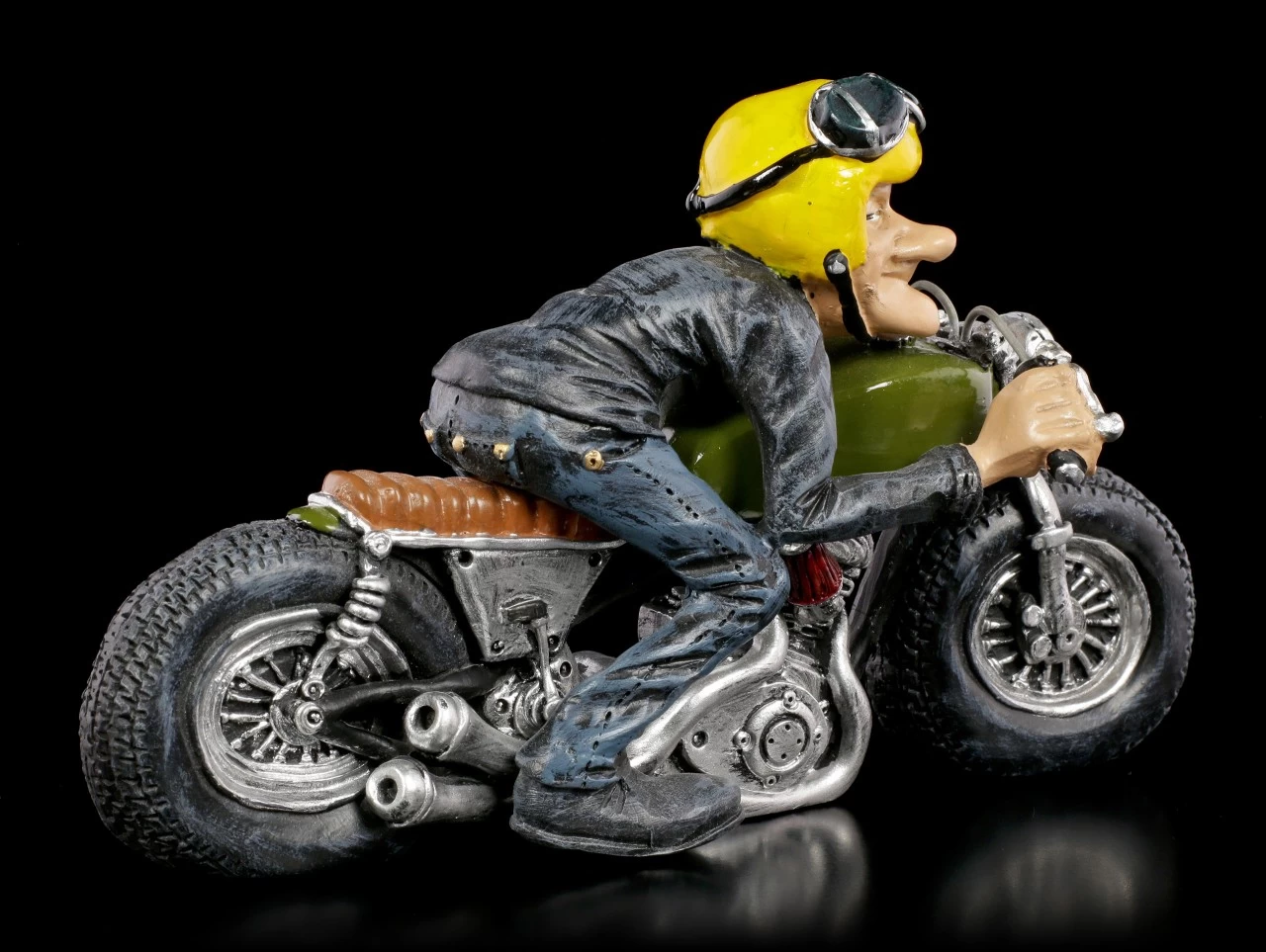 Grinsend genießt der Motorradfahrer den Wind im Gesicht. Er liebt die Geschwindigkeit. Die lustige Funny Job Figur aus handbemaltem Kunststein (Polyresin) im Karikatur Stil ist das perfekte Geschenk für einen Motorfahrradfahrer.